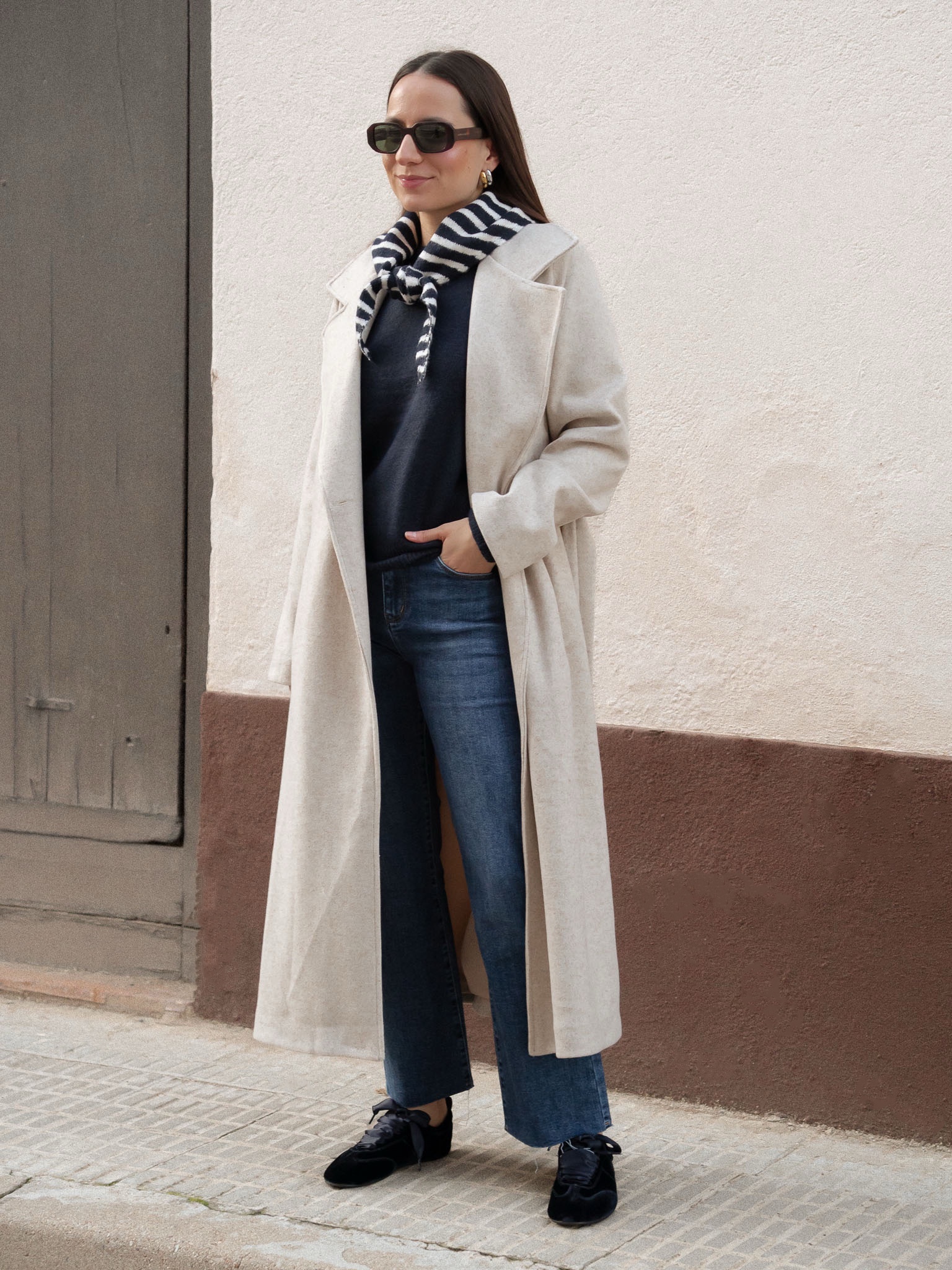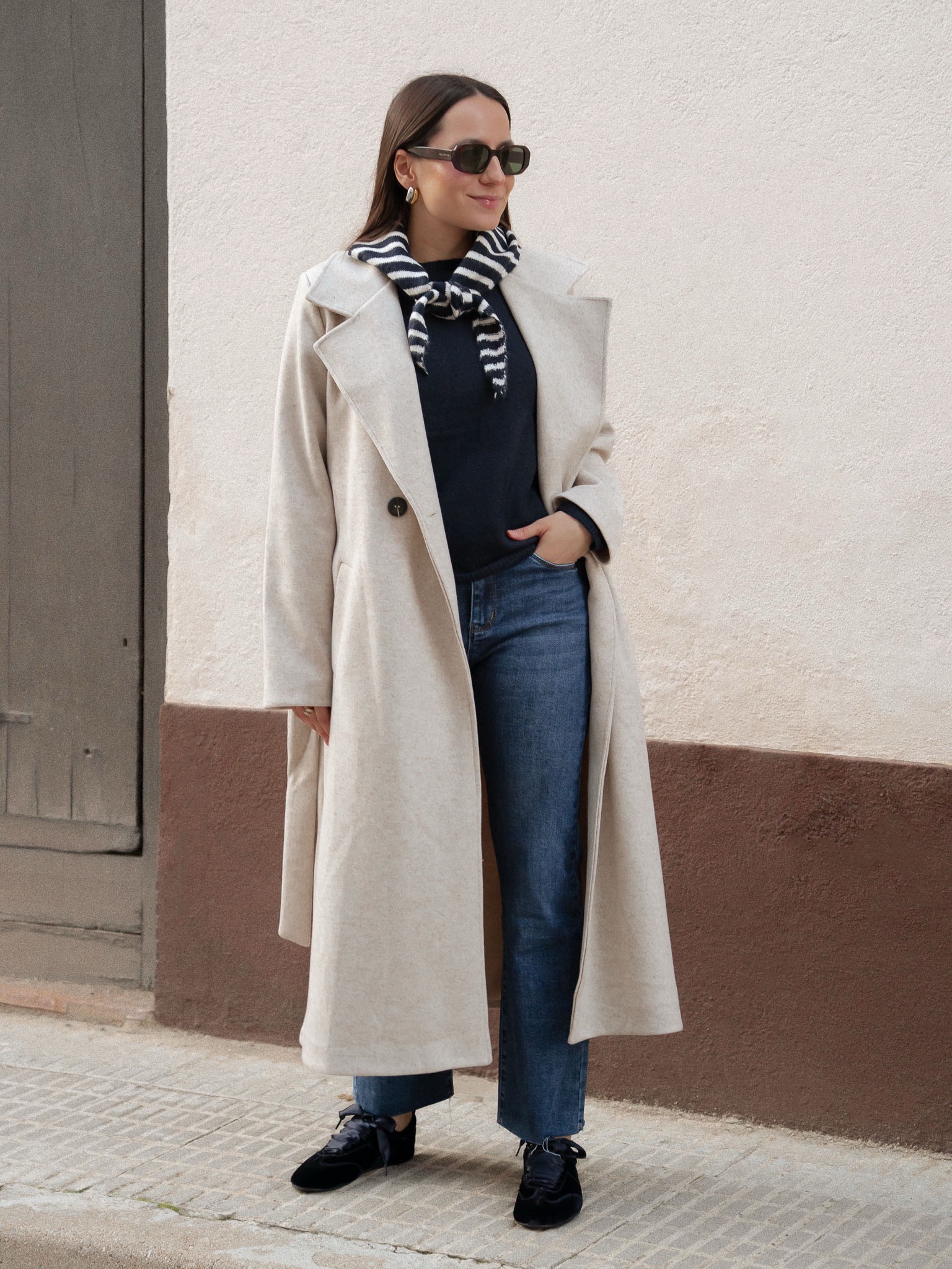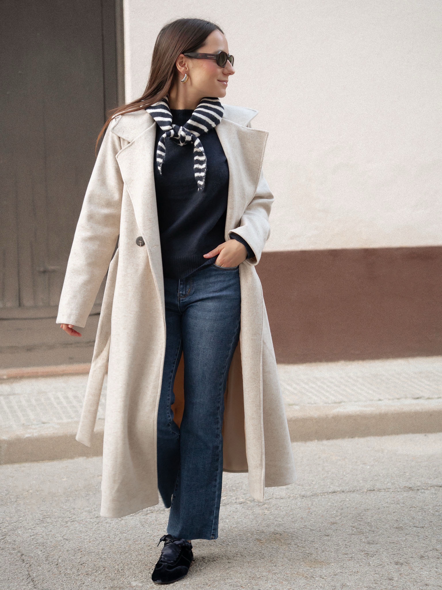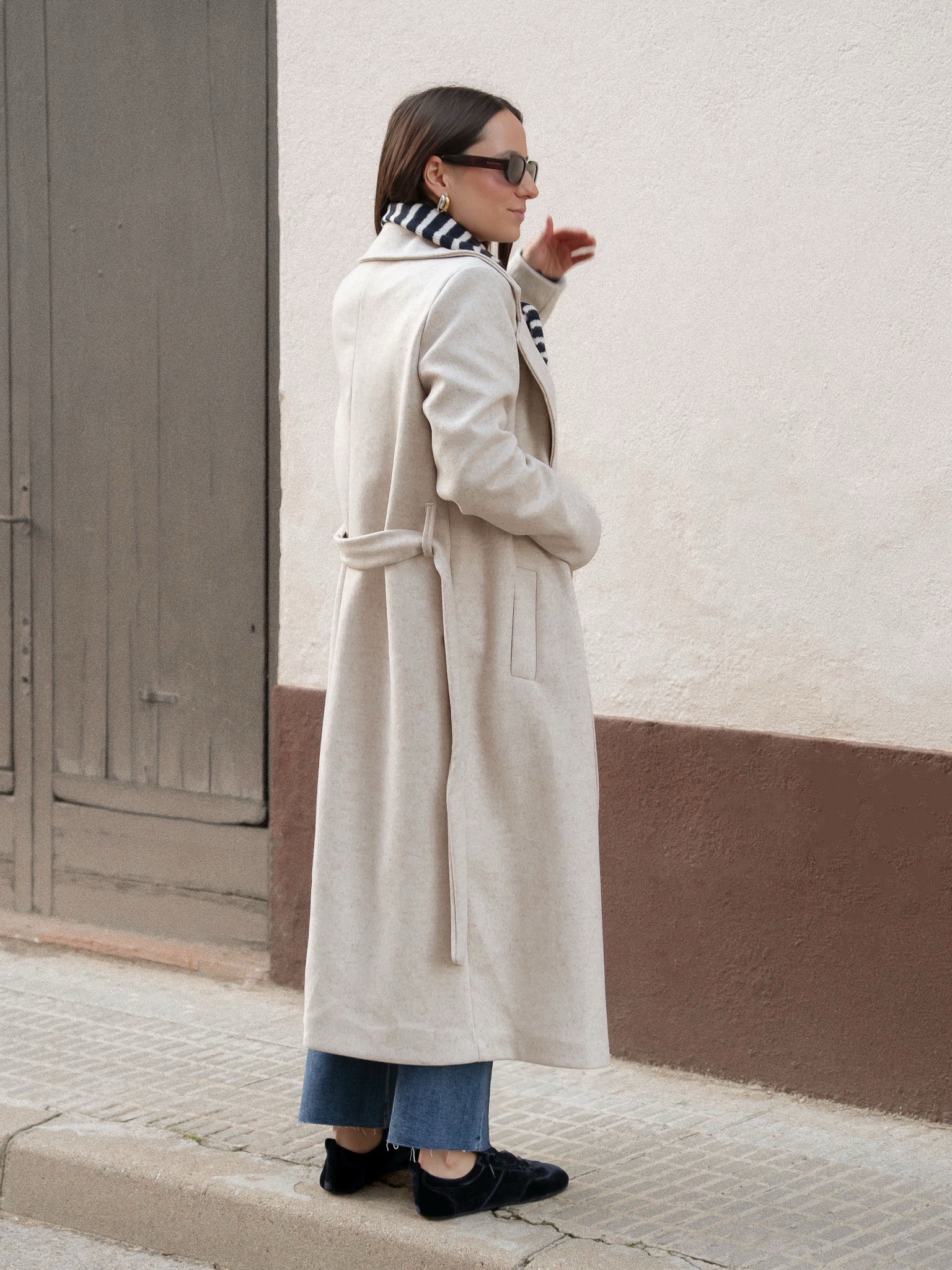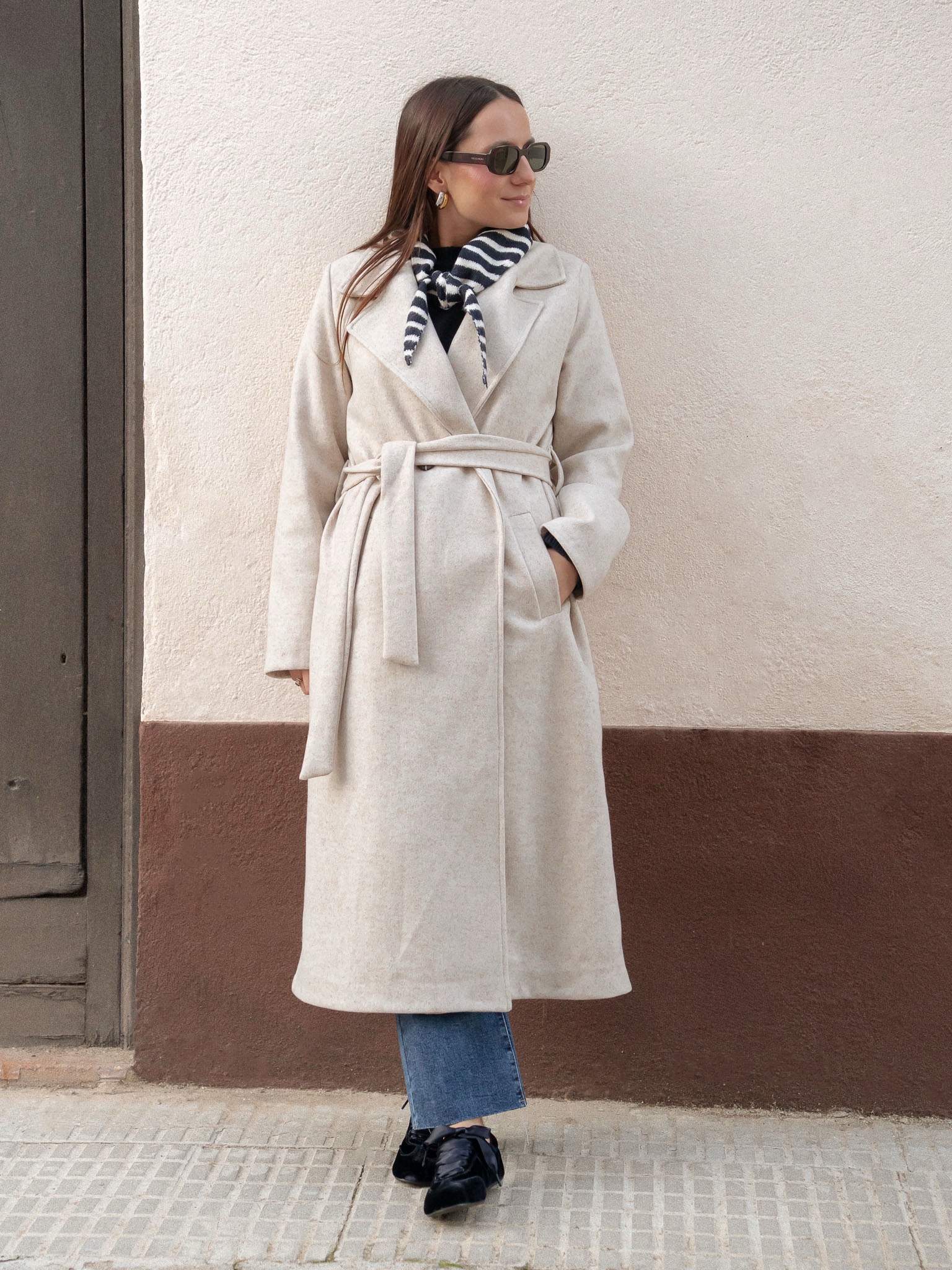Abrigo largo de paño con cuello solapa. Cierre con botones y cinturón del mismo tejido. Forro interior a tono.