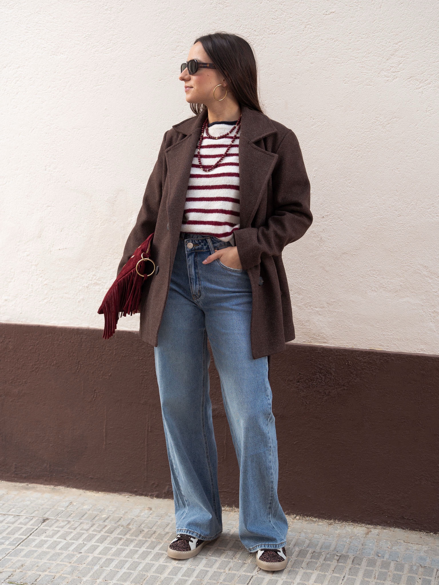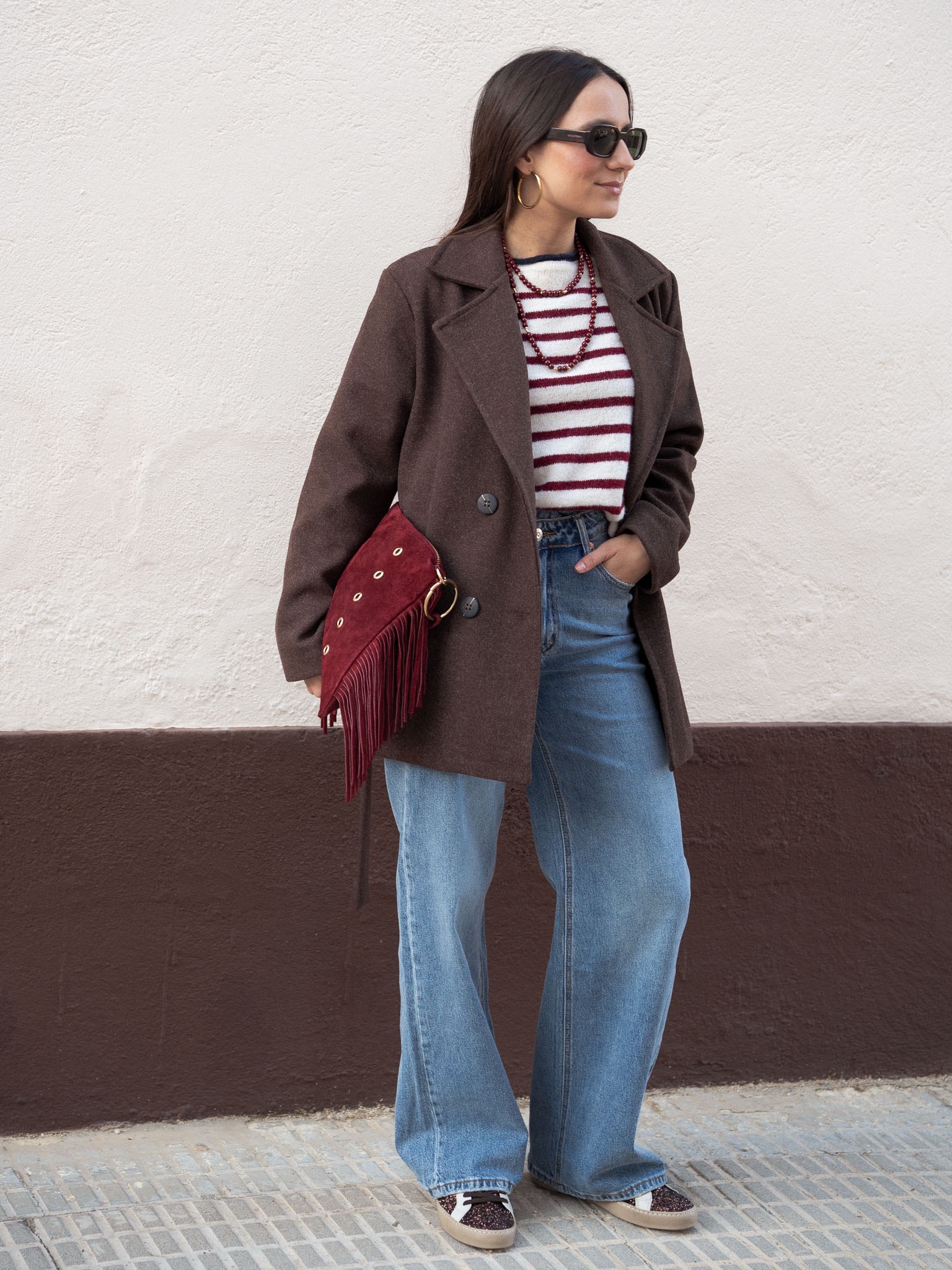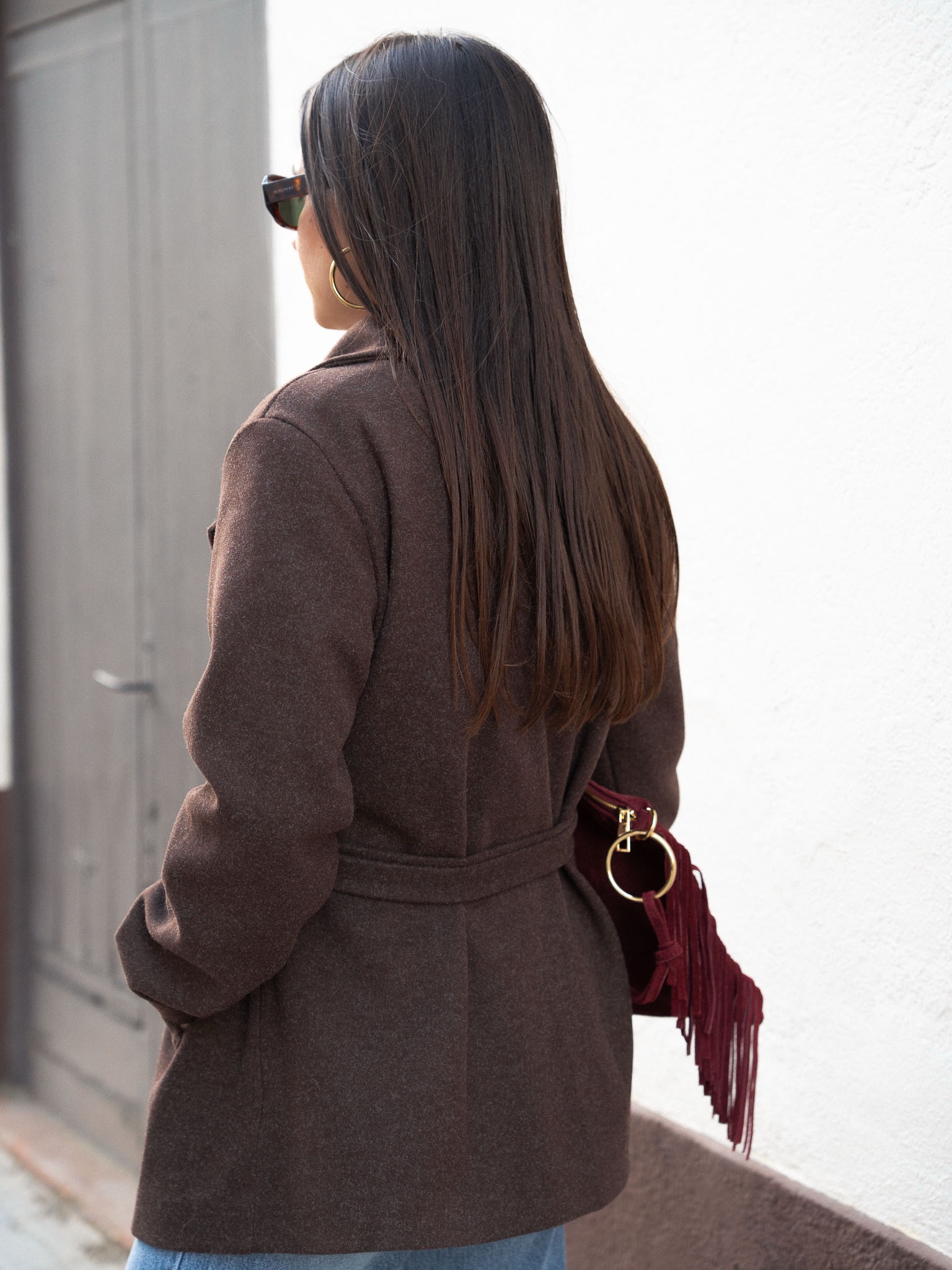 Talla única, da de la S a la XL. Abrigo de paño 3/4. Cuello solapa. Cierre con botones frontales y cinturón del mismo tejido. Forro interior a tono.