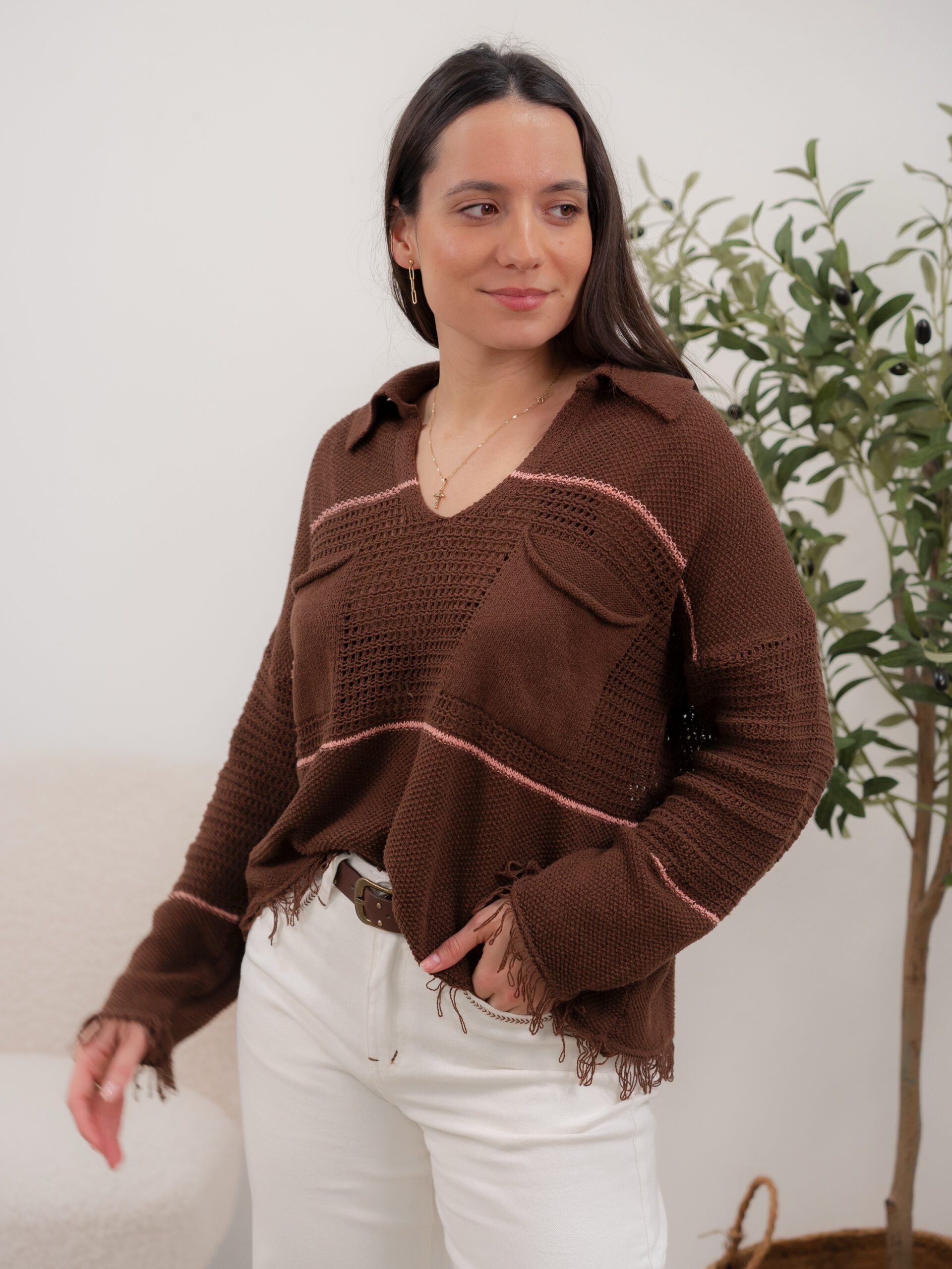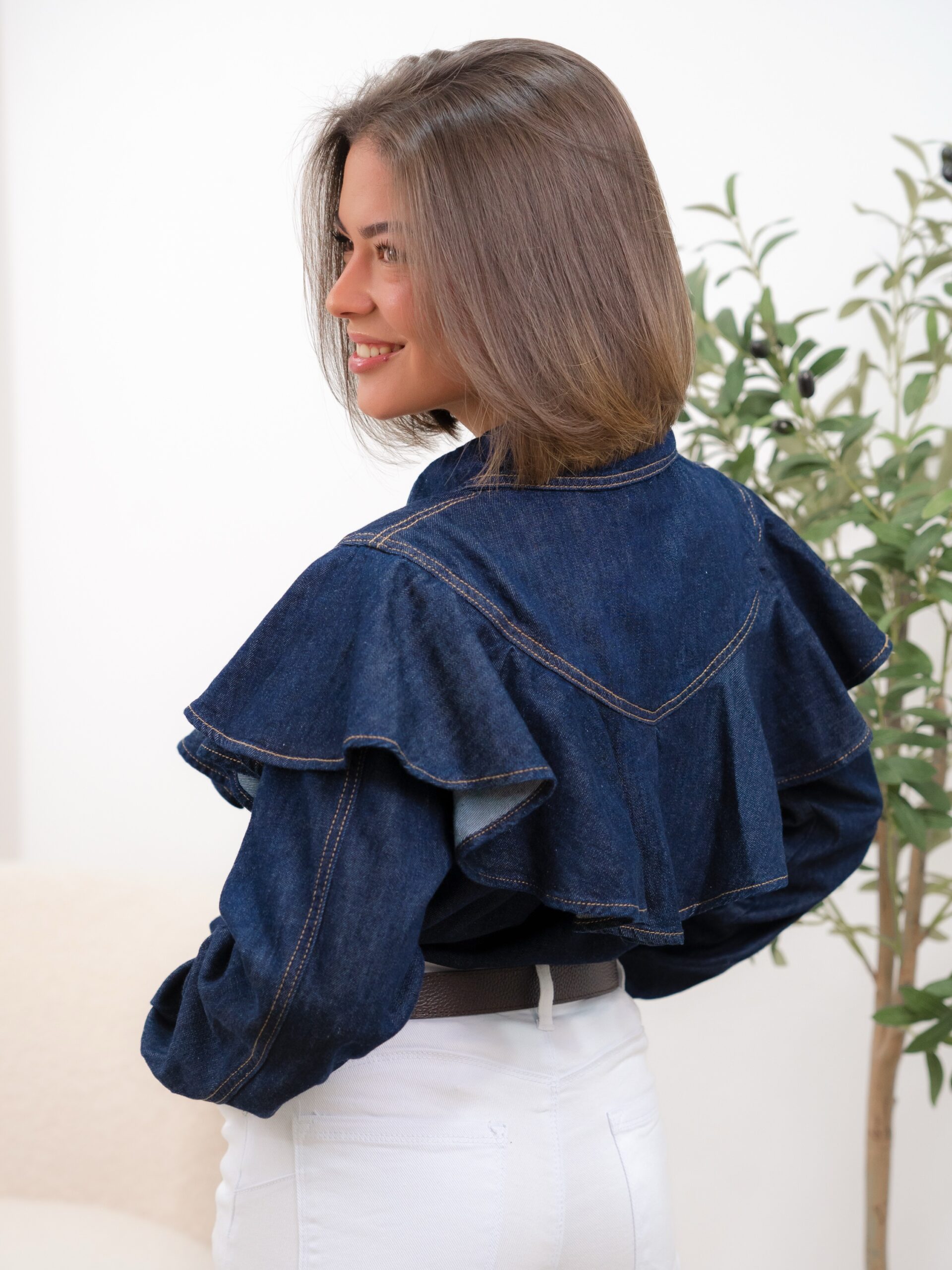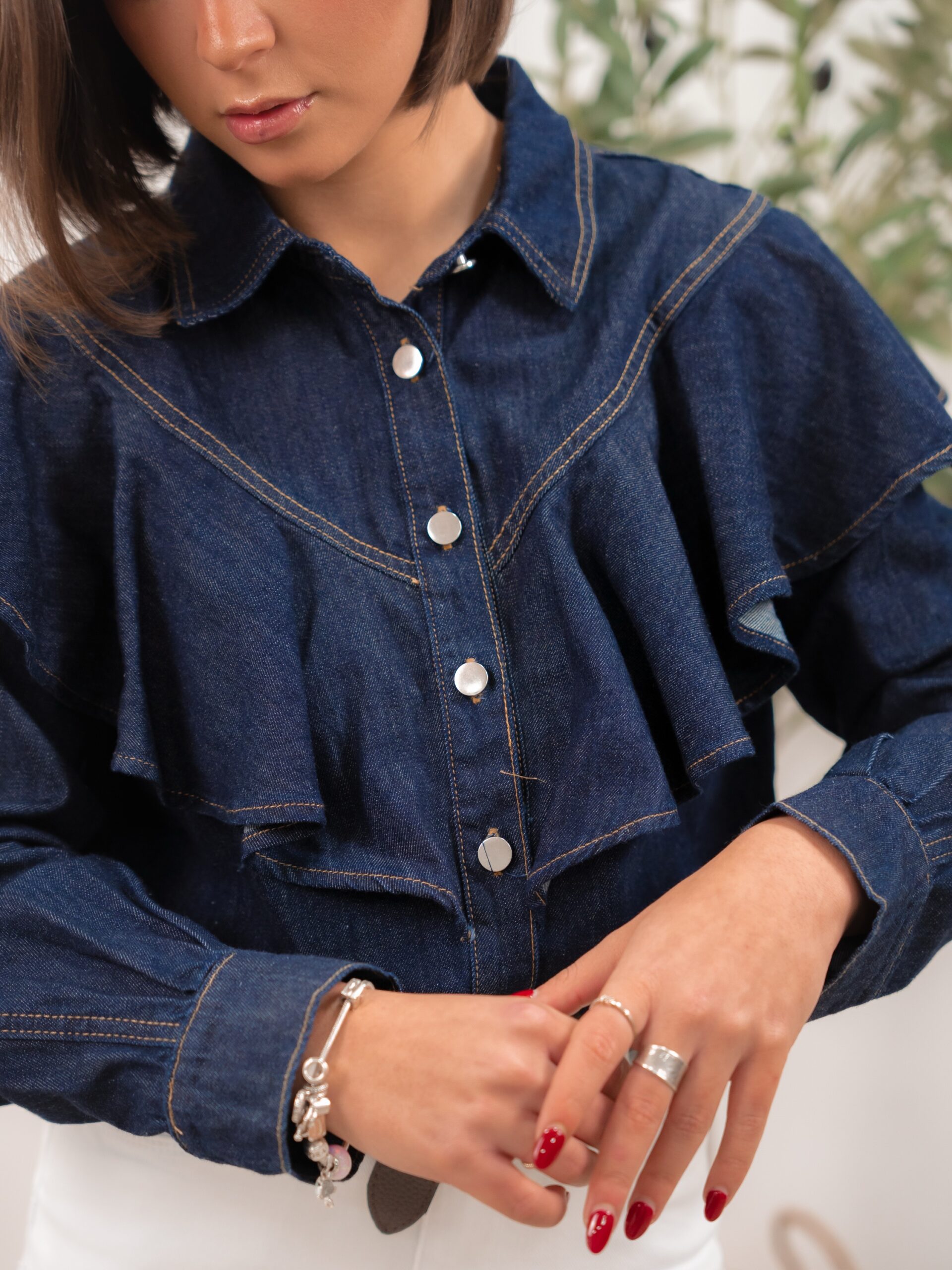 Camisa en tejido denim con maxivolante. Cuello camisero y cierre con botón metálicos.