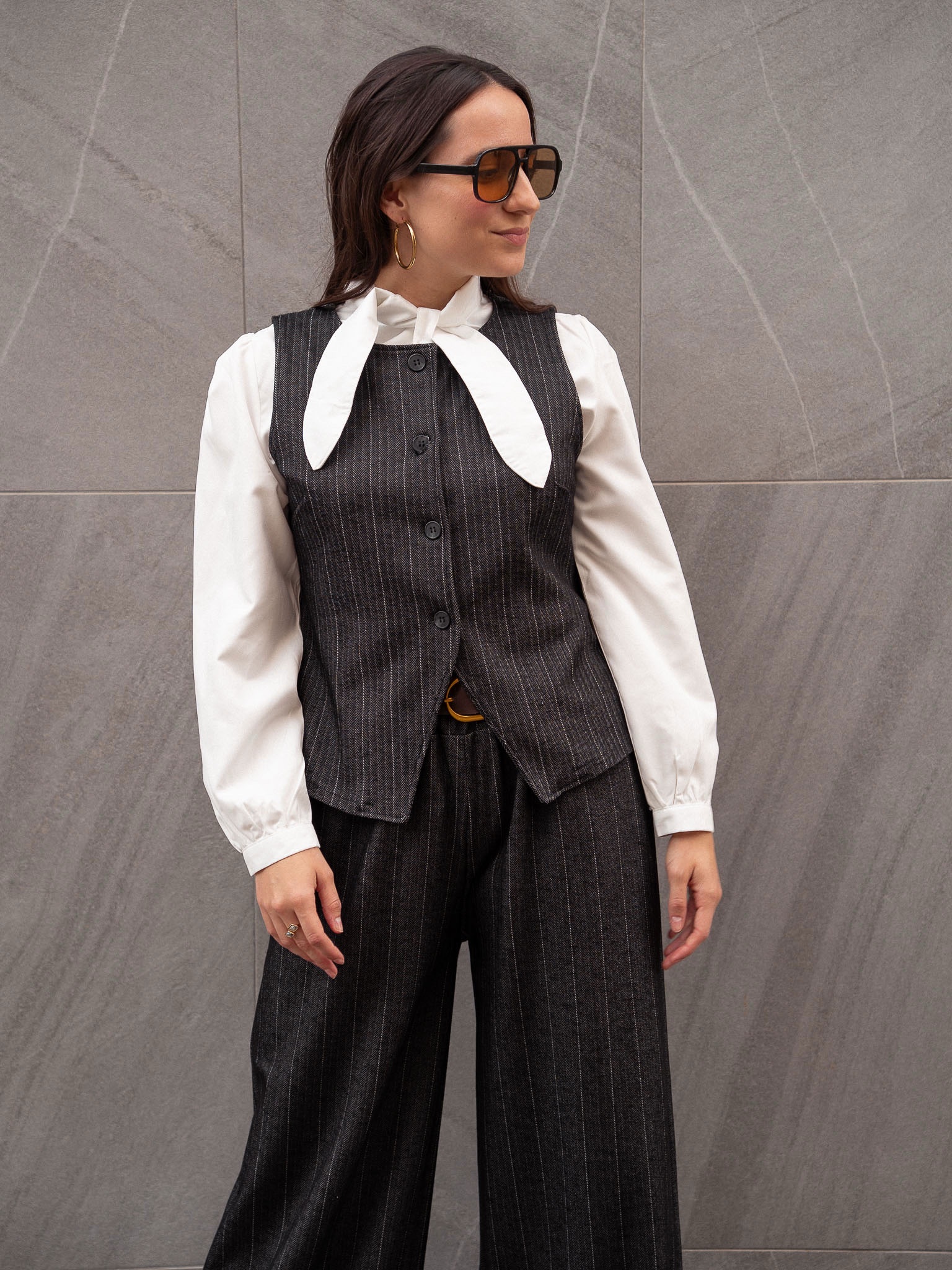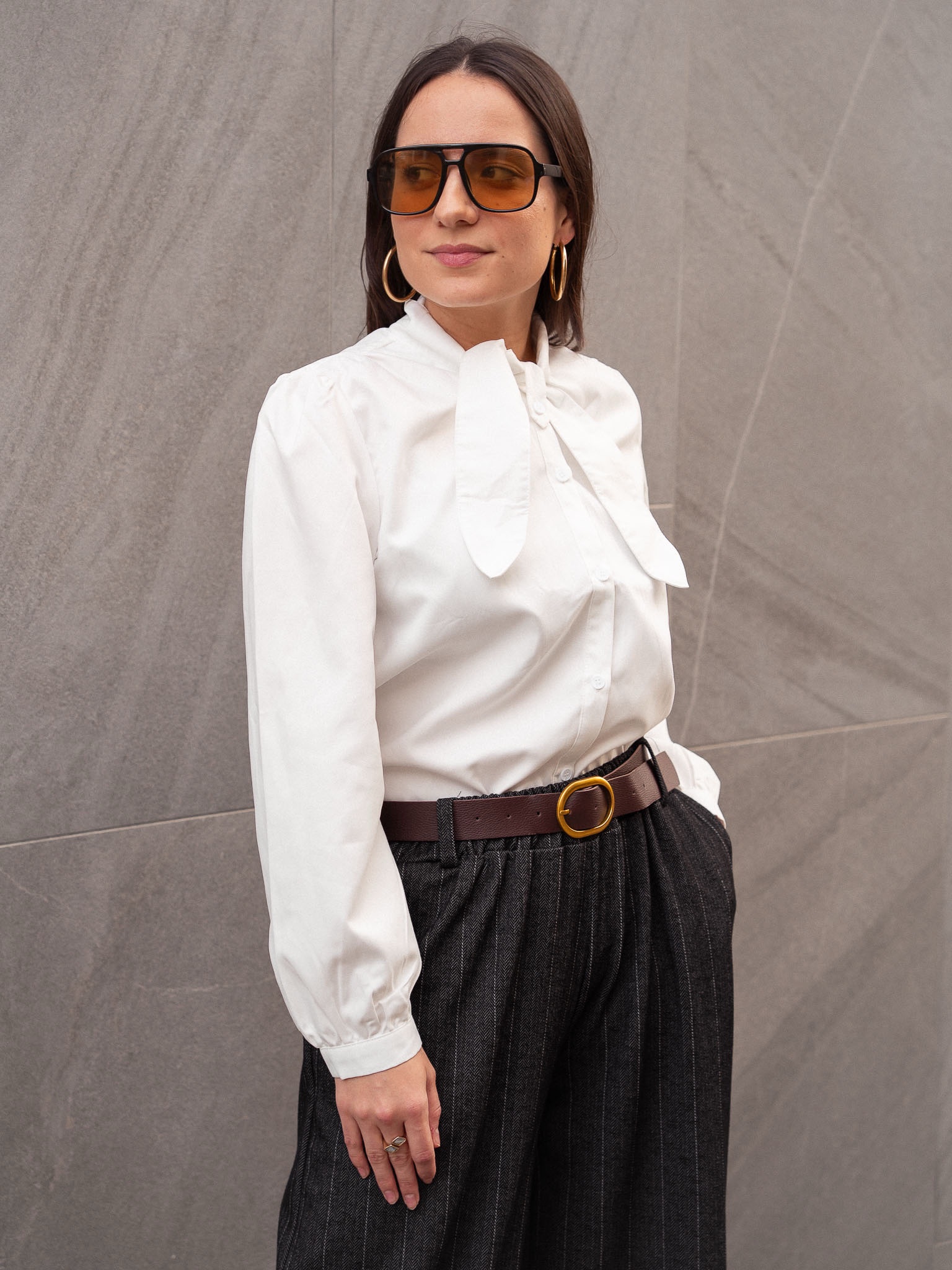Camisa de cuello solapa y lazo. Manga larga. Cierre frontal con botones.