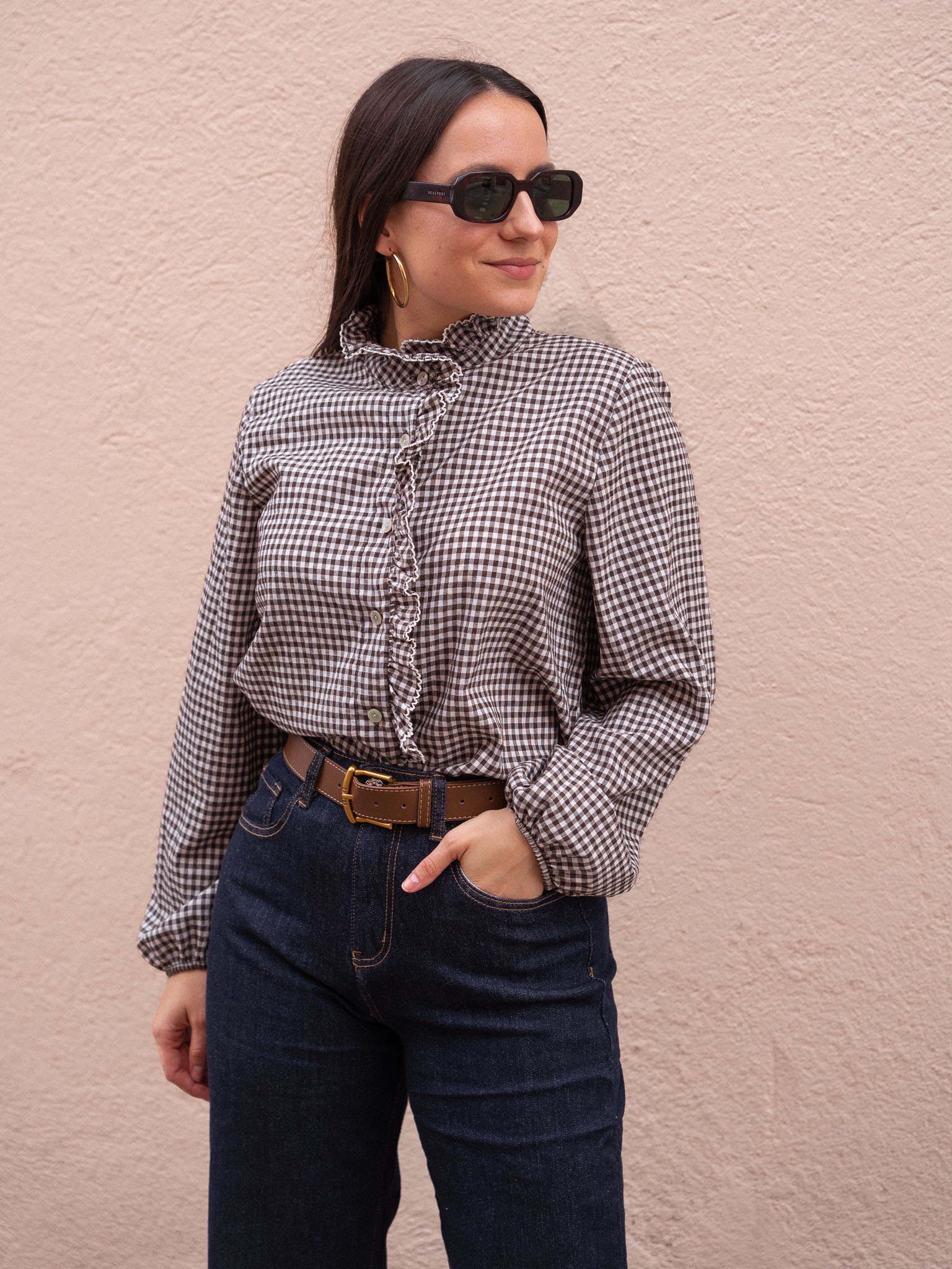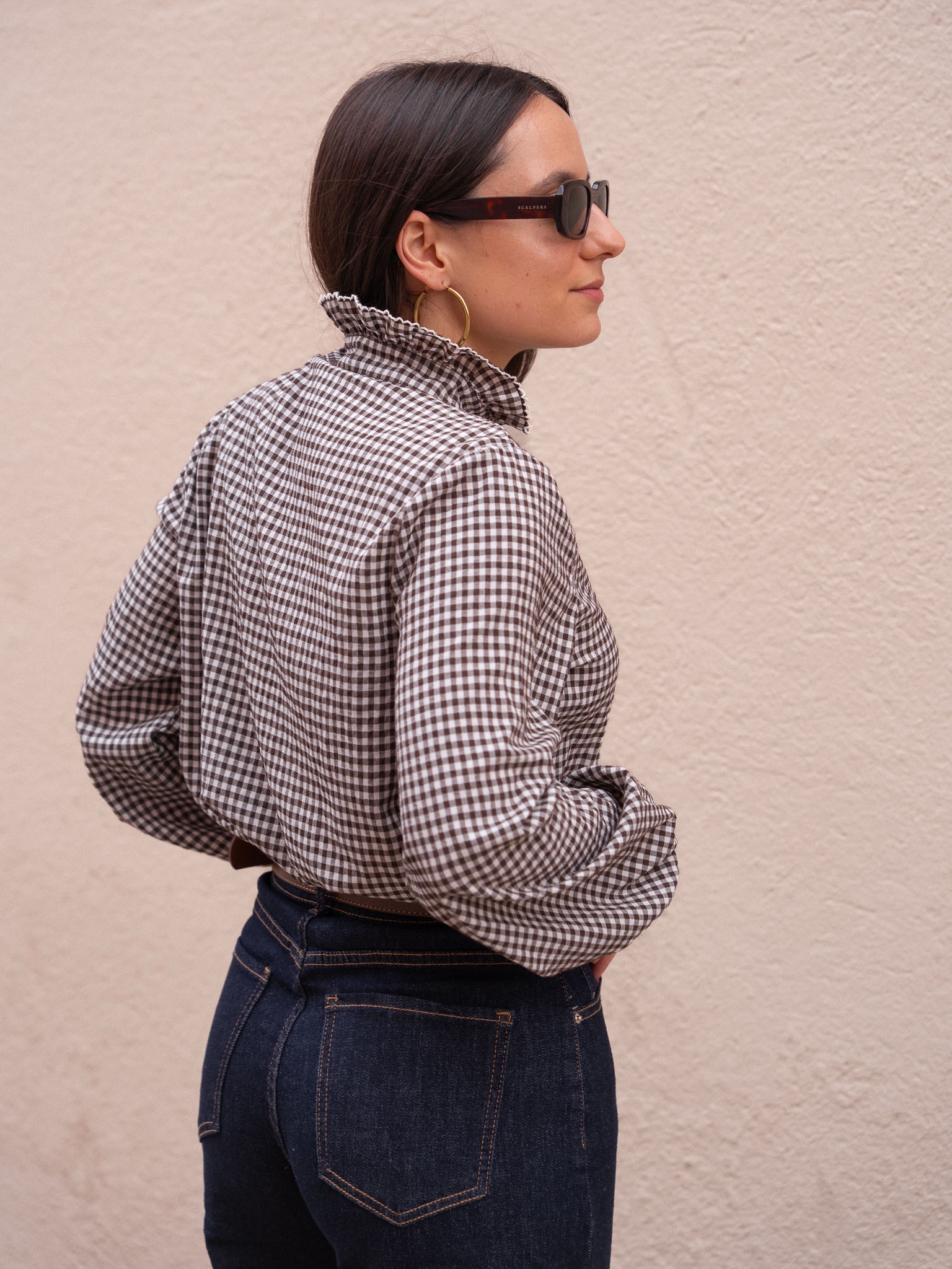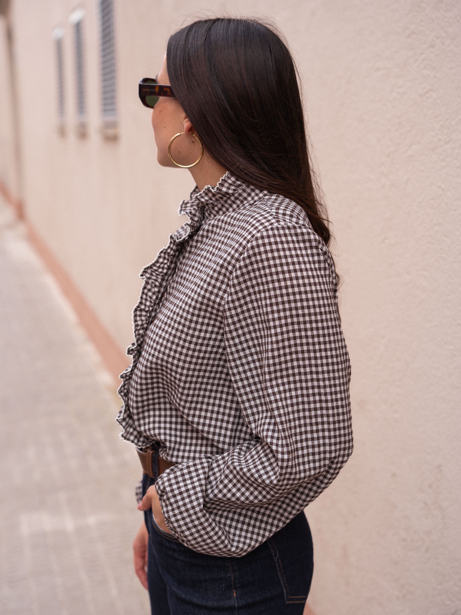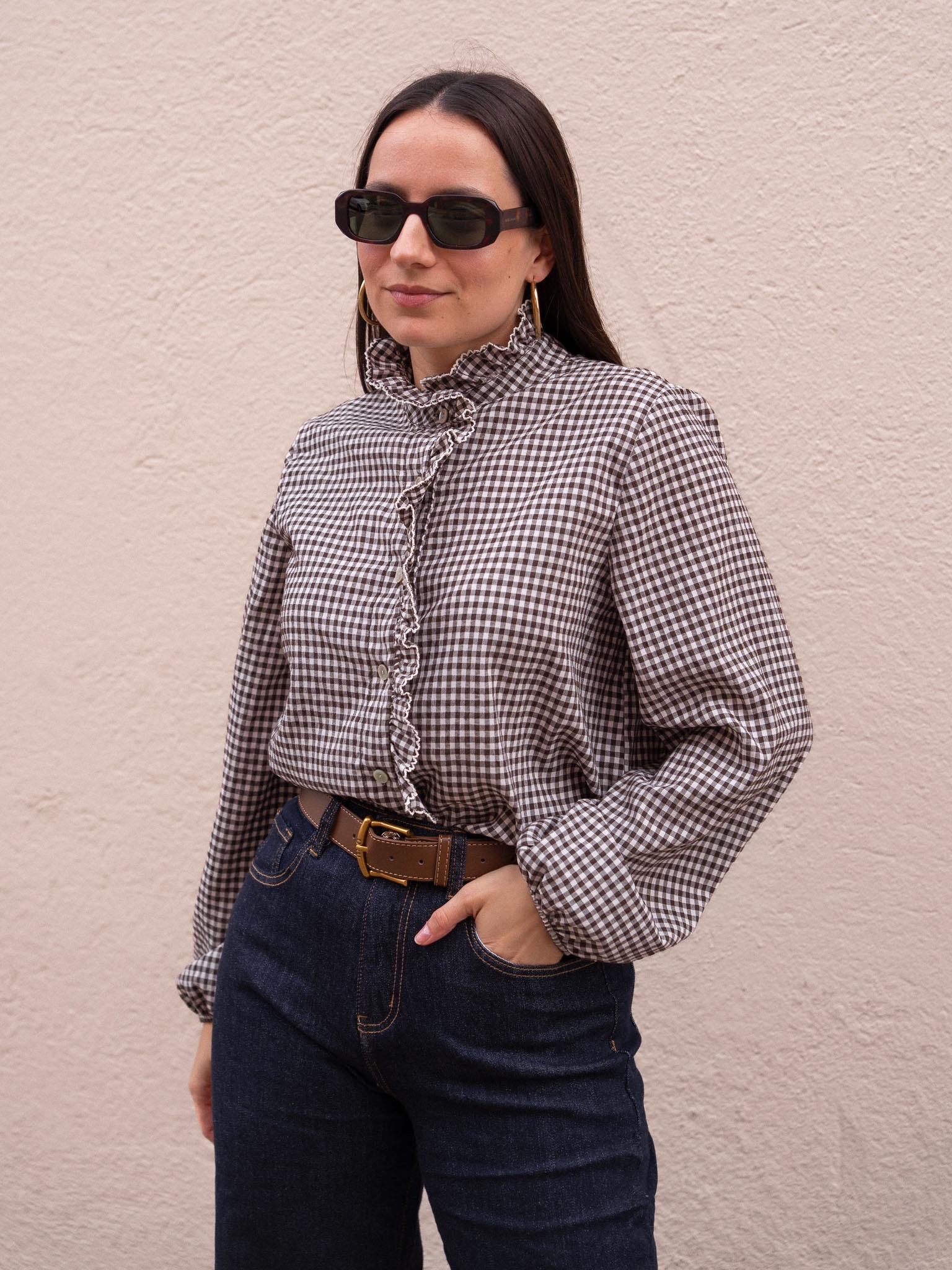 Camisa abotonada talla única con estampado de cuadro vichy en blanco y marrón. Cuello rizado. Da de la 36 a la 42.