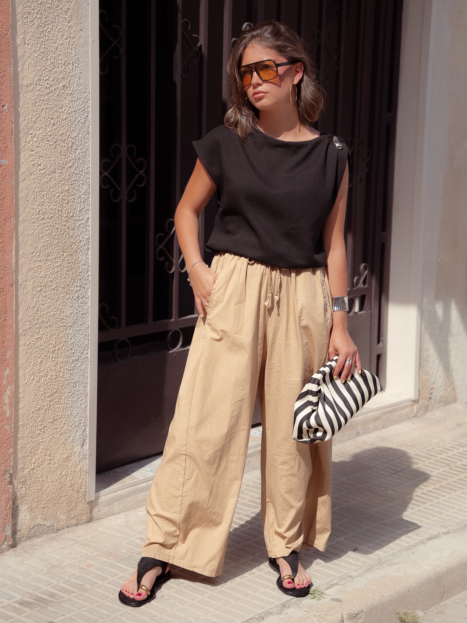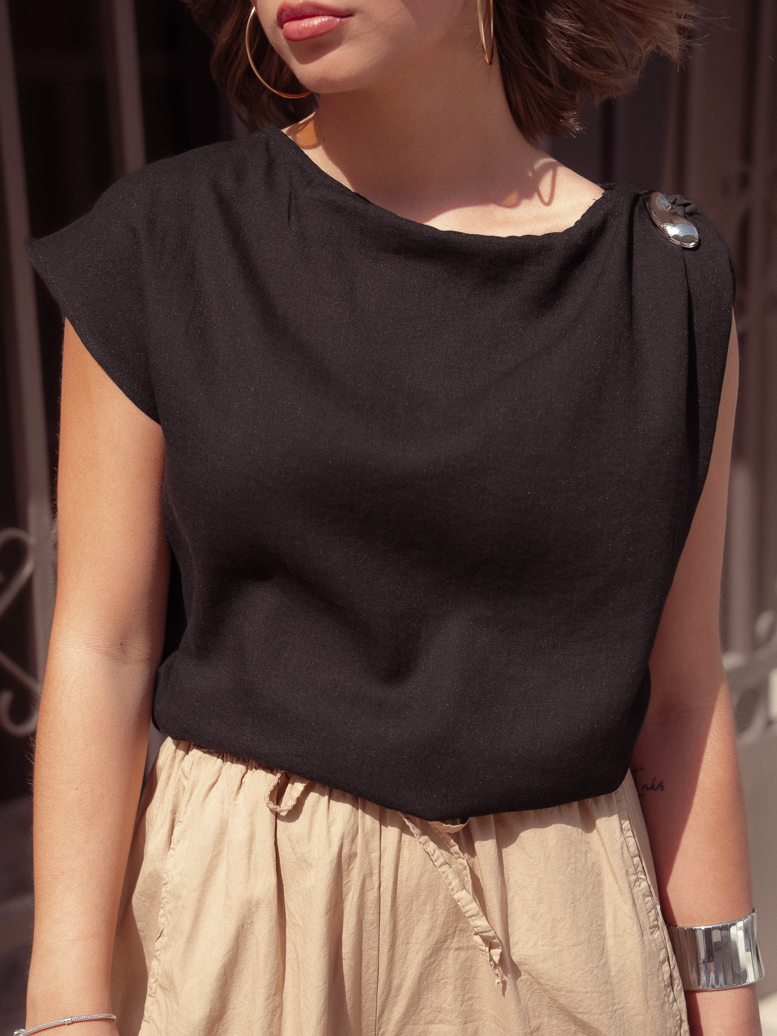 Camiseta de lino con broche metálico en hombro.