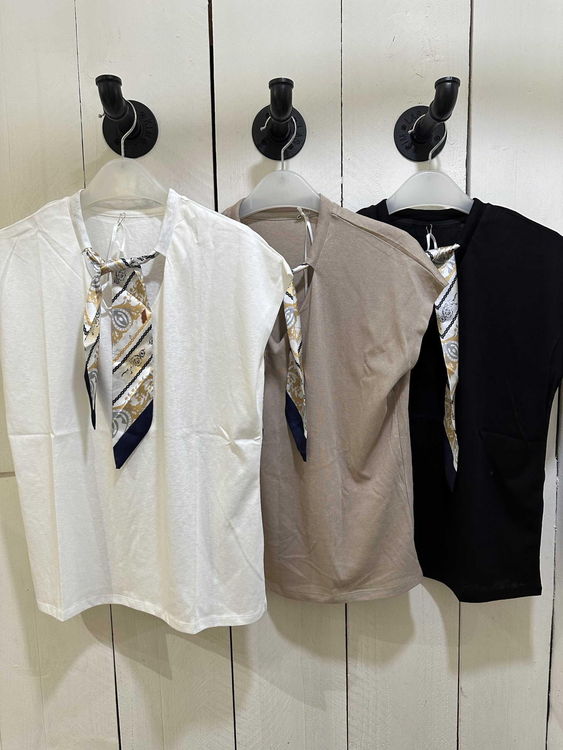 Camiseta de manga corta y cuello pico. Lleva el pañuelo incorporado.