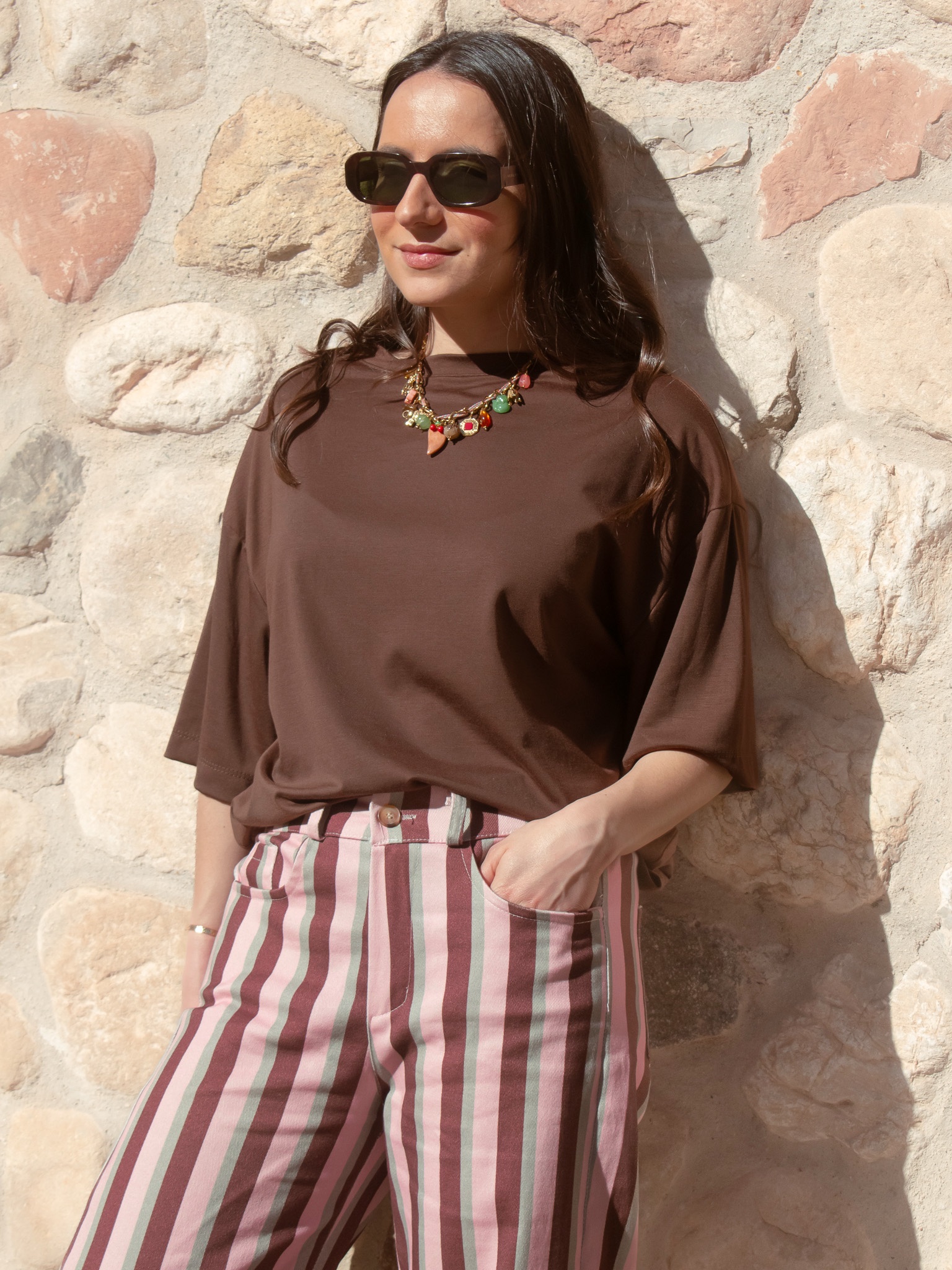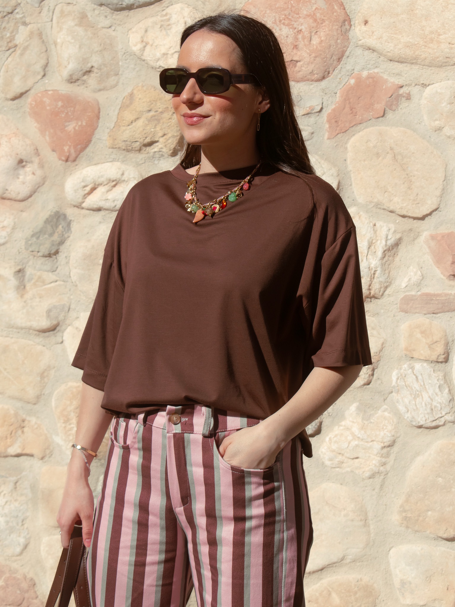 Camiseta fluida de manga corta en color marrón.