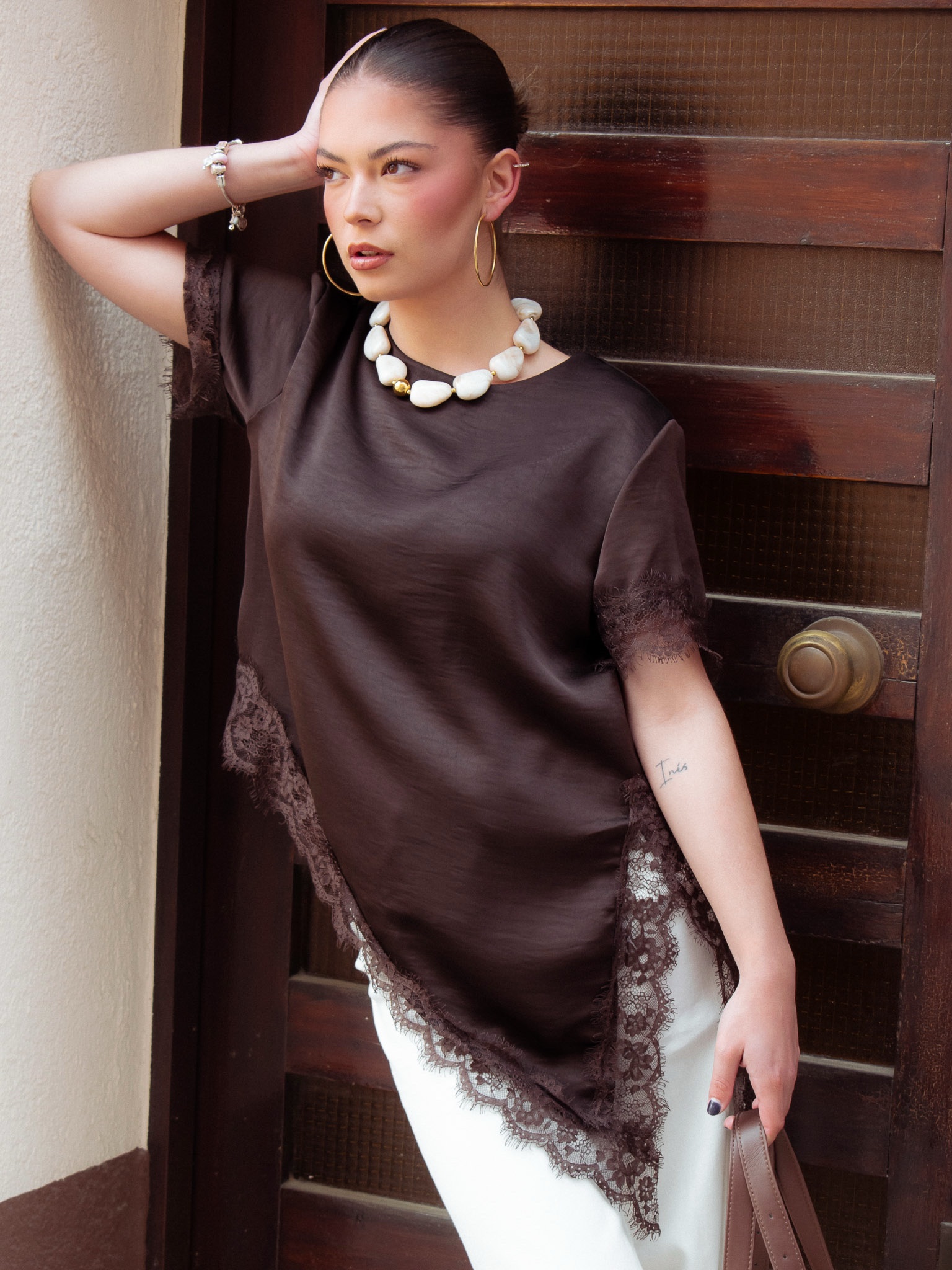 Camiseta de manga corta y cuello pico. Detalle de volantes en escote.