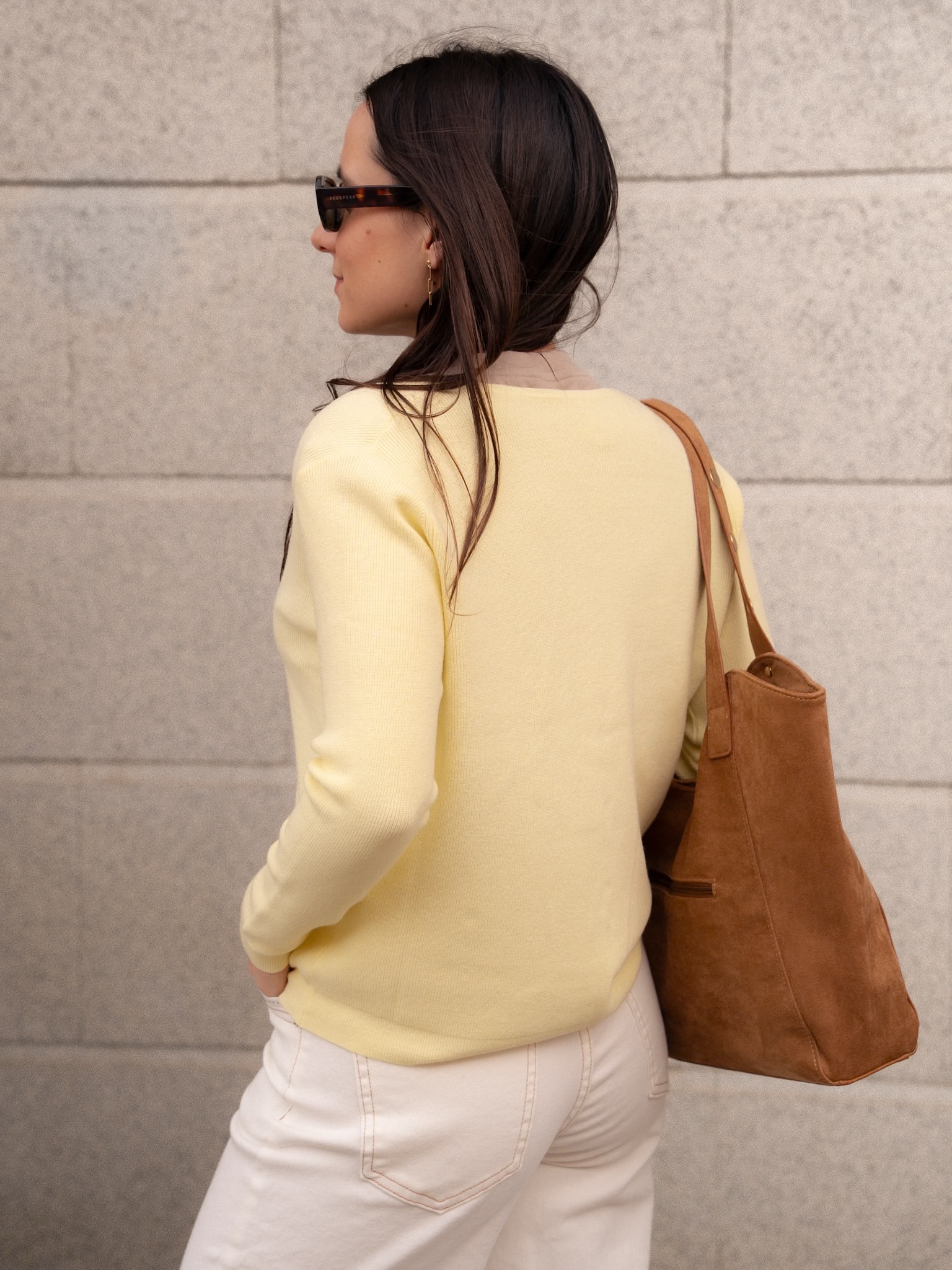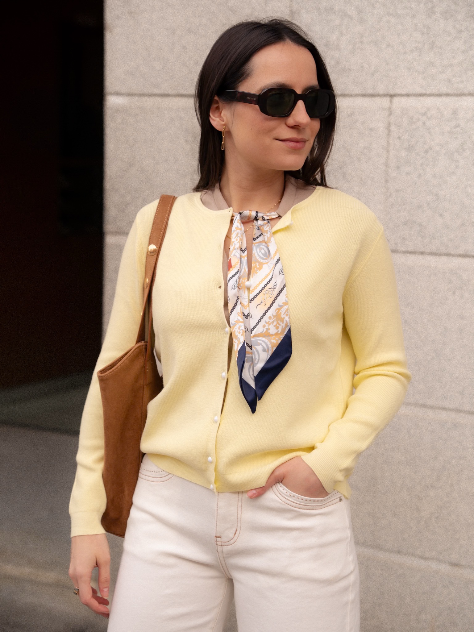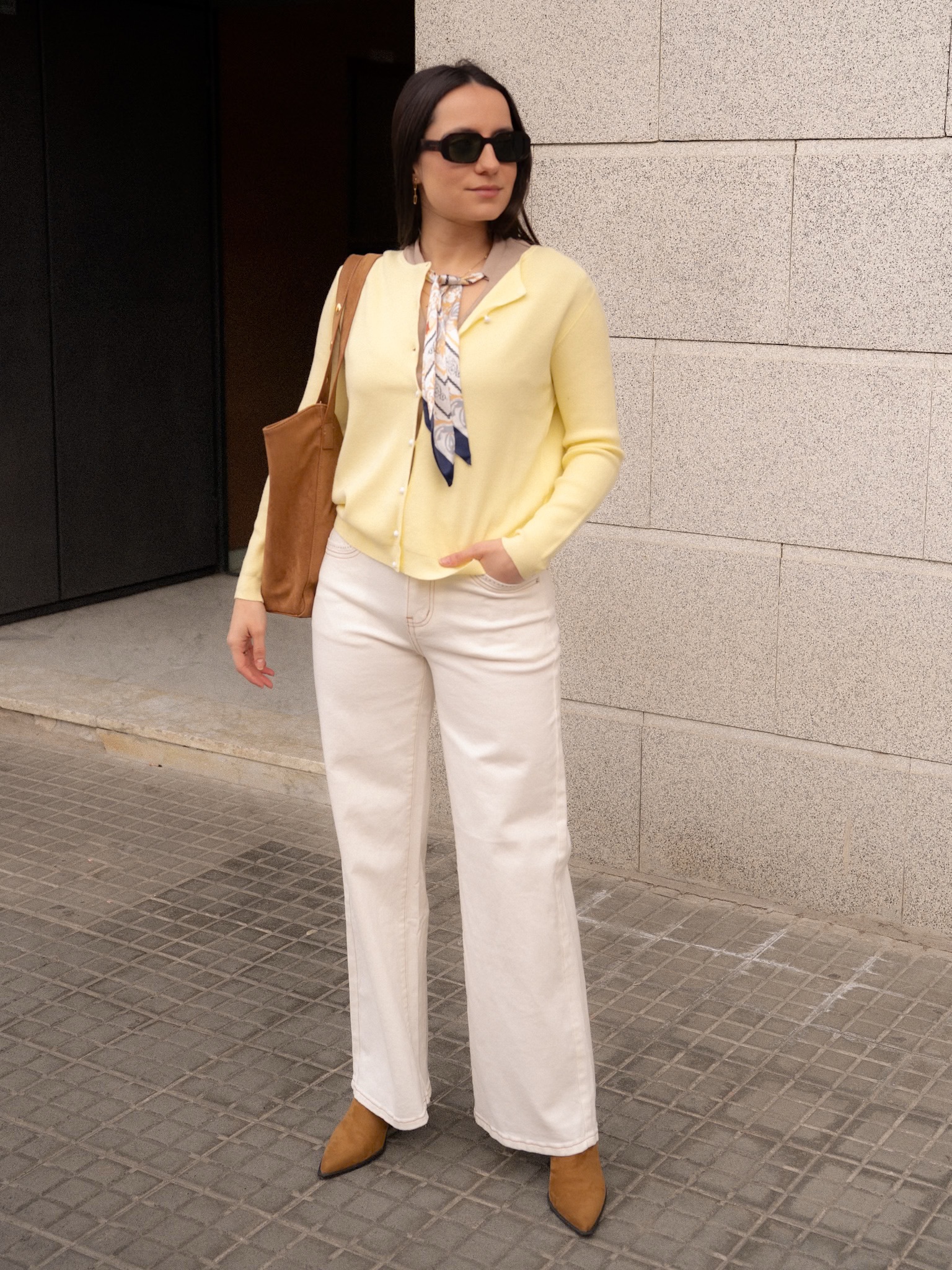 Chaqueta de punto de canalé. Cierre frontal con botones perlados.
