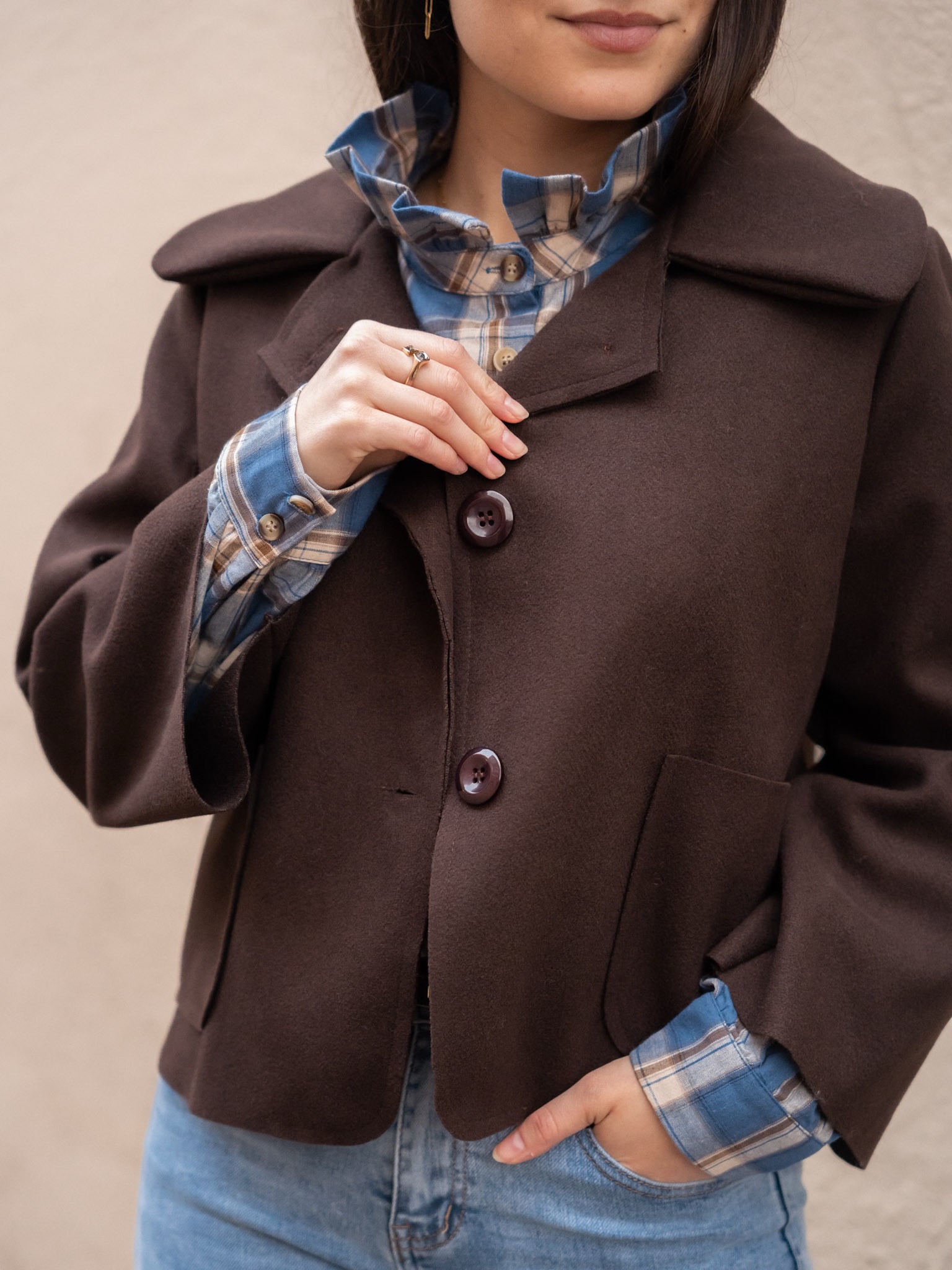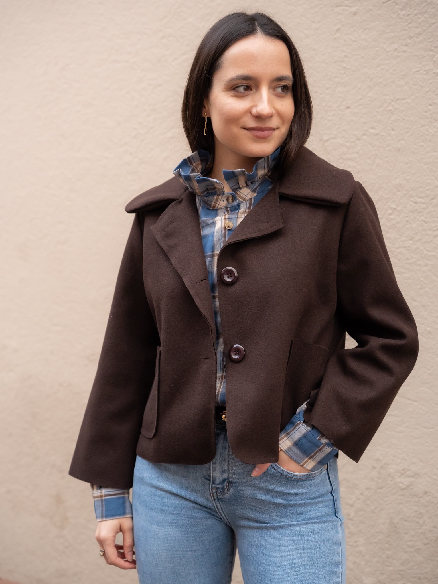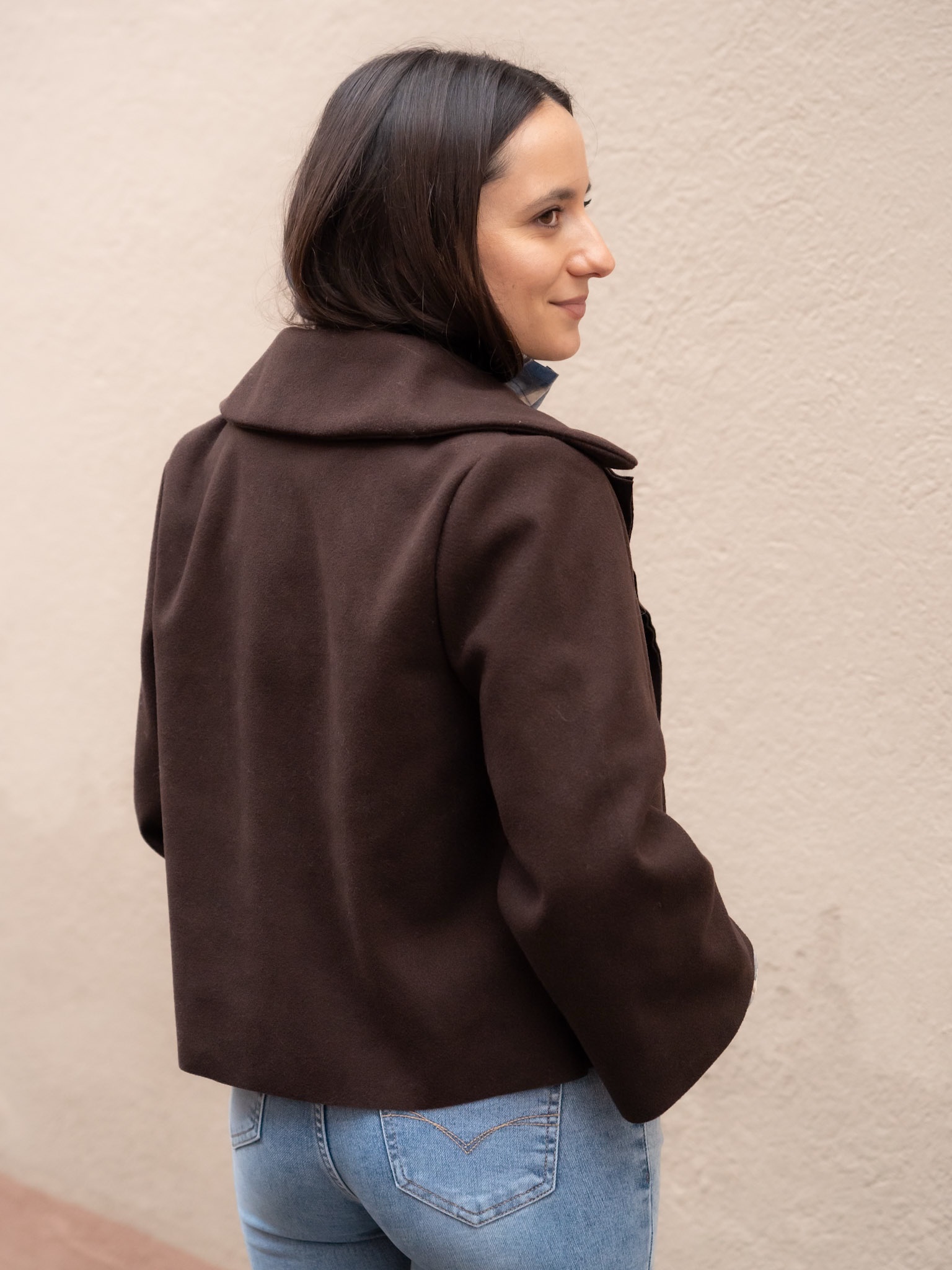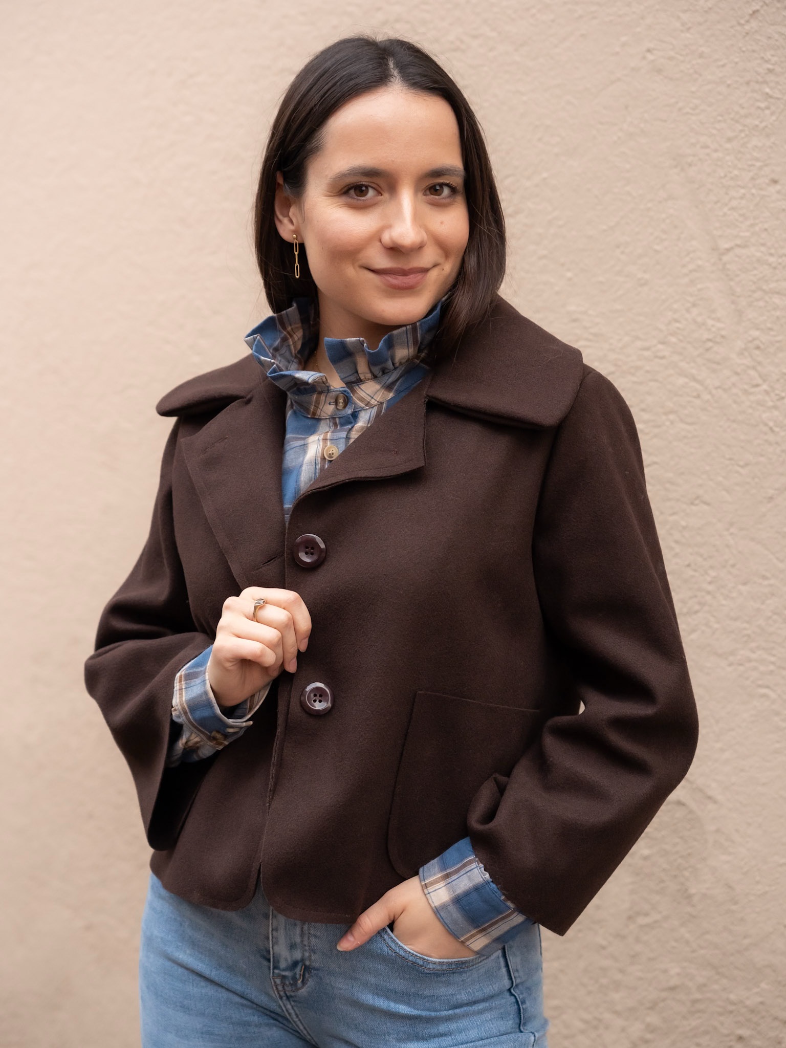 •Chaqueta corta de paño con cuello solapa. Cierre con botones, bolsillos grandes frontales.