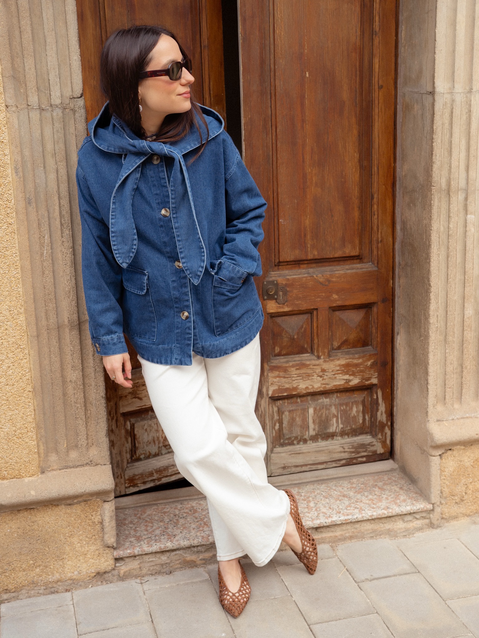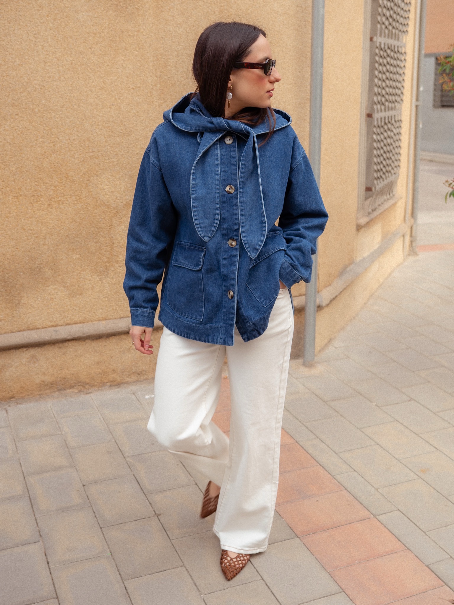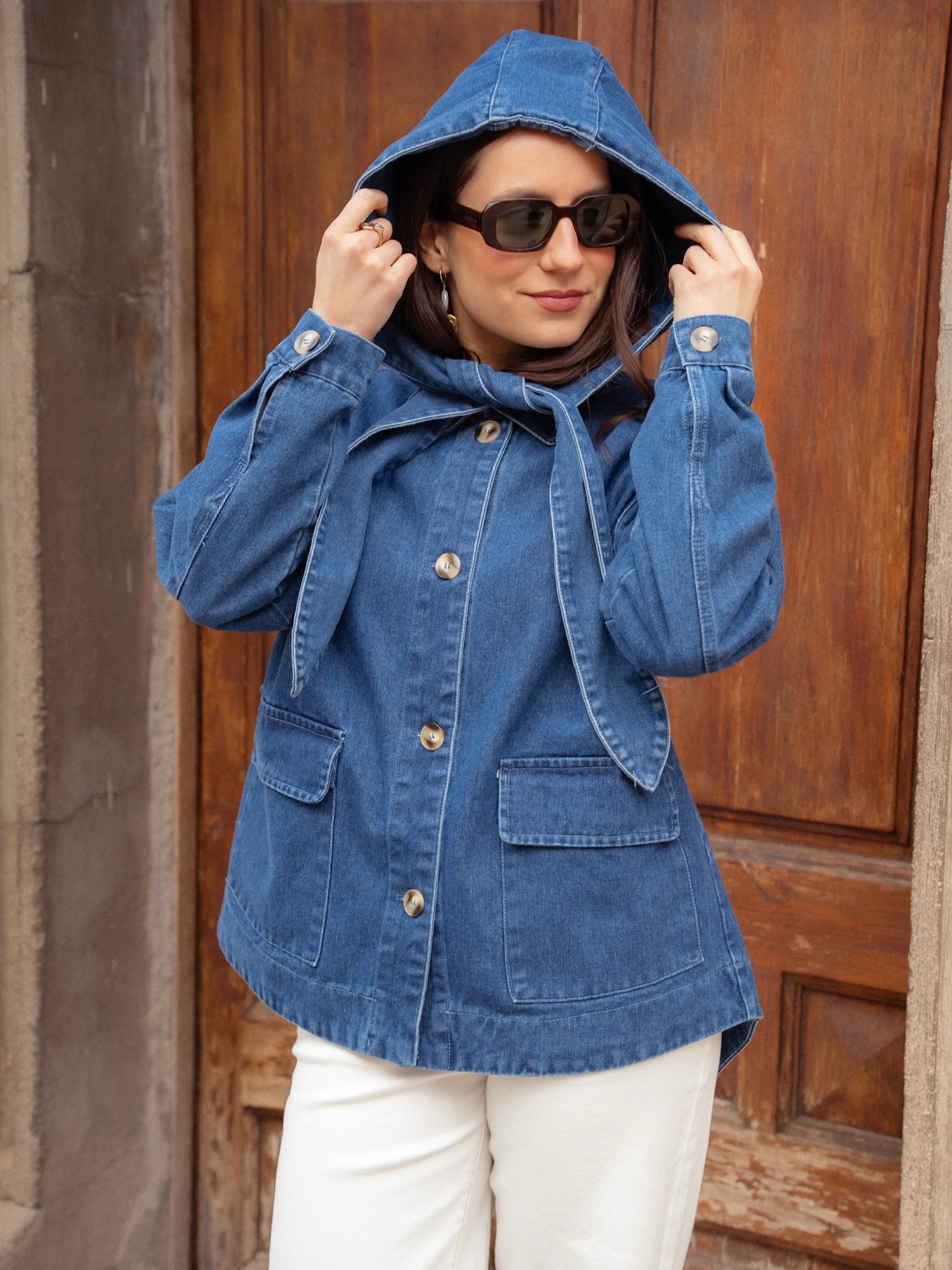 Cazadora denim abotonada. Capucha desmontable con lazada delantera.