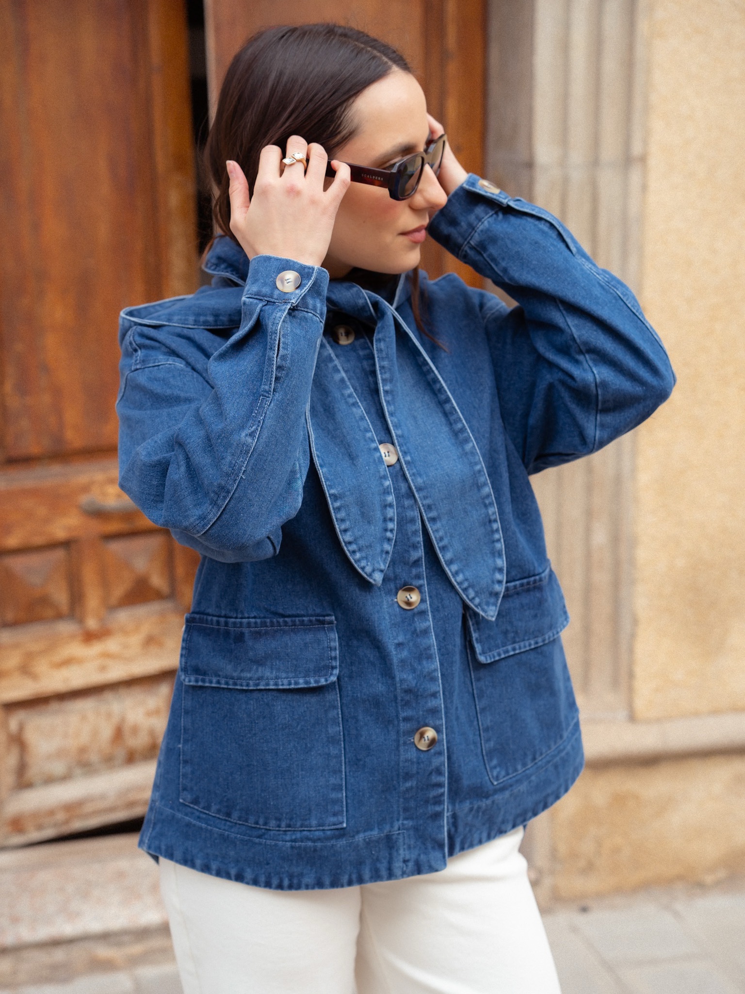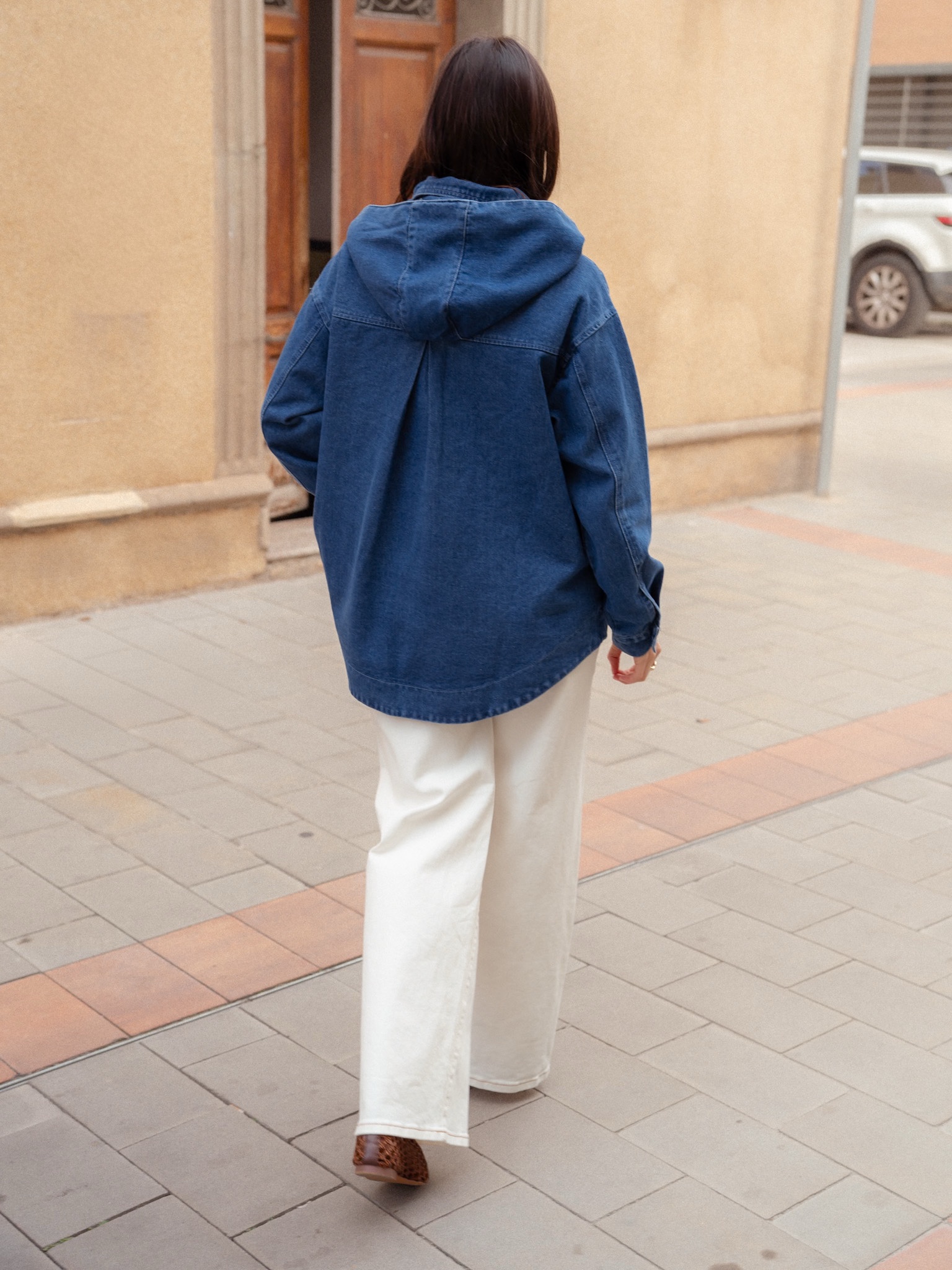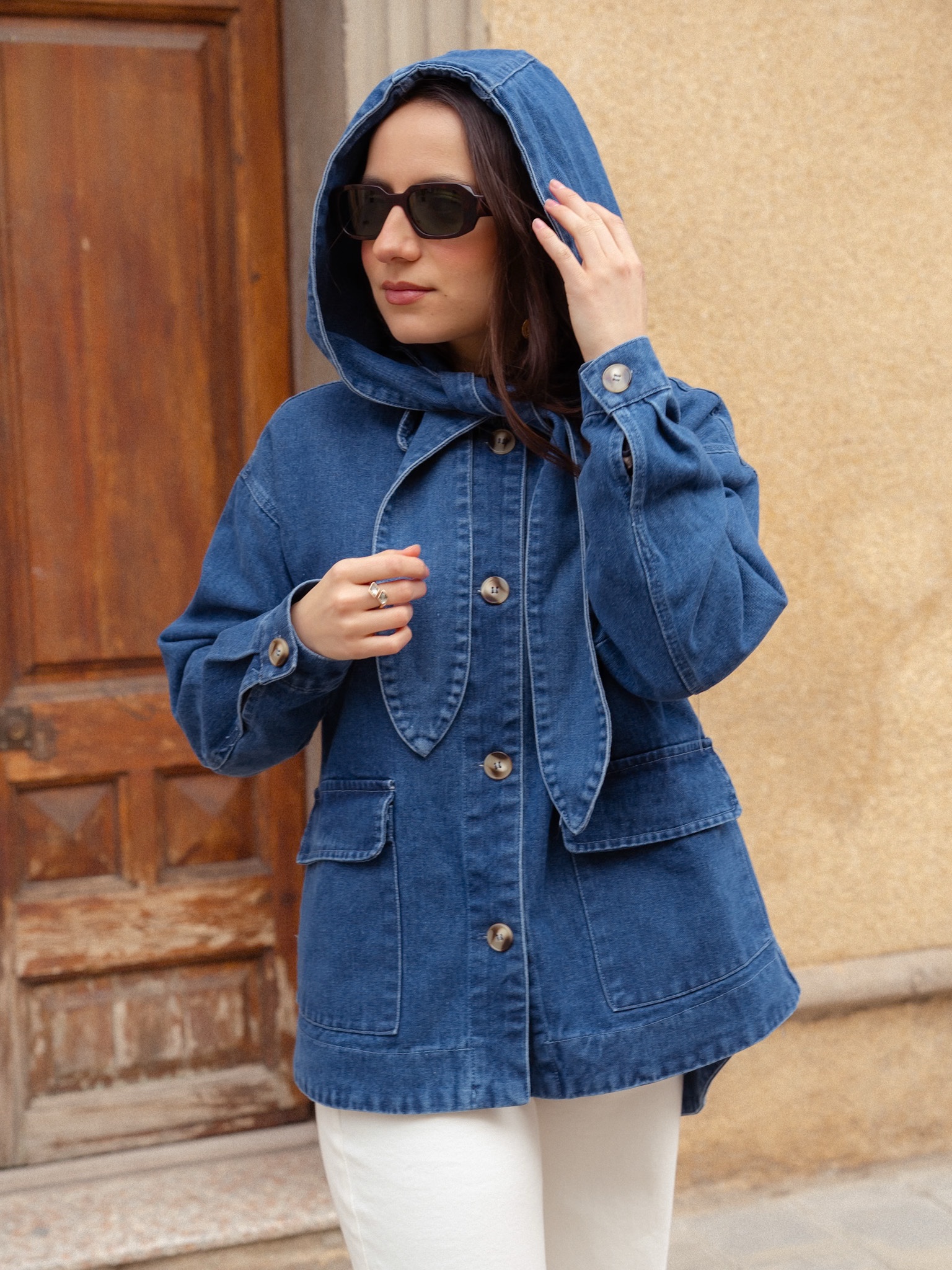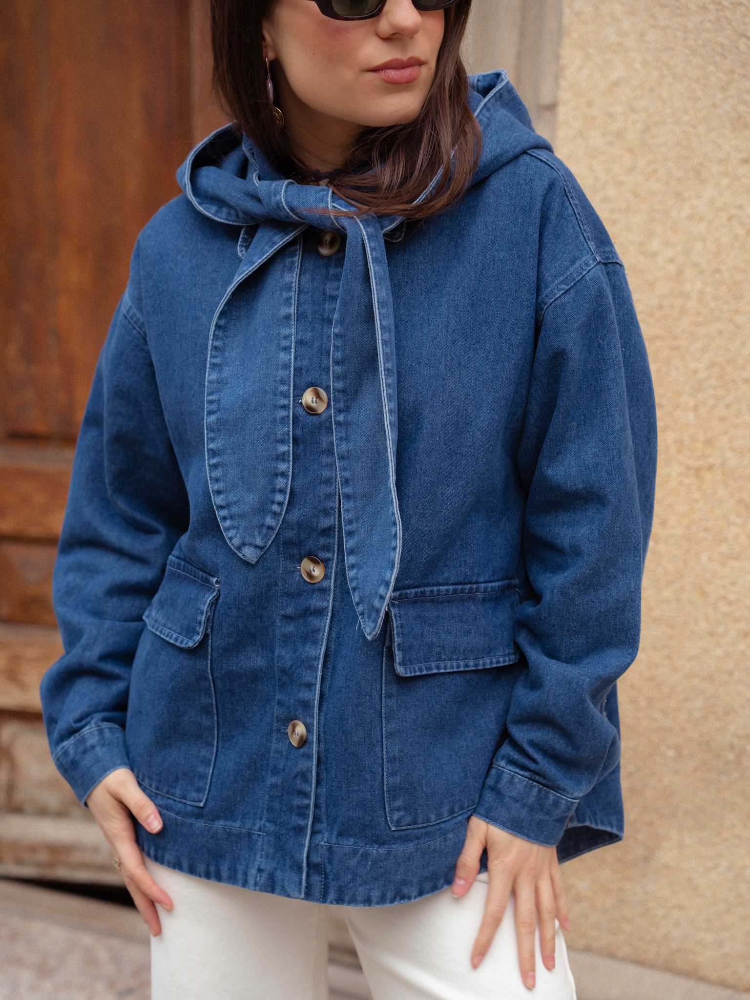 Cazadora denim abotonada. Capucha desmontable con lazada delantera.