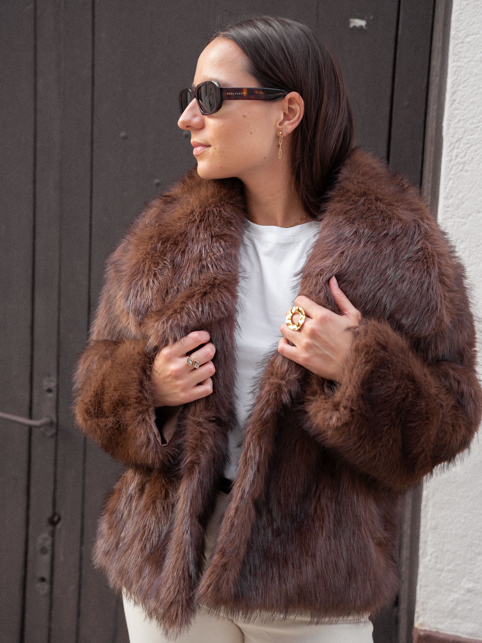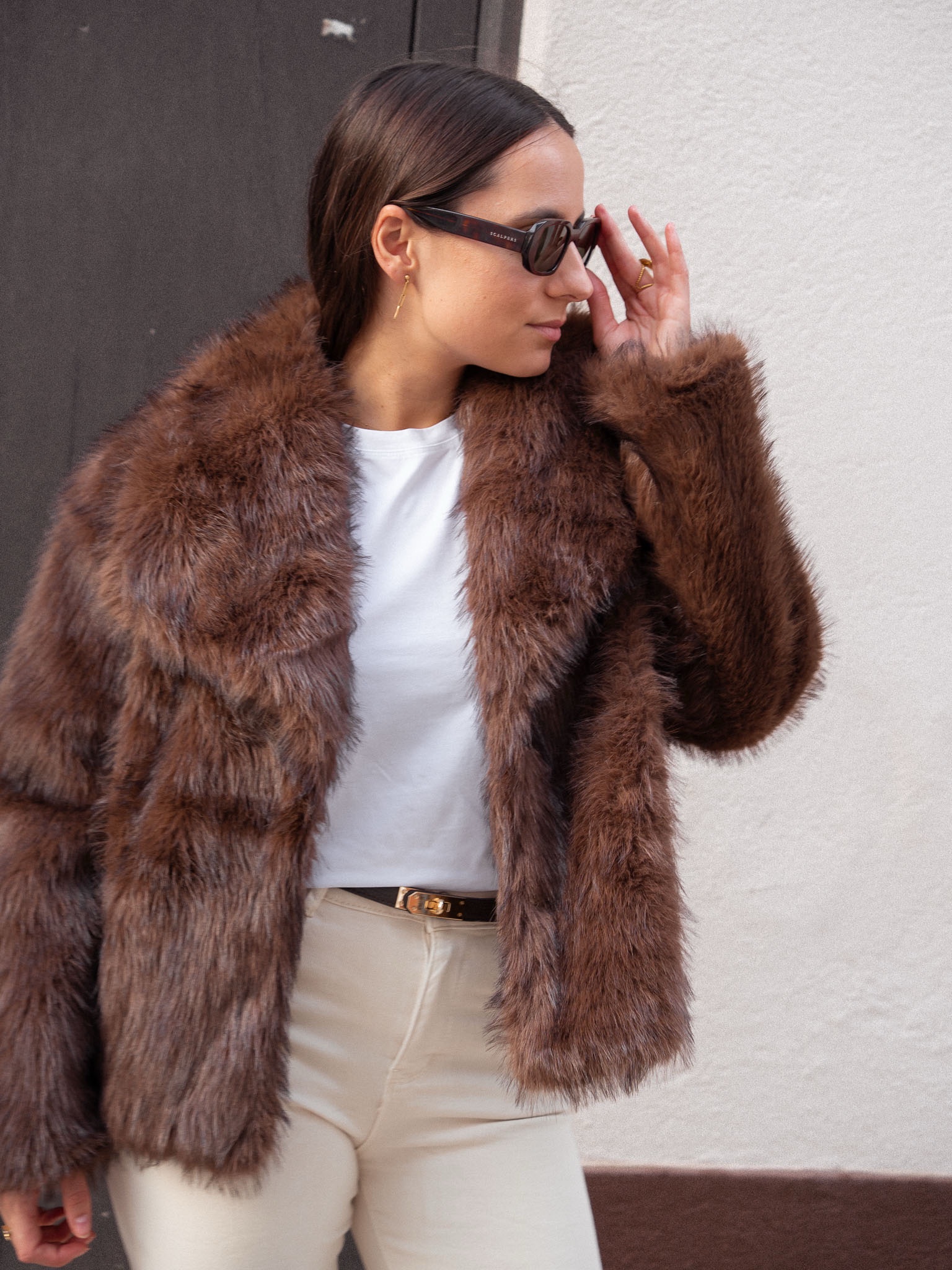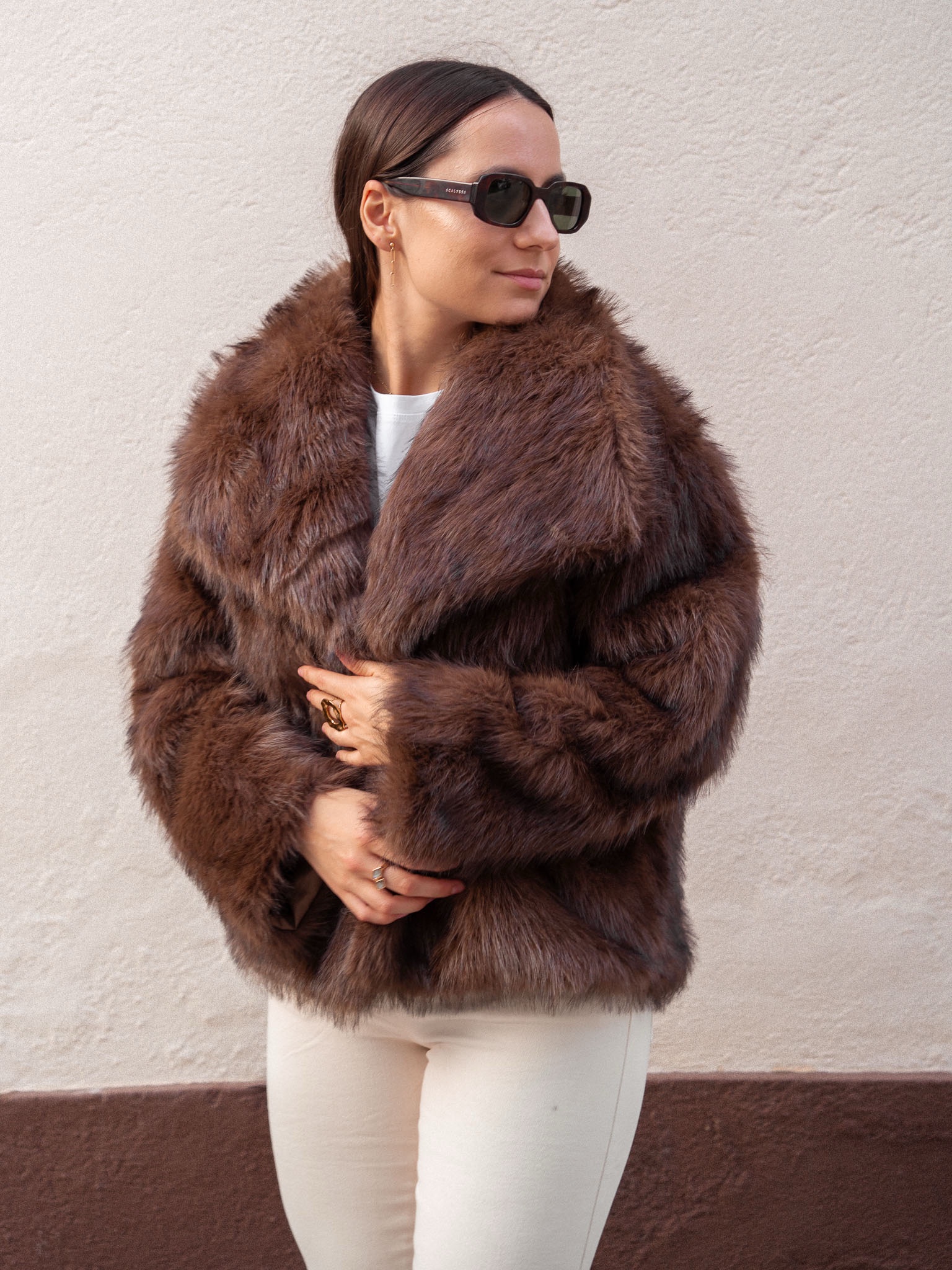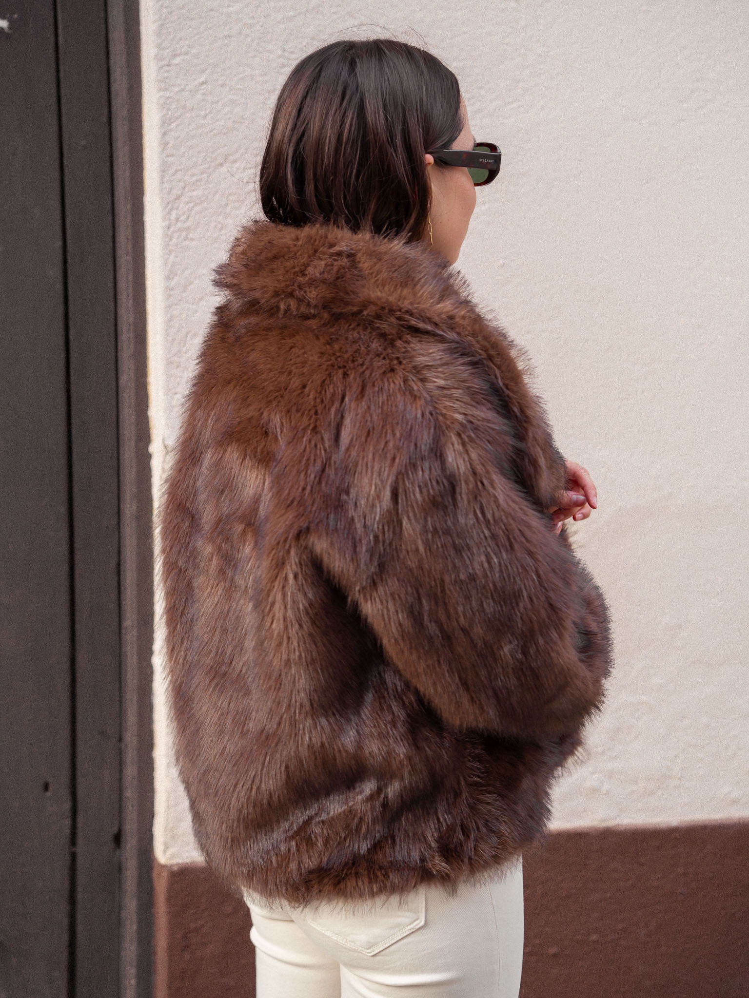 Chaqueta de cuello solapa y manga larga. Bolsillos laterales. Forro interior a tono. Cierre frontal con ganchos metálicos.
