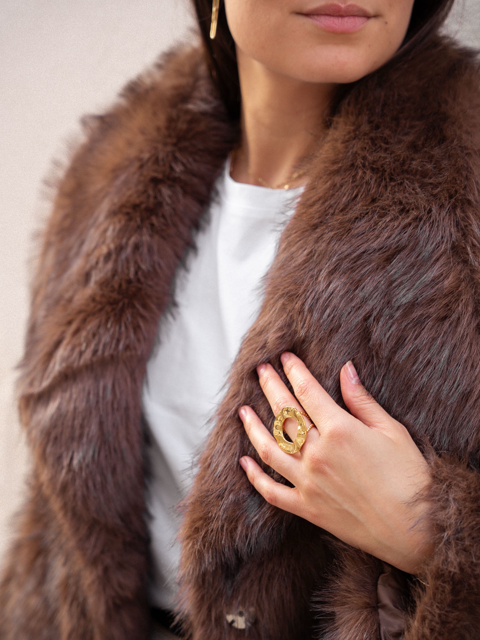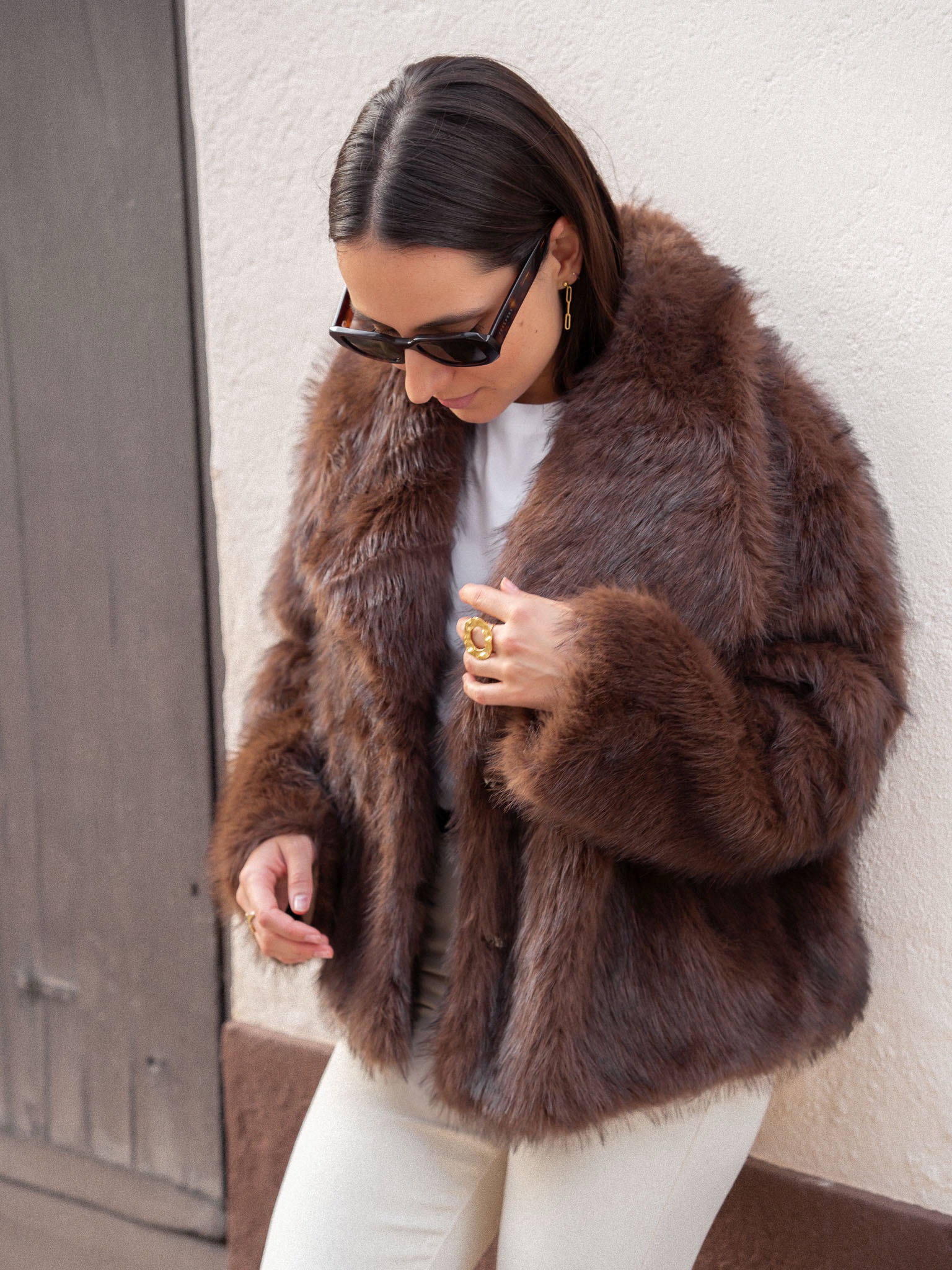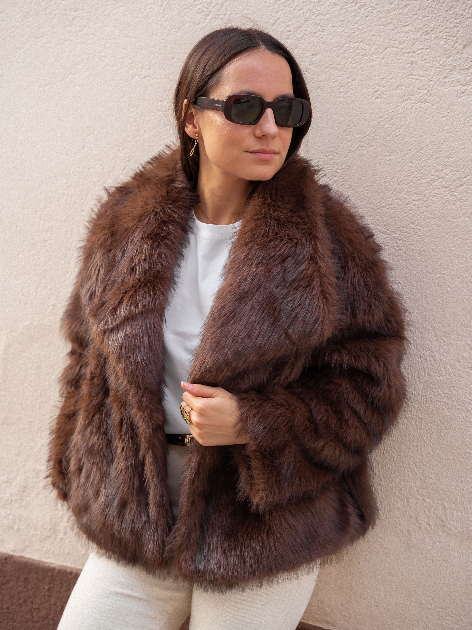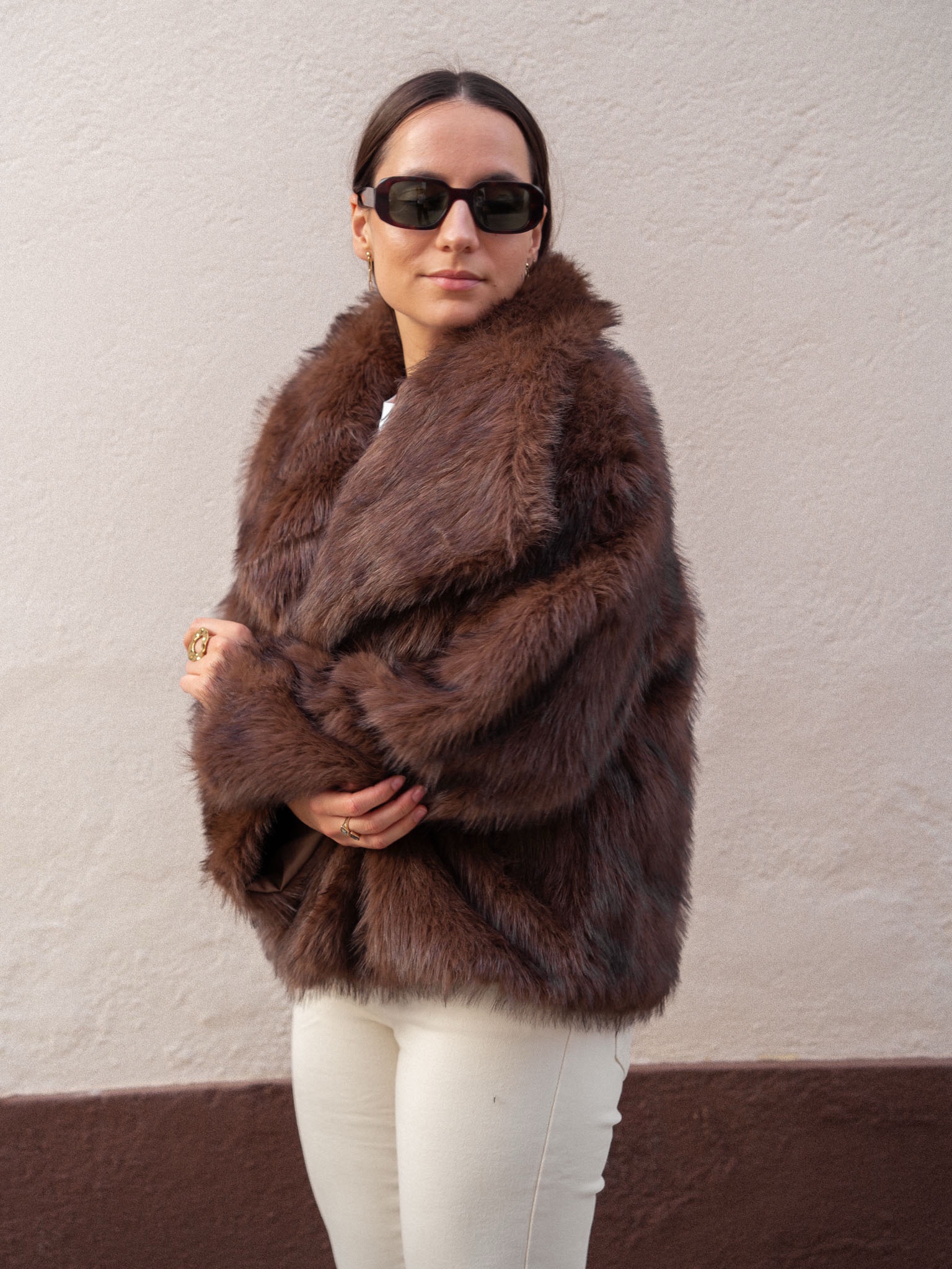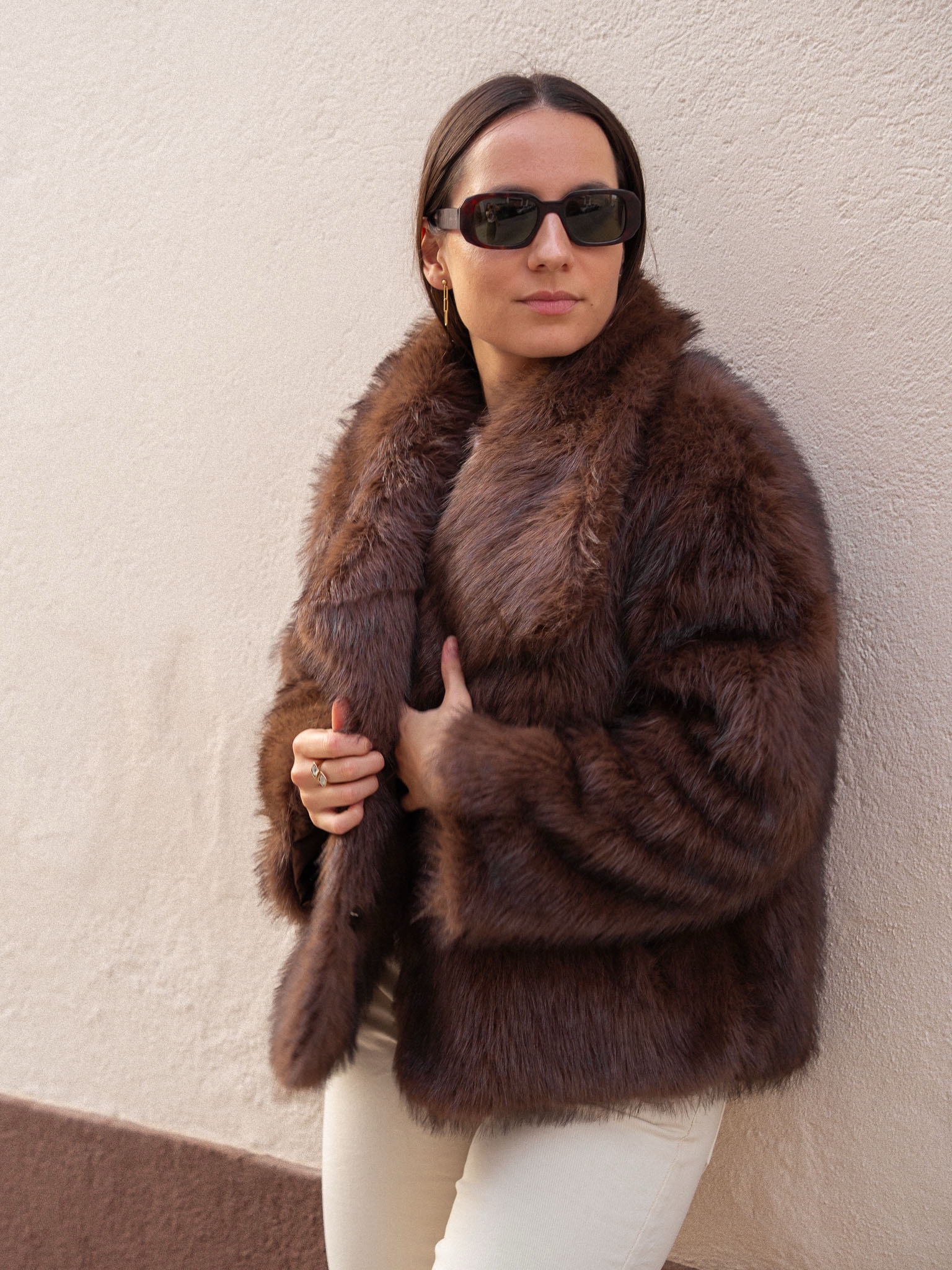 Chaqueta de cuello solapa y manga larga. Bolsillos laterales. Forro interior a tono. Cierre frontal con ganchos metálicos.