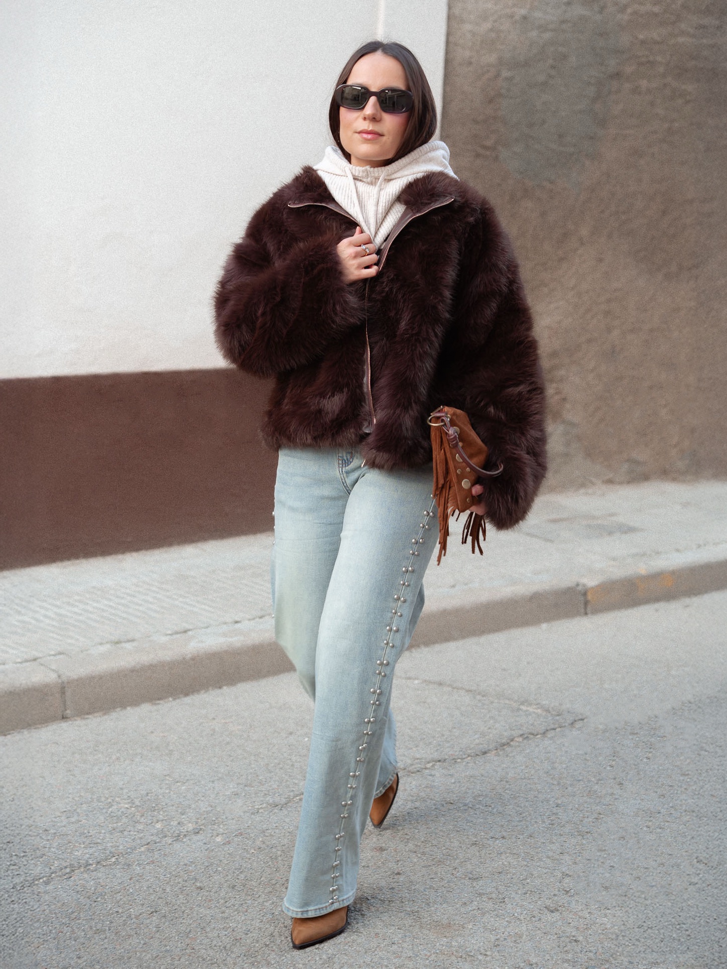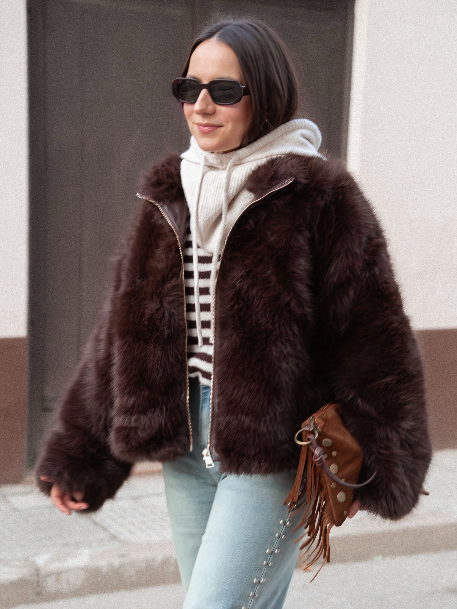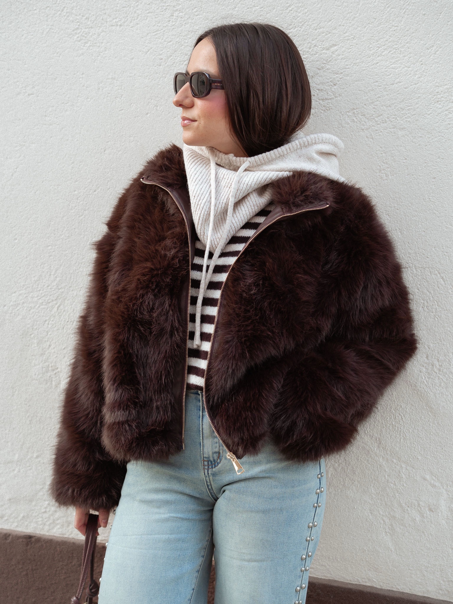 Chaqueta de pelo con cuello mao. Forro interior a tono. Cierre con cremallera. Talla única, da desde la 36 a la 44.