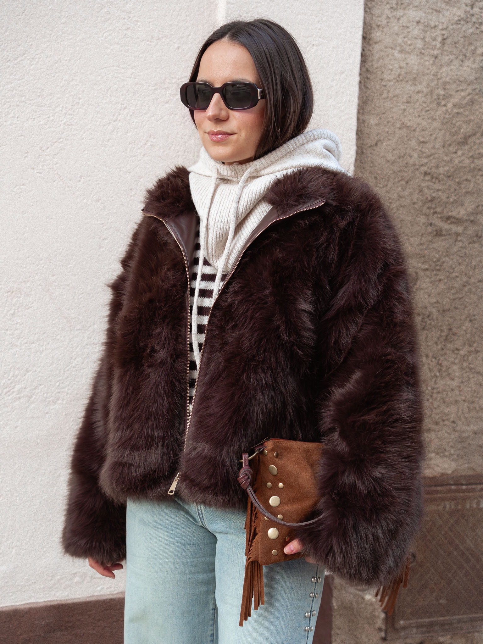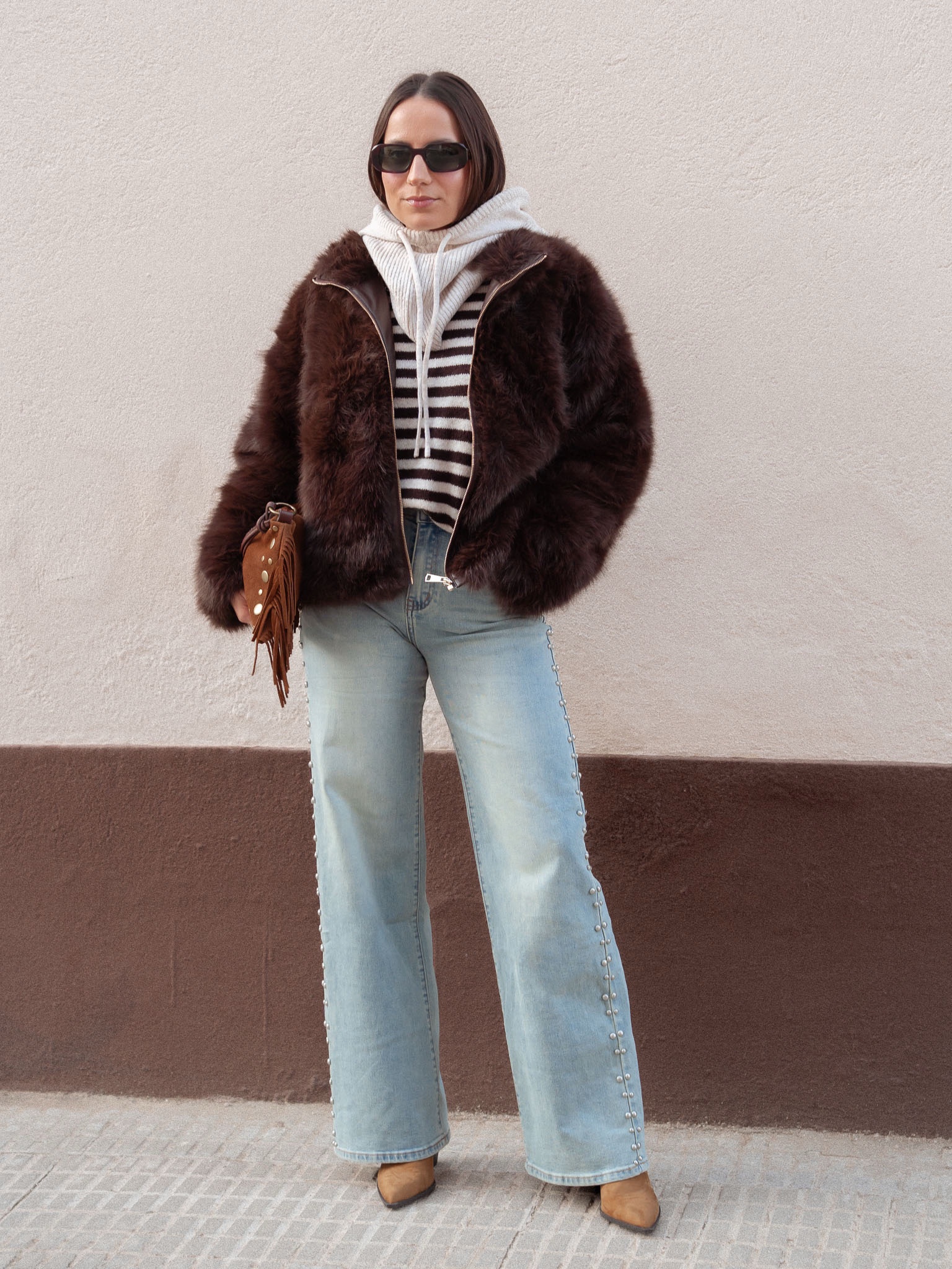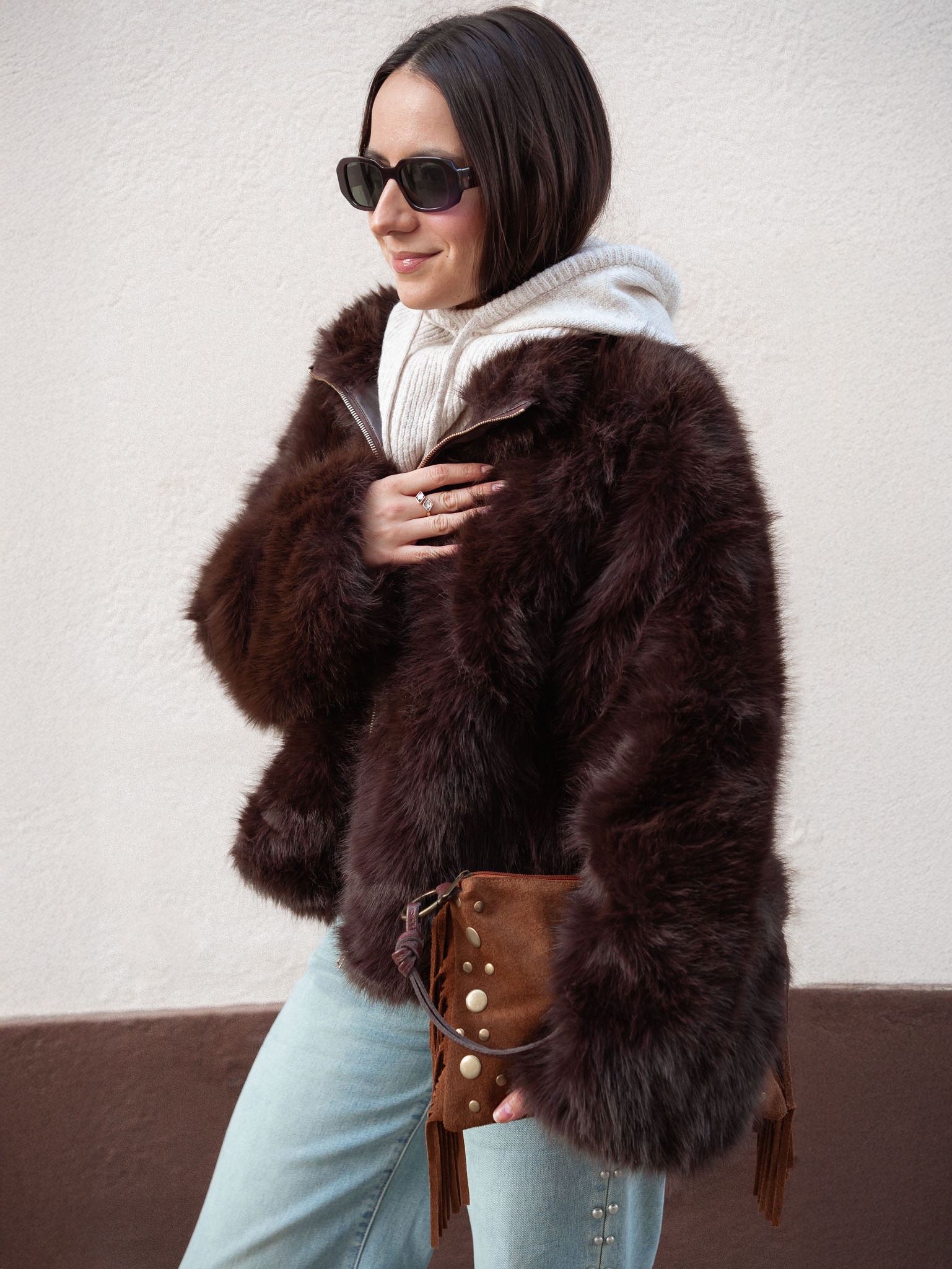Chaqueta de pelo con cuello mao. Forro interior a tono. Cierre con cremallera. Talla única, da desde la 36 a la 44.