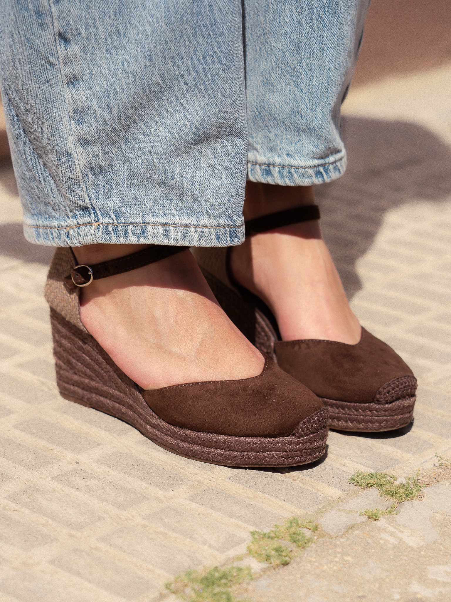 Plataforma tipo valenciana, con cuña en yute. Escote en pico. Cierre hebilla en la tira del talón.