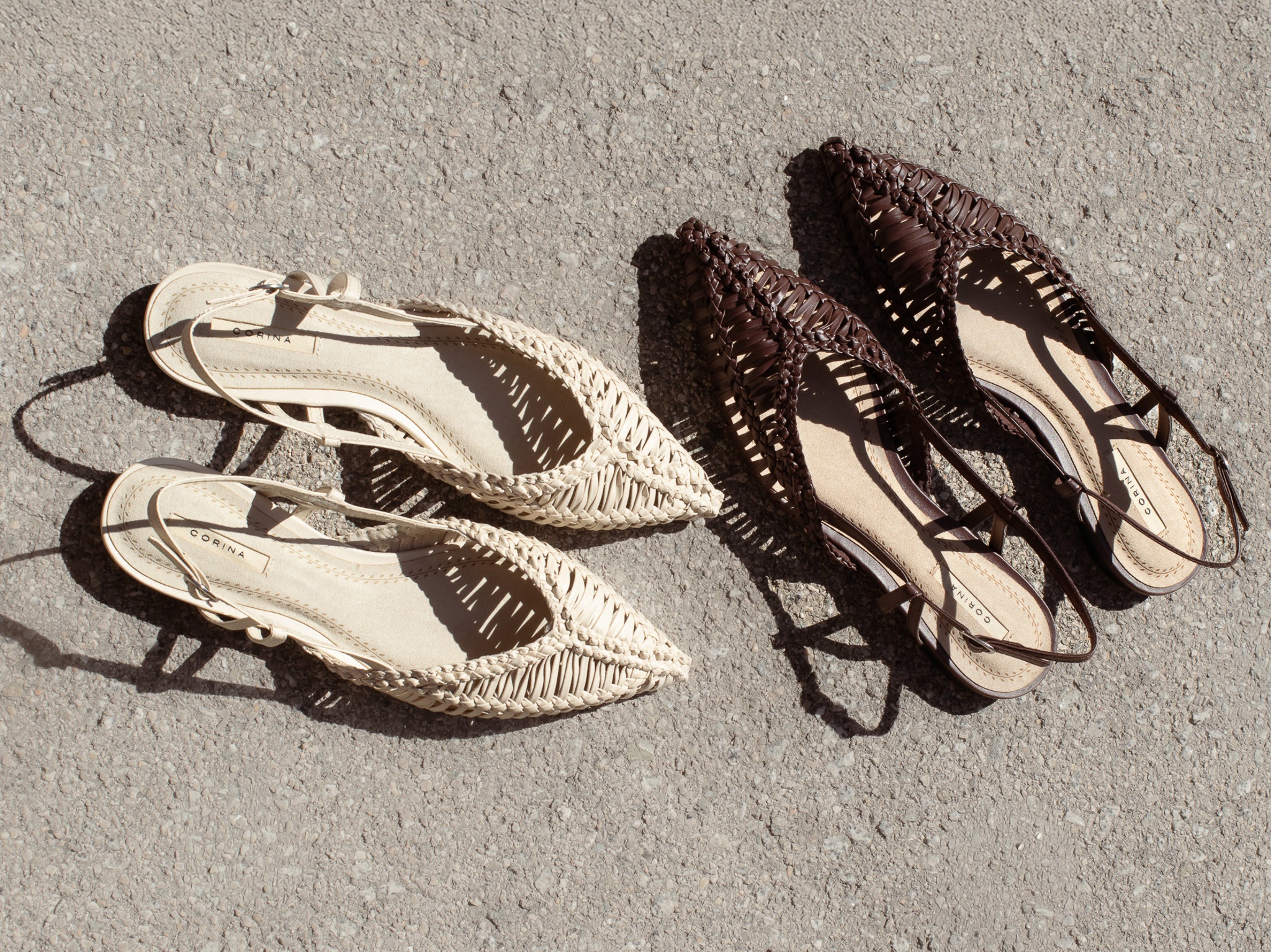 Sandalia plana Corina, corte trenzado. Acabado en punta. Cierre mediante hebilla en la parte exterior.