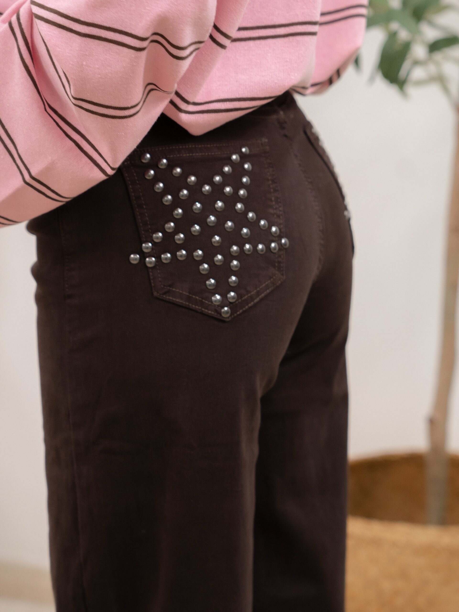 Jeans de tiro alto y cinco bolsillos. Pernera ancha. Detalle de táchelas en forma de estrella en bolsillos traseros.