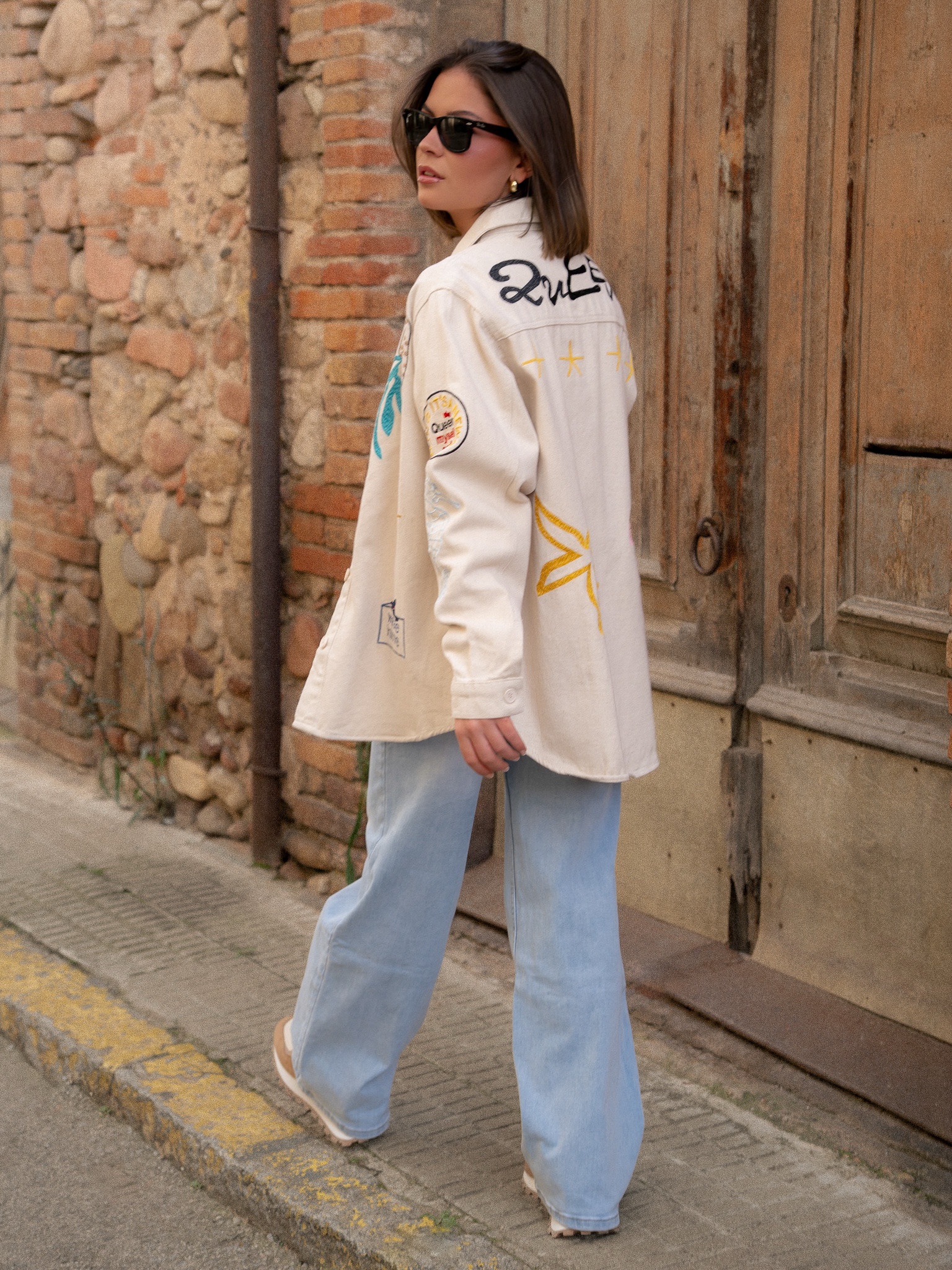 Jeans de todo bajo y pernera ancha con detalle de estrellas plata en bolsillos traseros. Cierre con cremallera y botón metálico.