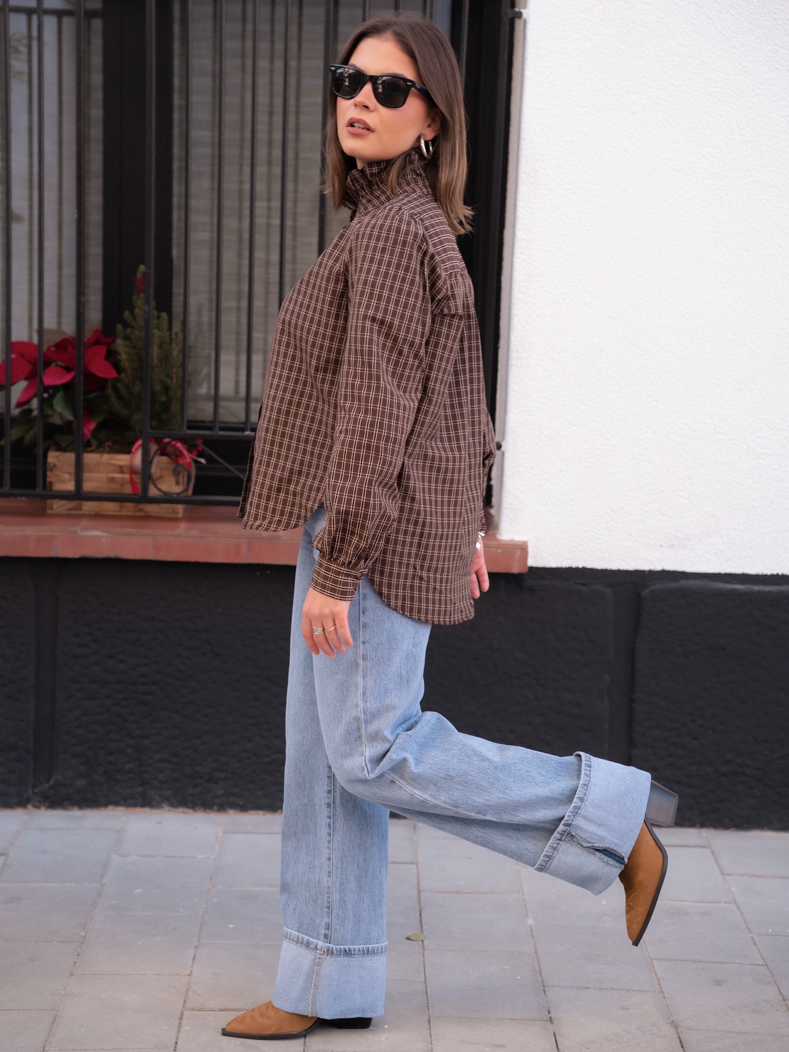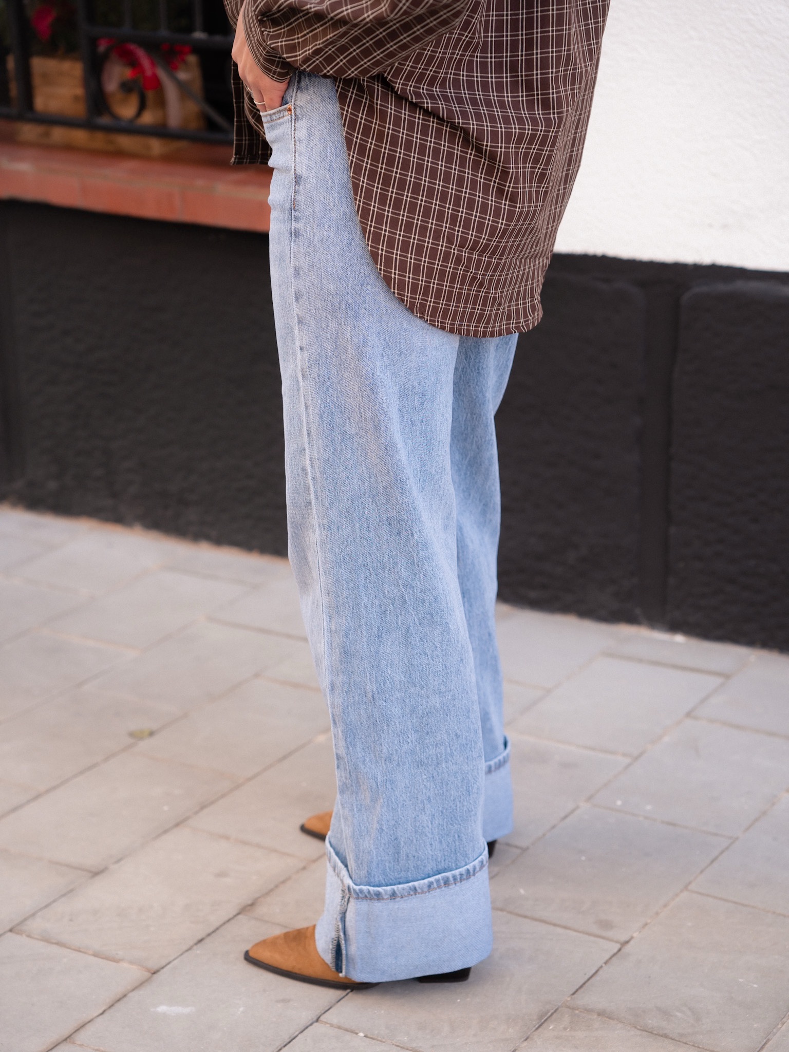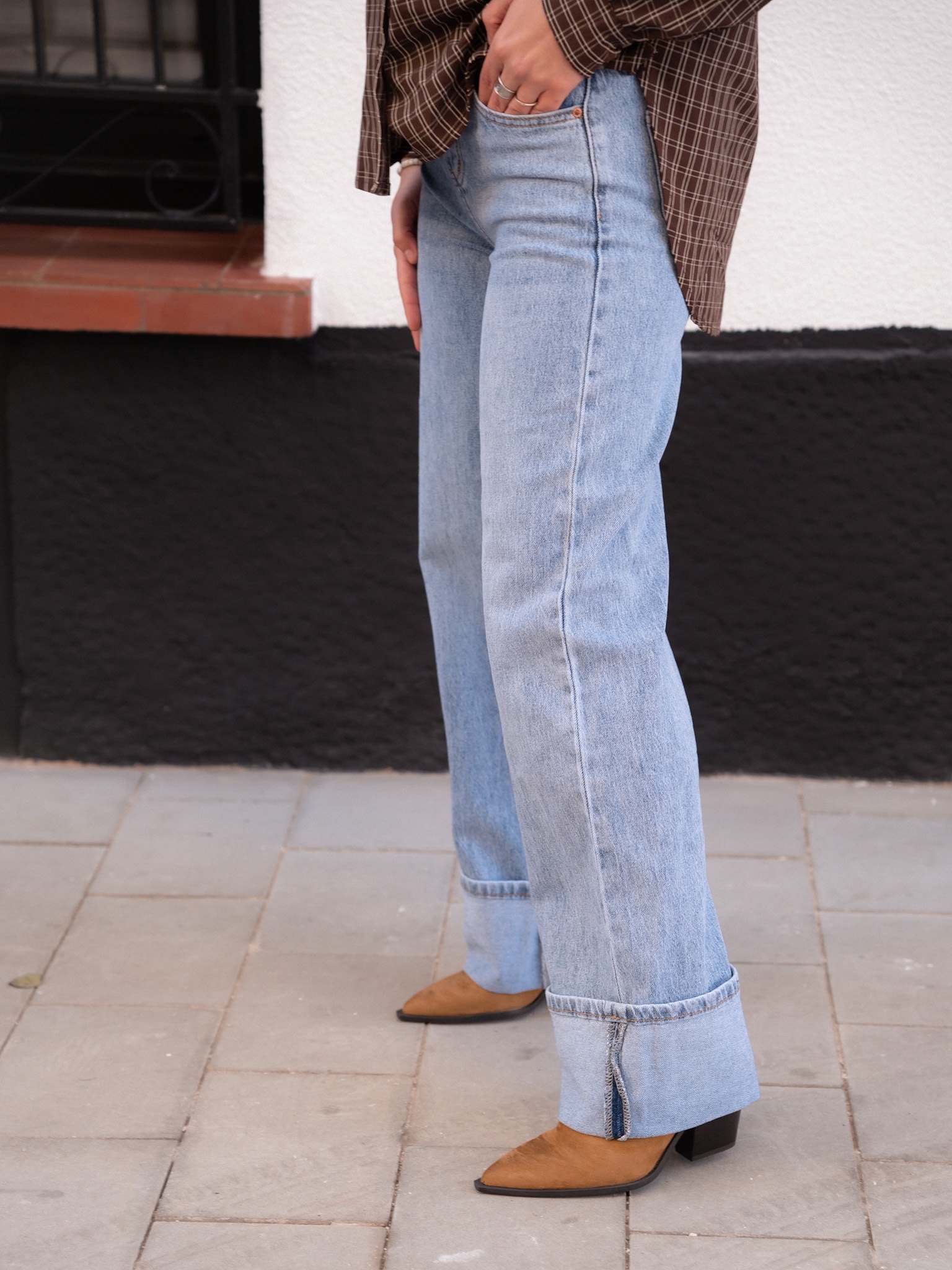 Jeans de tiro medio con cinco bolsillos. Pernera recta y larga acabada en vuelta. Cierre con cremallera y botón metálicos.