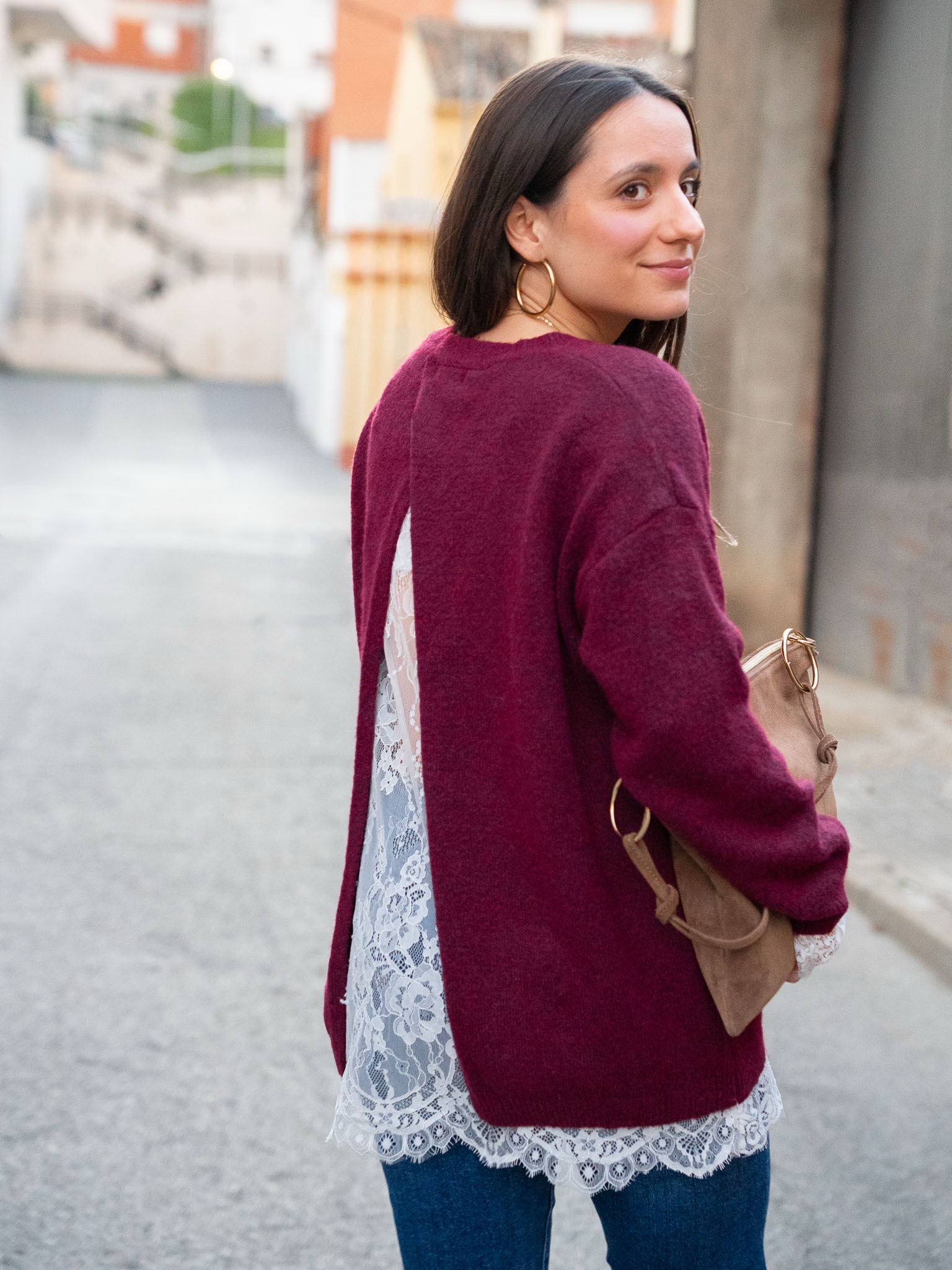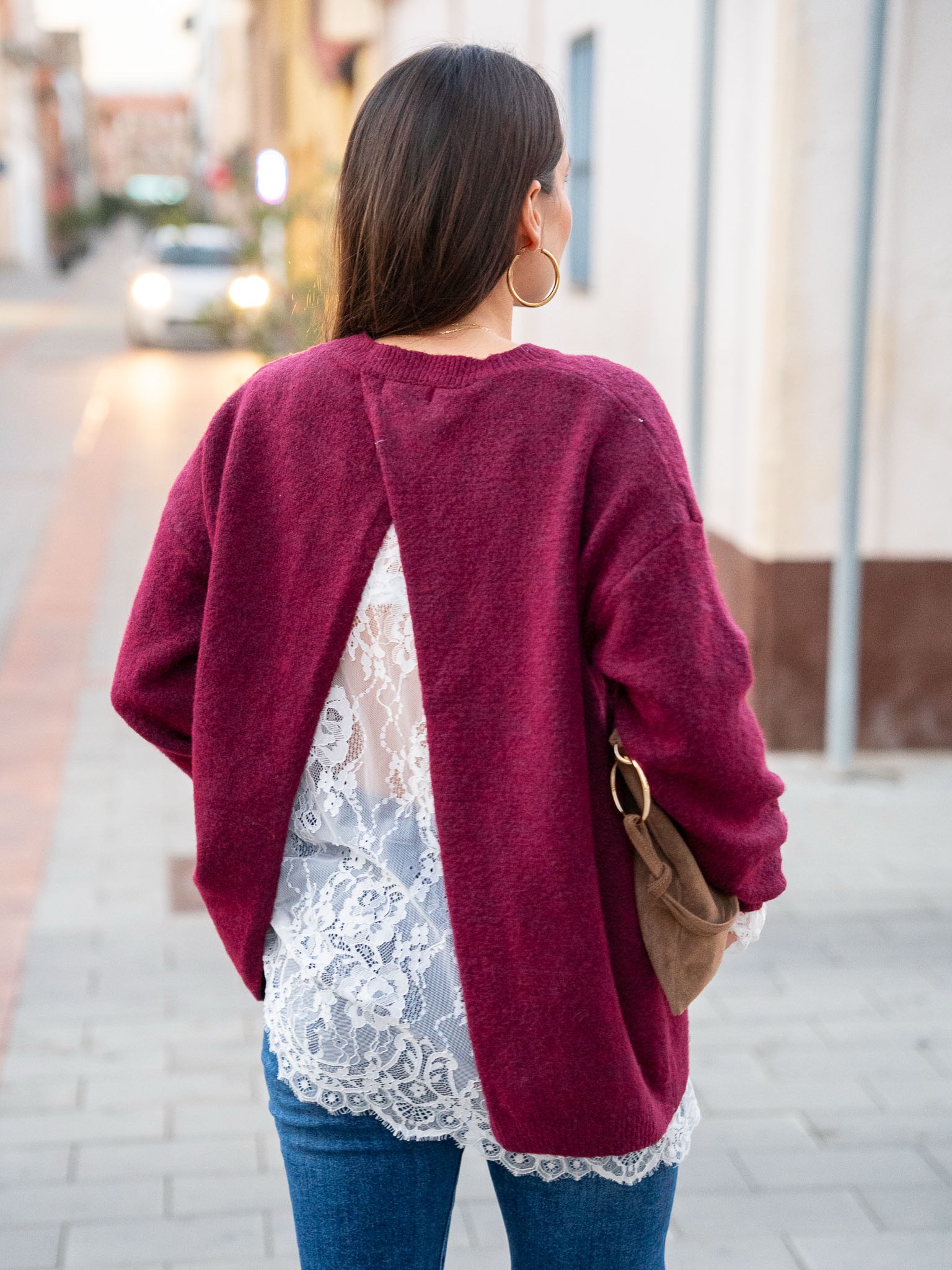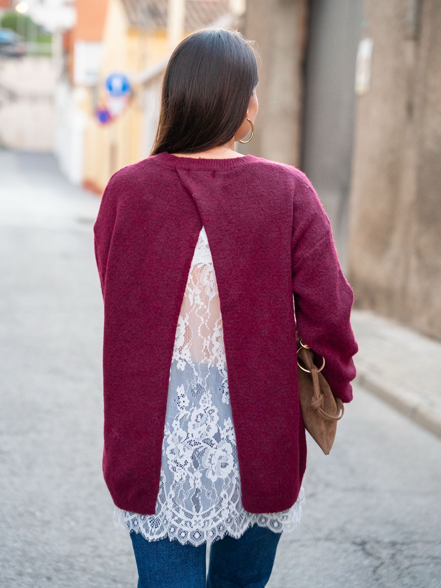 Jersey oversize con cuello redondo. Detalle de encaje en puños, bajo y espalda. Talla única, da desde la 36 a la 44.