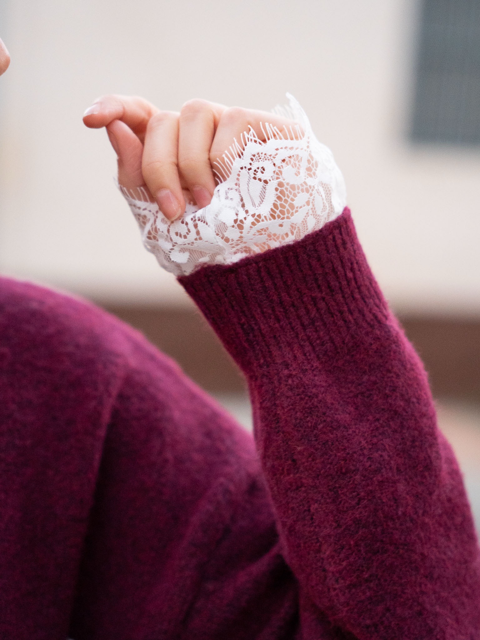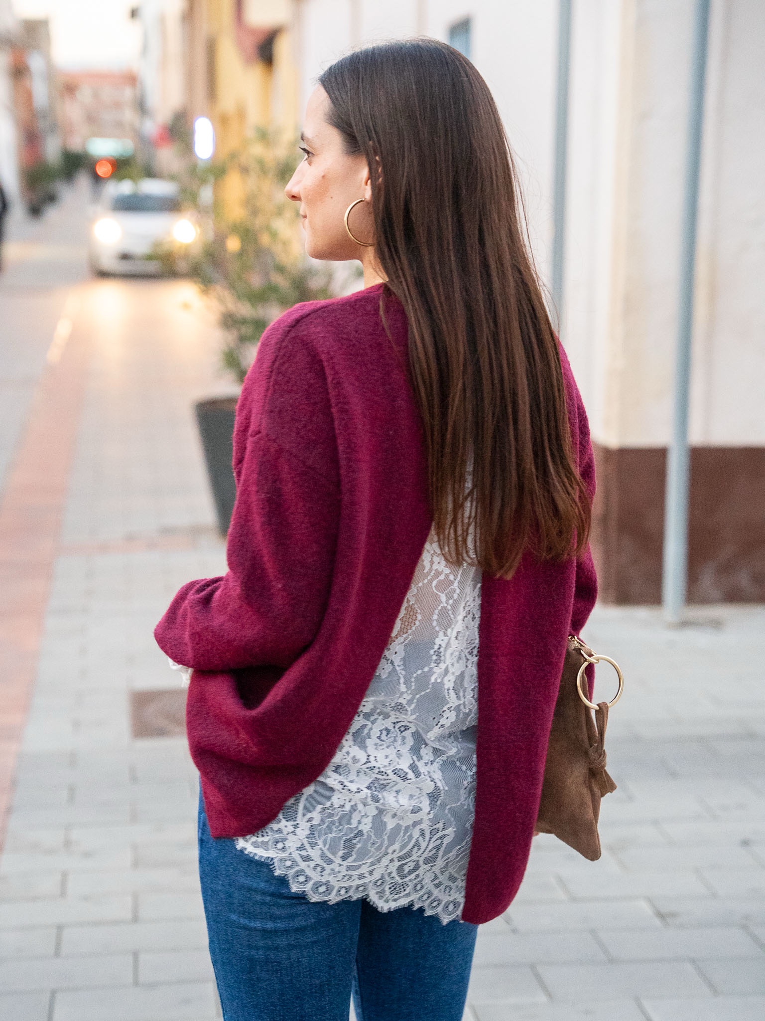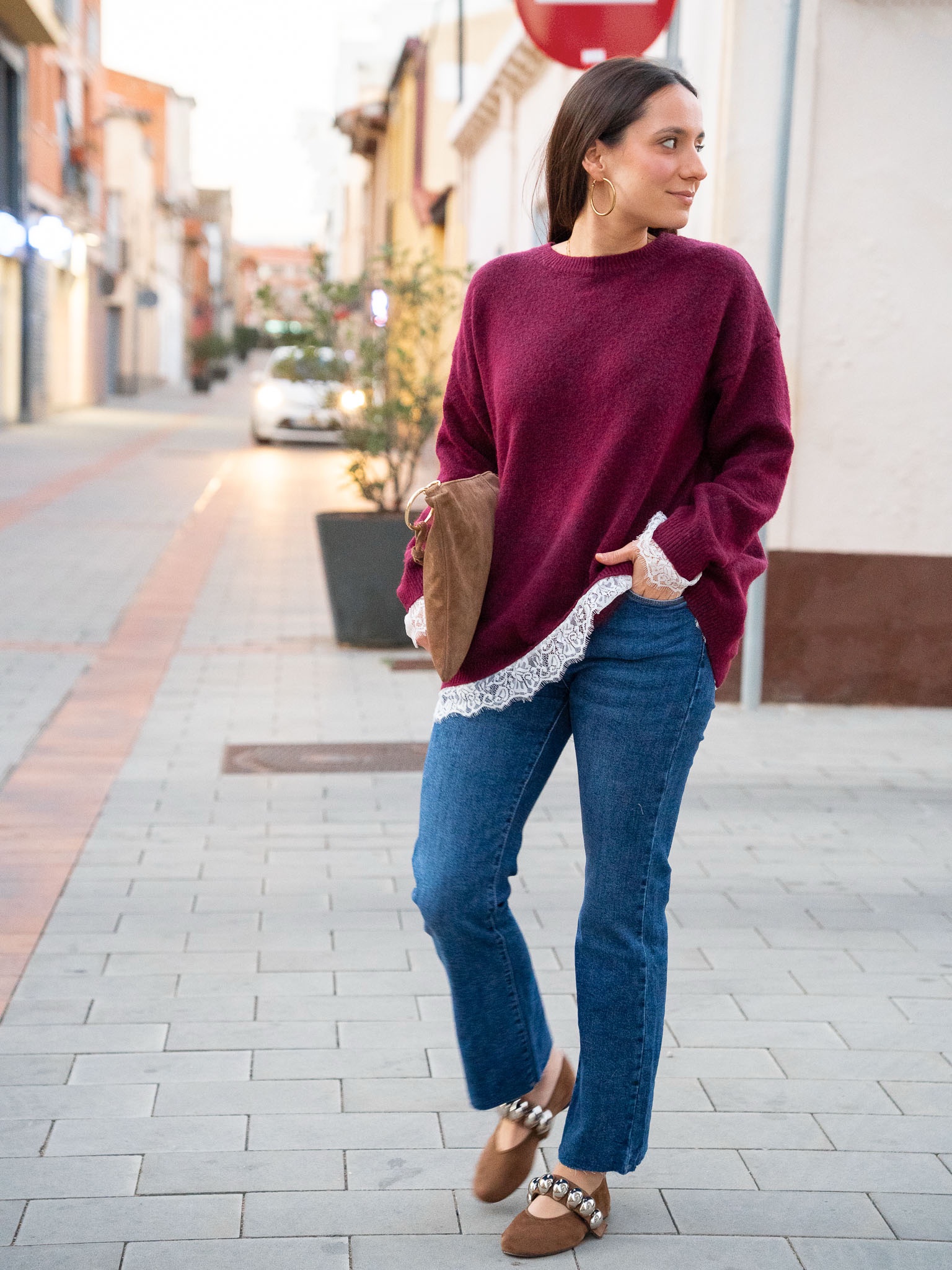 Jersey oversize con cuello redondo. Detalle de encaje en puños, bajo y espalda. Talla única, da desde la 36 a la 44.