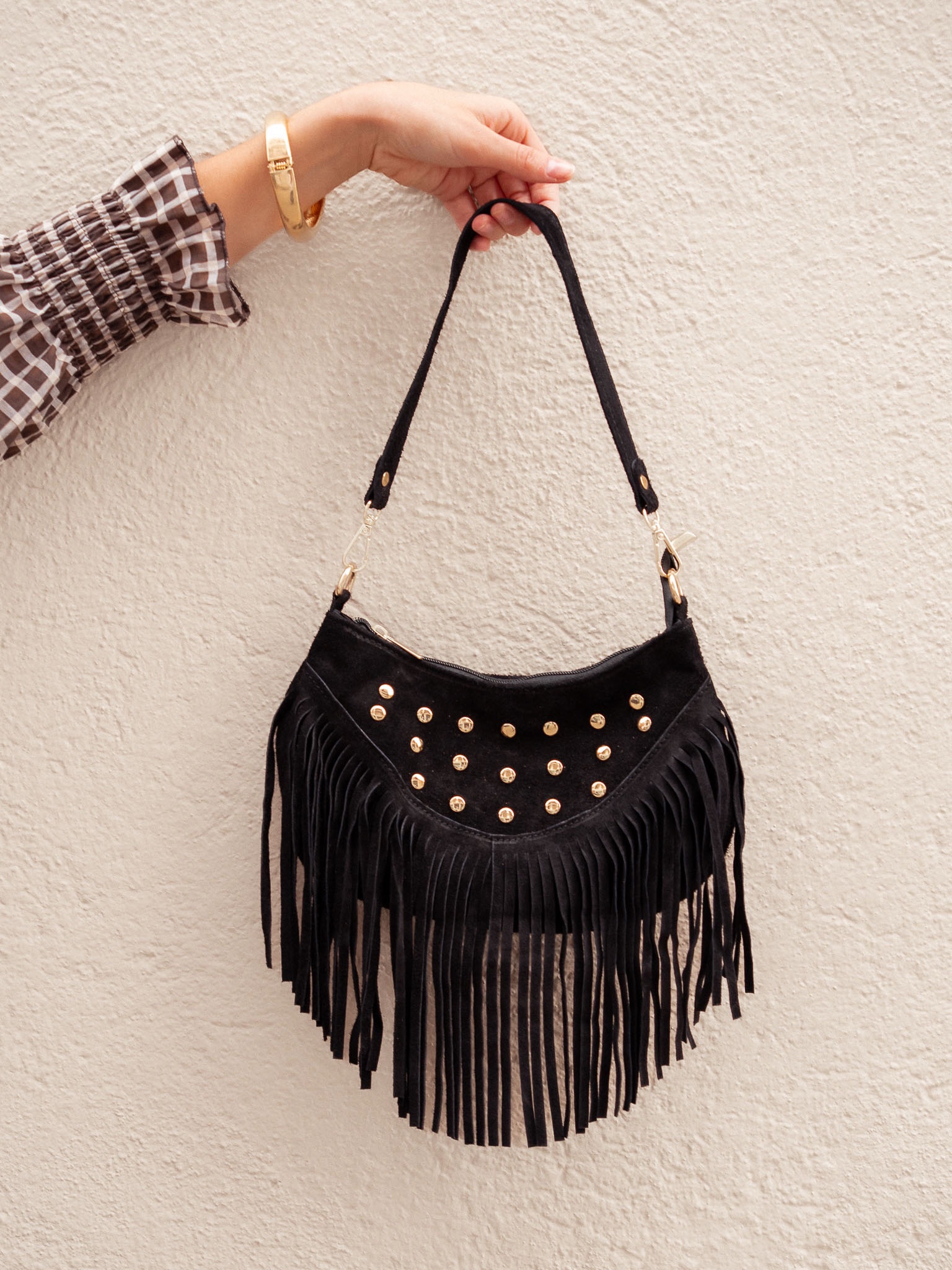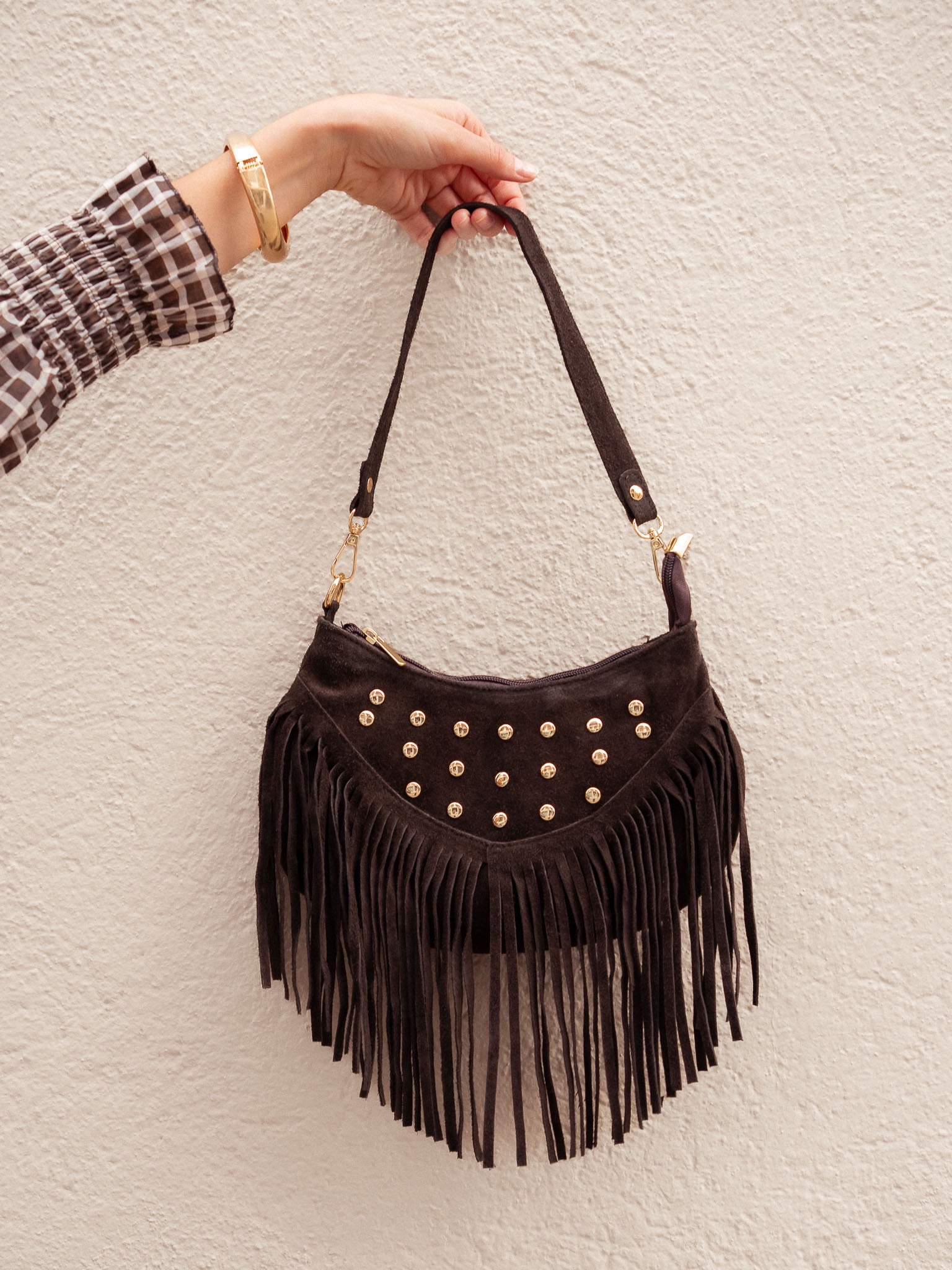 Bolso de piel con flecos y tachuelas. Tiene dos asas, una para colgar al hombro y otra para llevar en bandolera. Forro interior con bolsillo cierre con cremallera.
