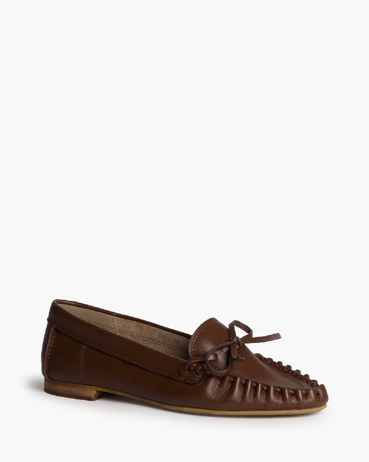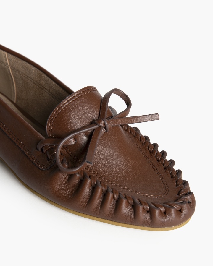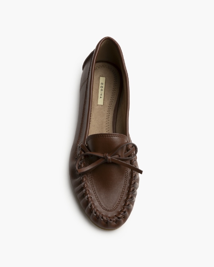Mocasín plano de la marca Corina. Detalle de pasado en la puntera. Lazo en la punta.