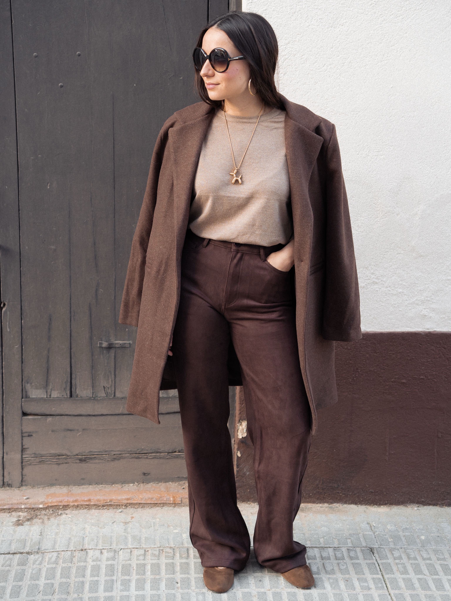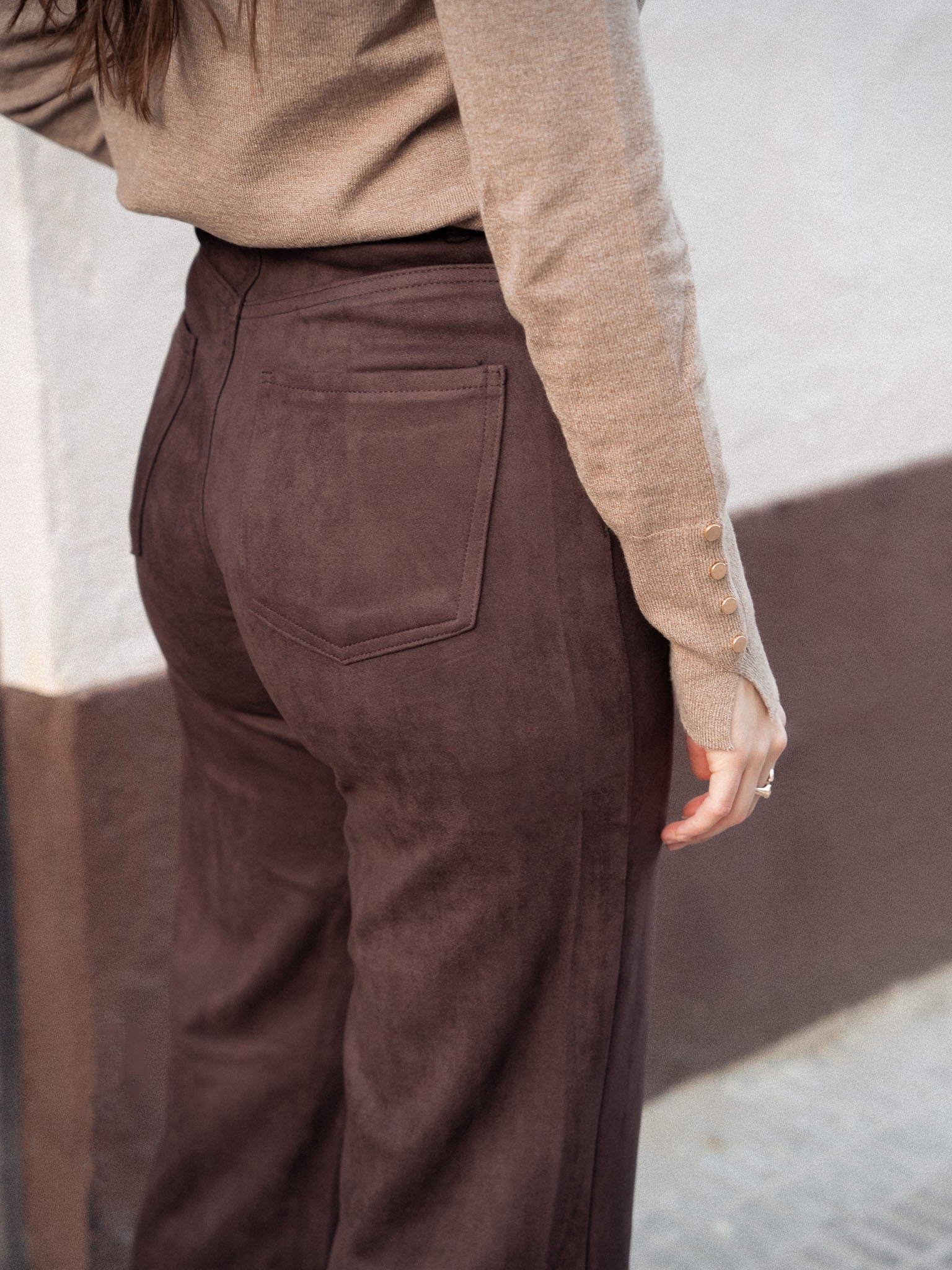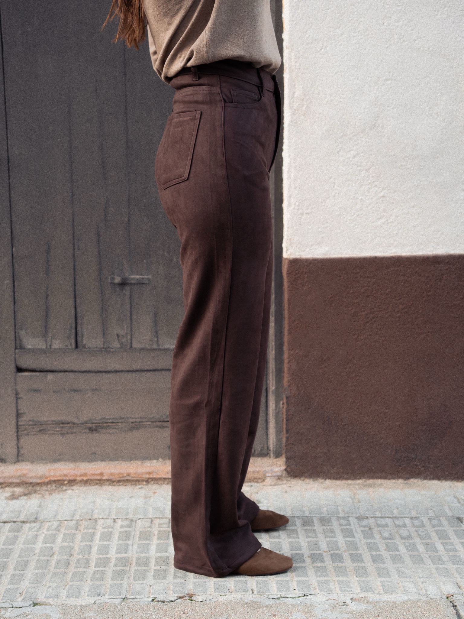 Pantalón 5 bolsillos de antelina tiro medio. Pernera recta. Cierre con cremallera y botón.