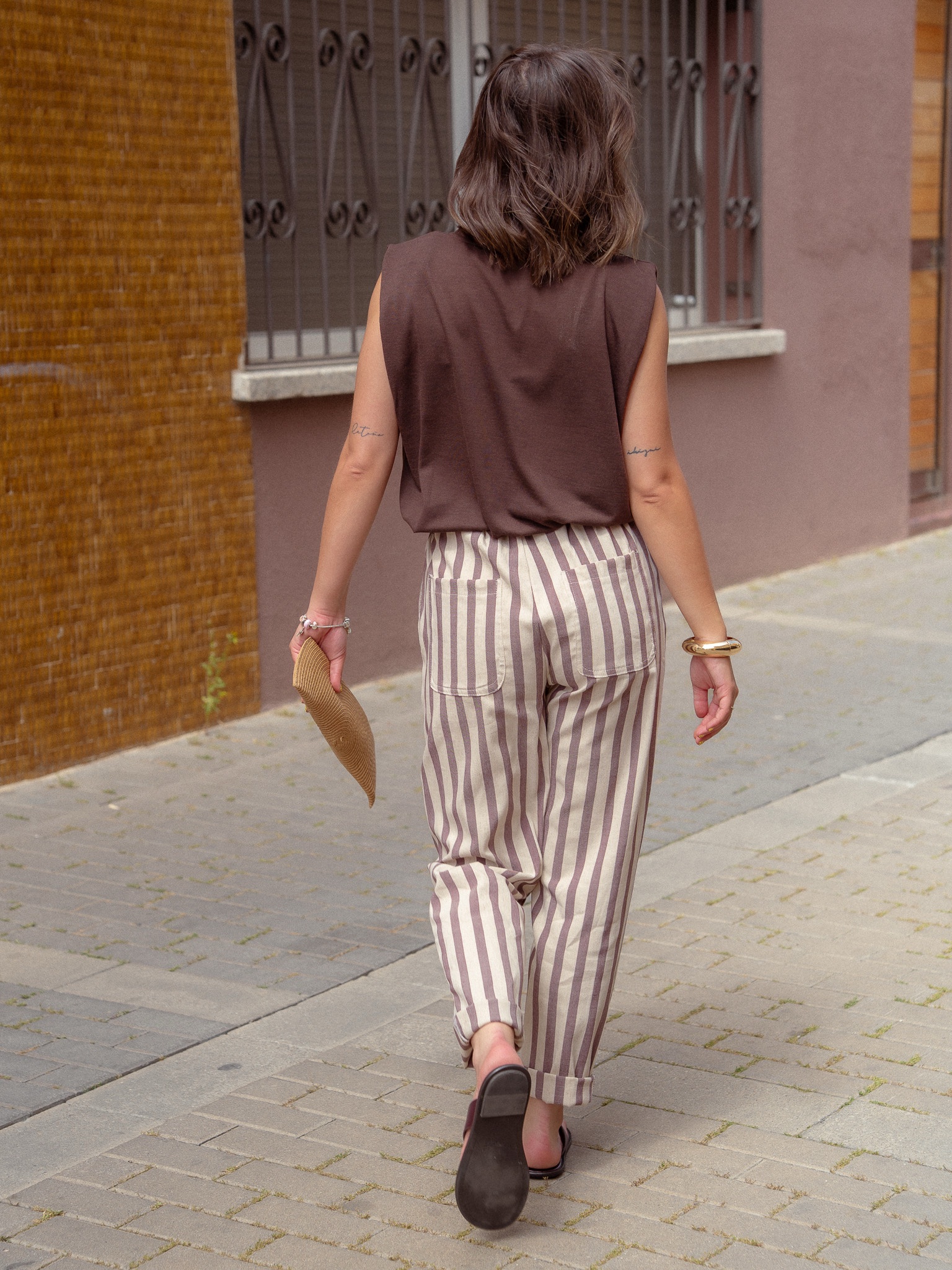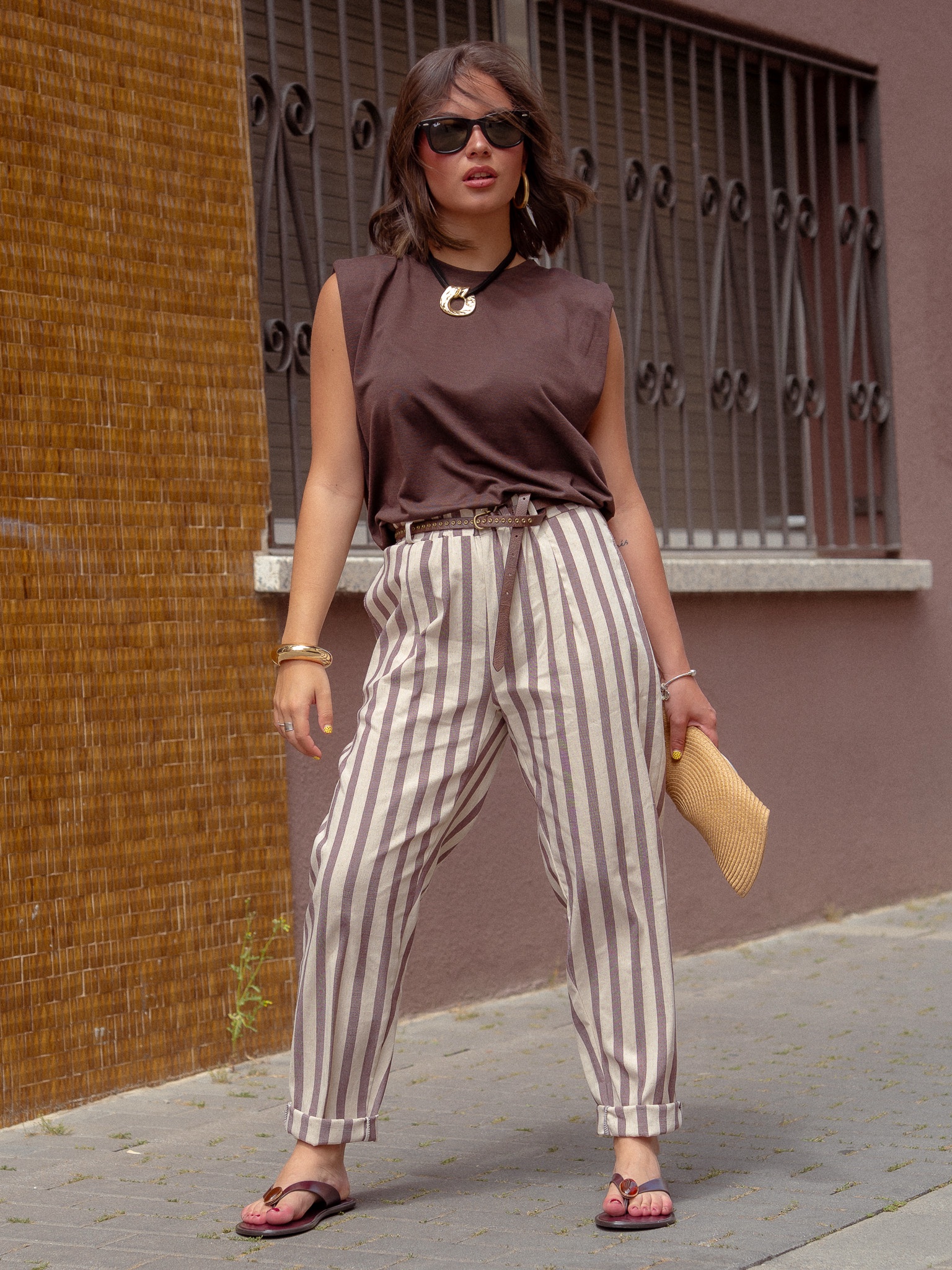 Pantalón tipo baggy con estampado de rayas verticales en marrón. Cintura elástica y bolsillos laterales. Talla única, da desde la talla 36 hasta la talla 42. Incluye cinturón.