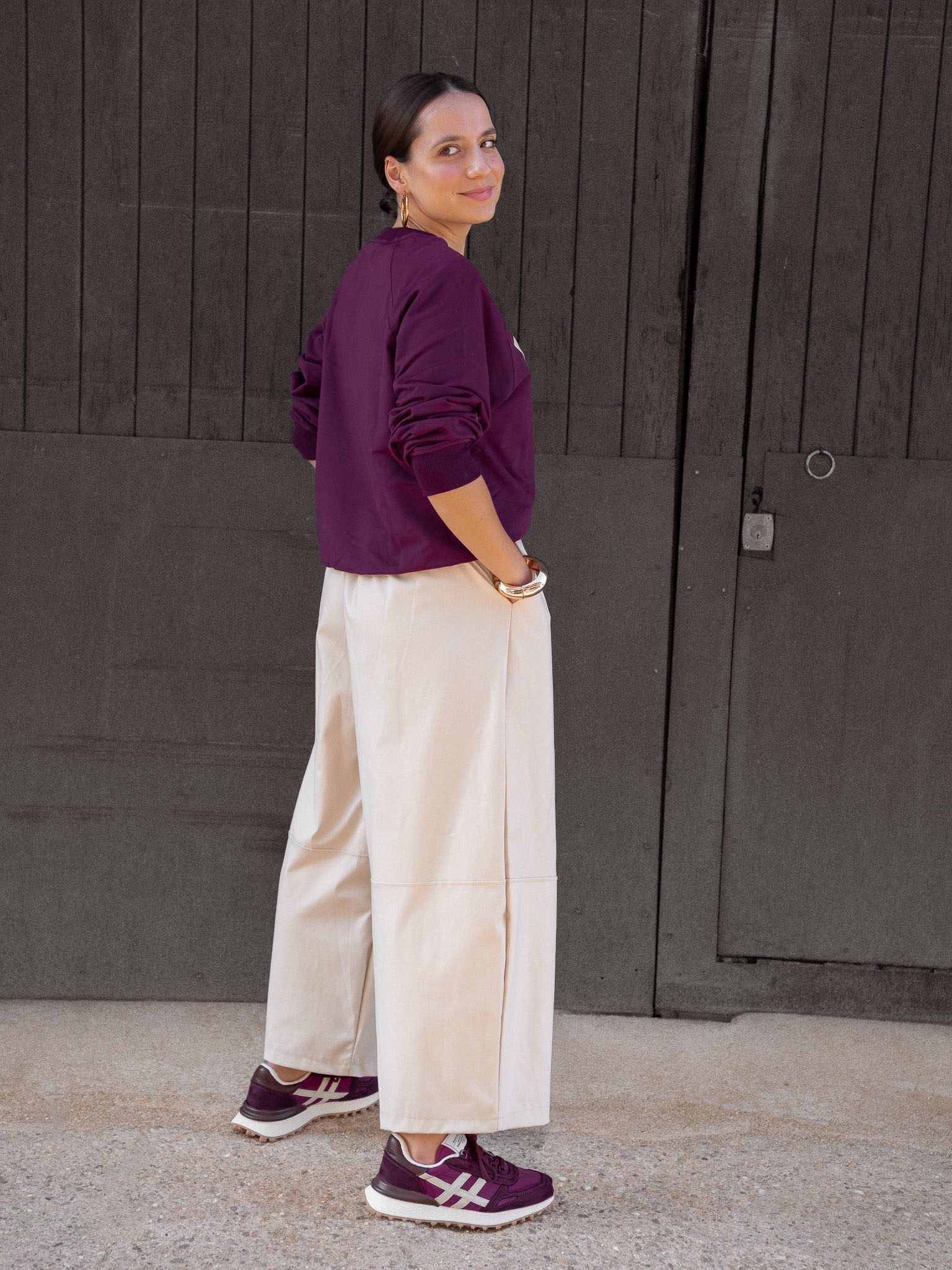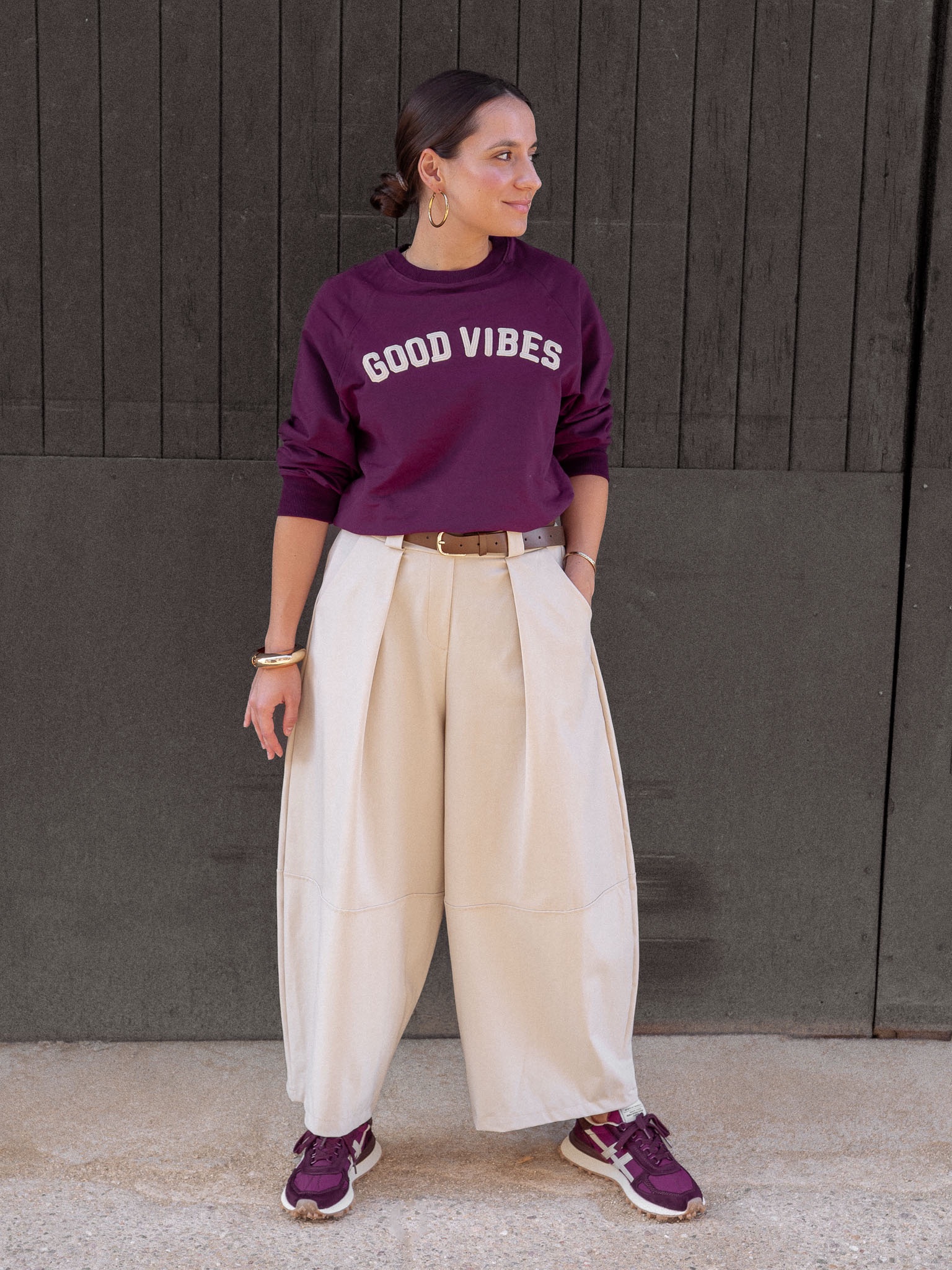 Pantalón ancho tobillero. Pinzas delanteras. Bolsillos laterales. Cierre con cremallera y botón. Viene con el cinturón.