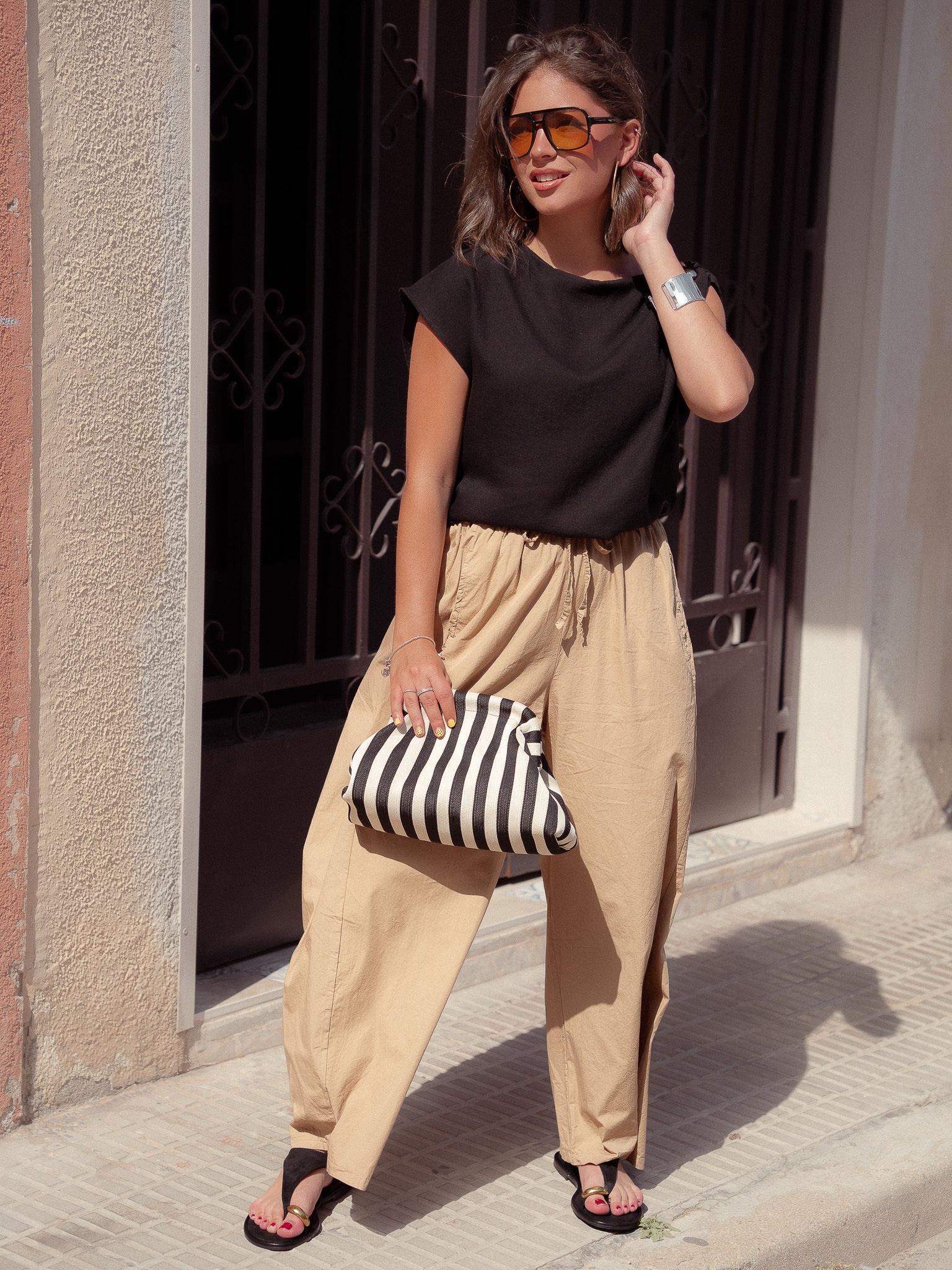 Pantalón fino tipo barrel. Talla única, vale desde la 36 a la 42. Cintura elástica. Bolsillos laterales.