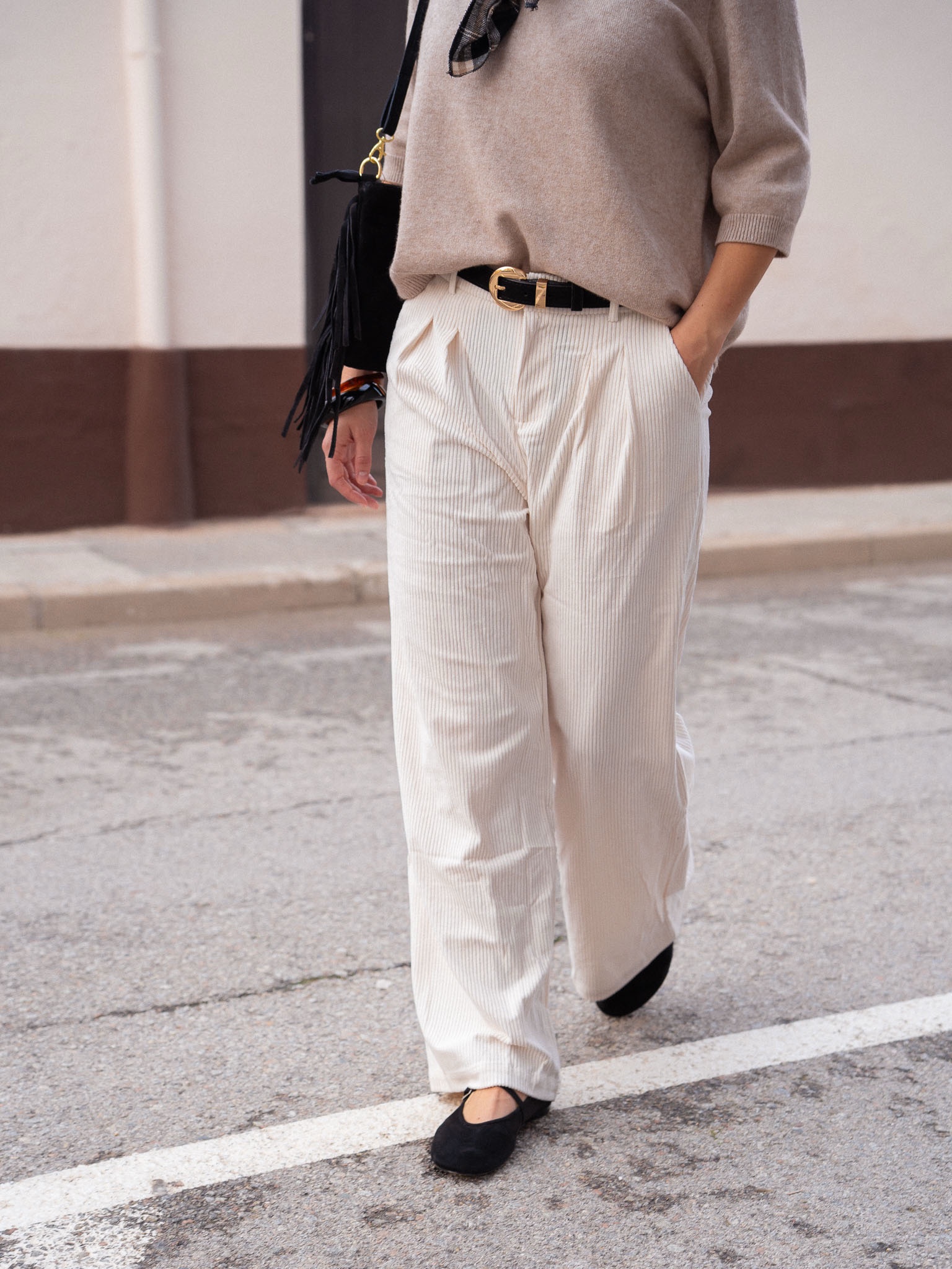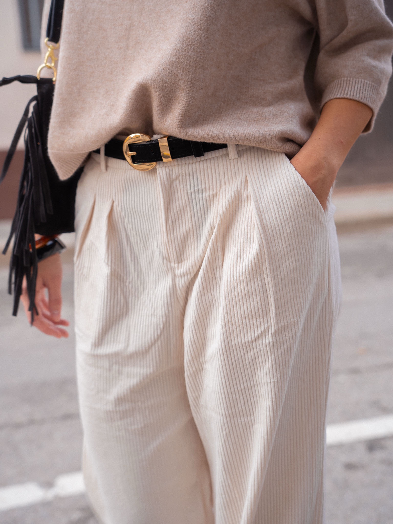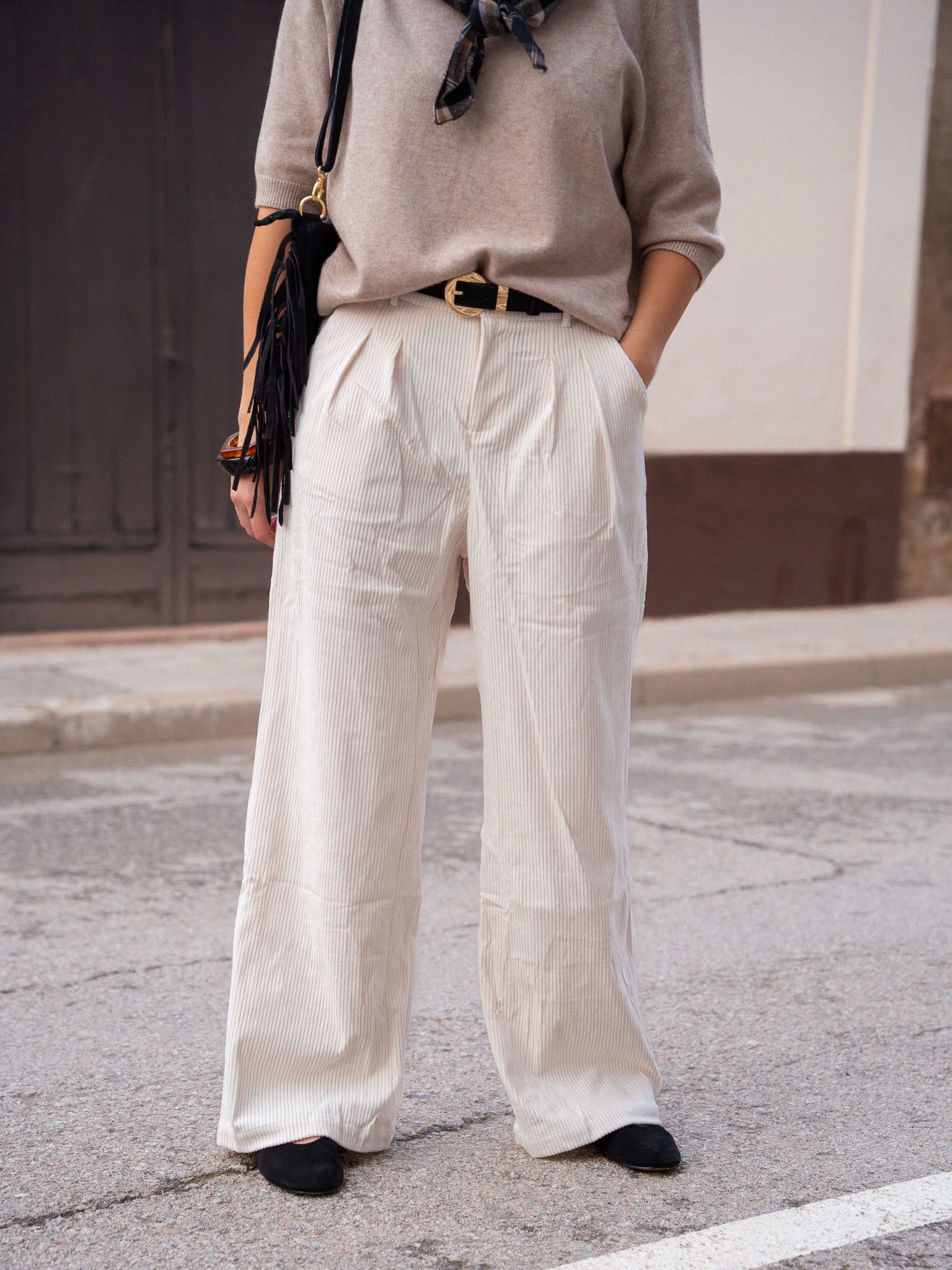 Pantalón de pana de pierna ancha. Cierre con cremallera y botón.