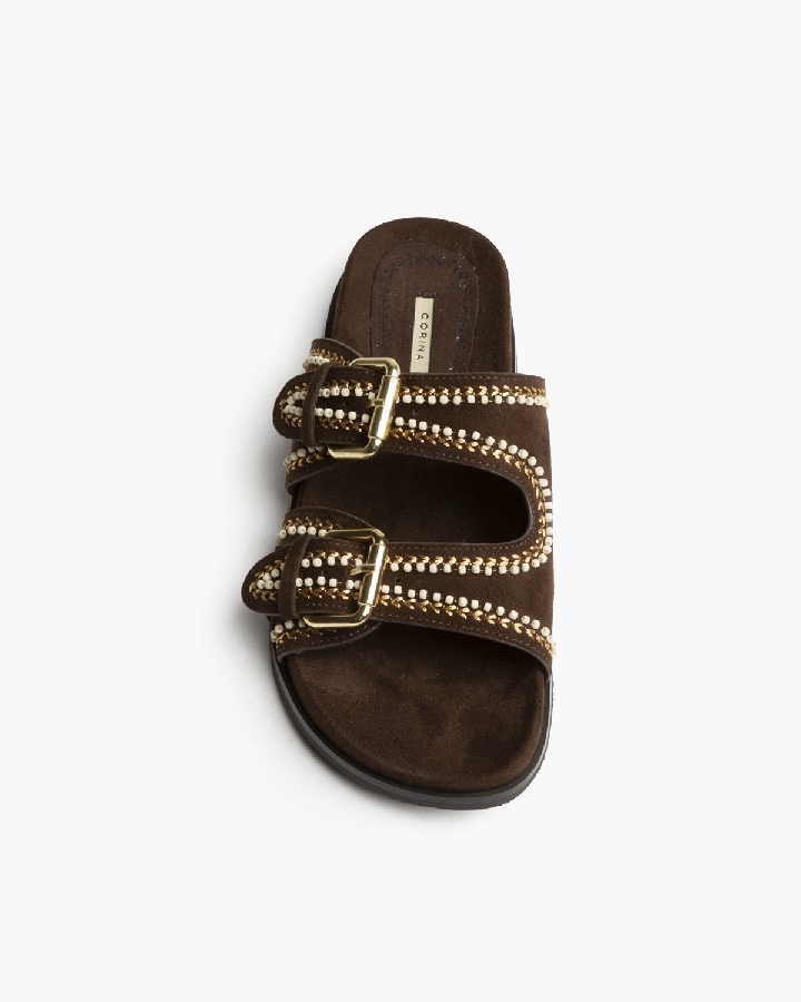 Sandalia plana, corte de tiras anchas con detalle de hebillas, bordados y abalorios. Plantilla ergonómica.