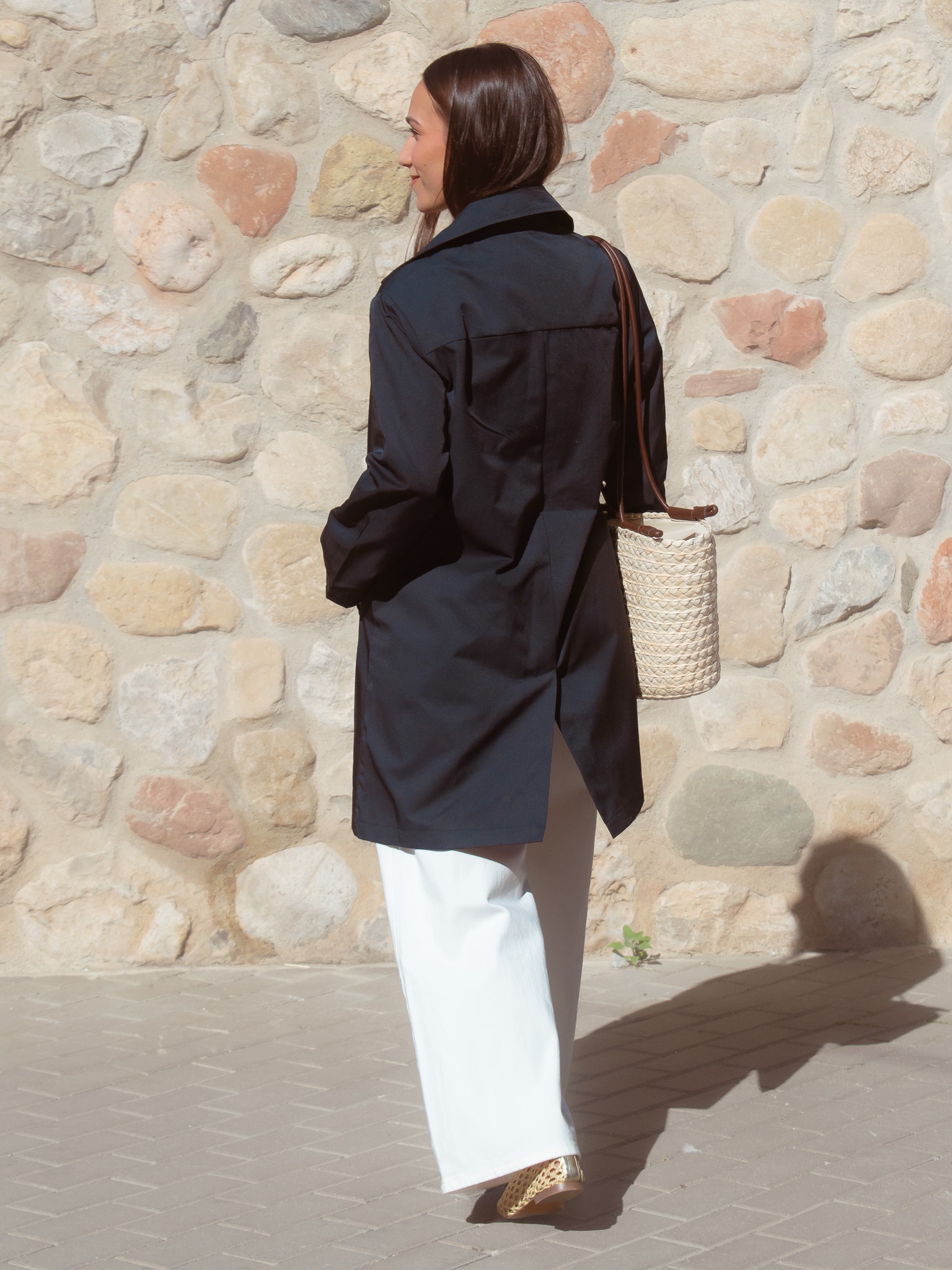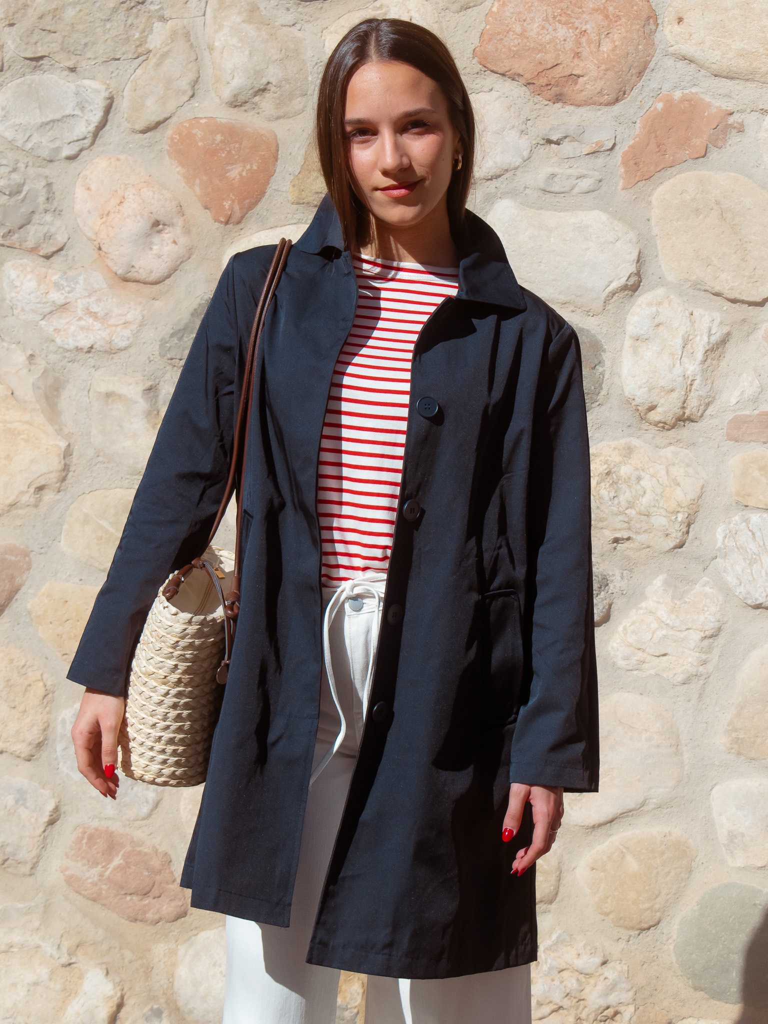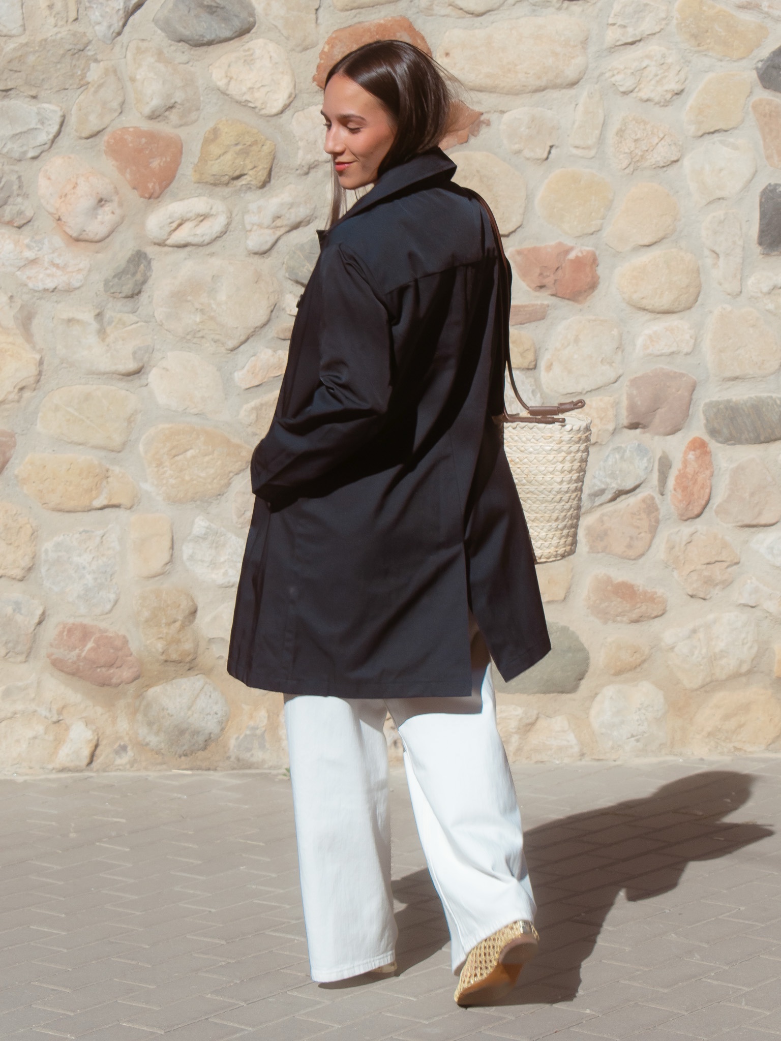 Gabardina 3/4 en azul marino. Cuello camisero. Bolsillos laterales. Cierre frontal con botones.