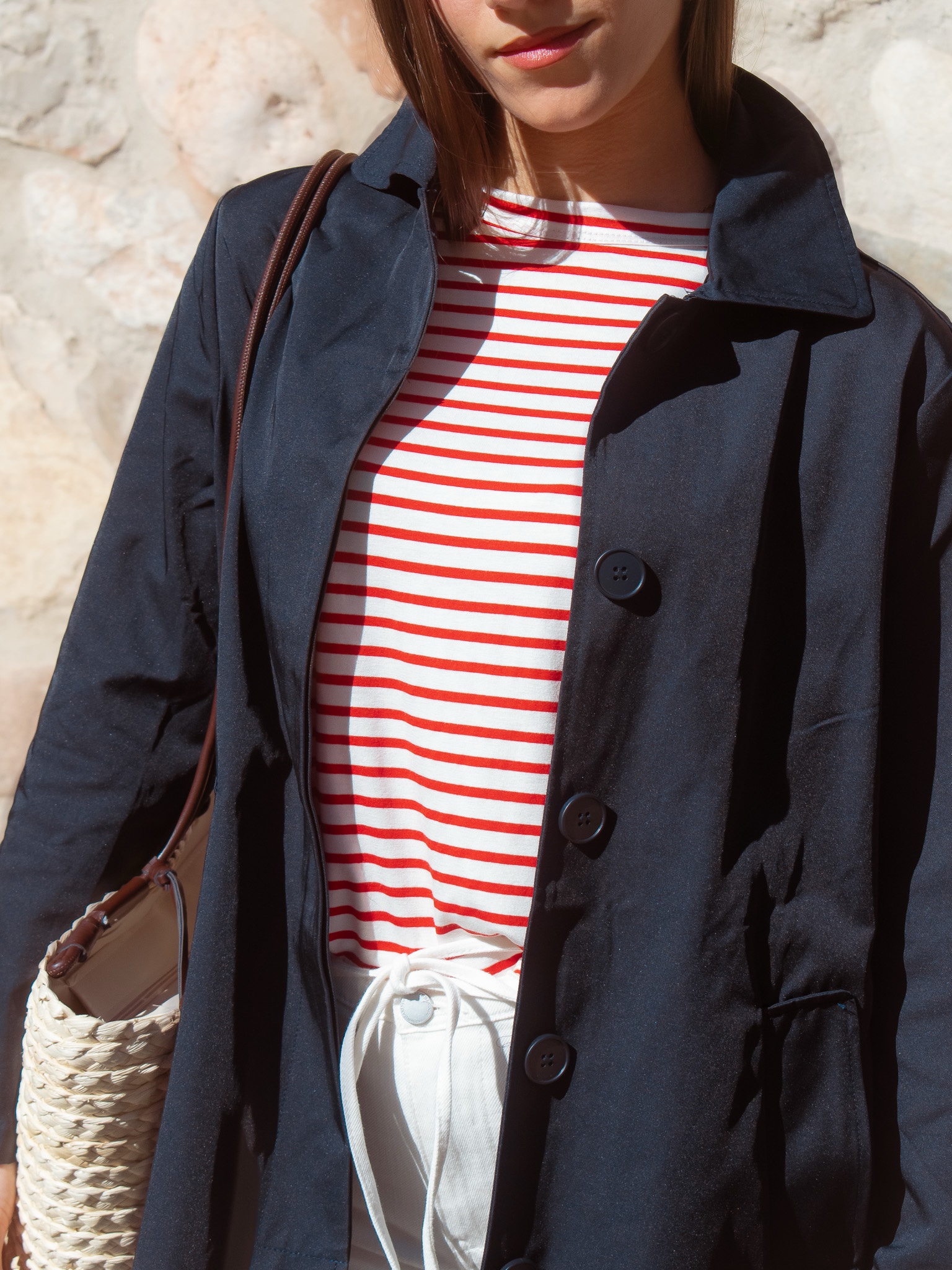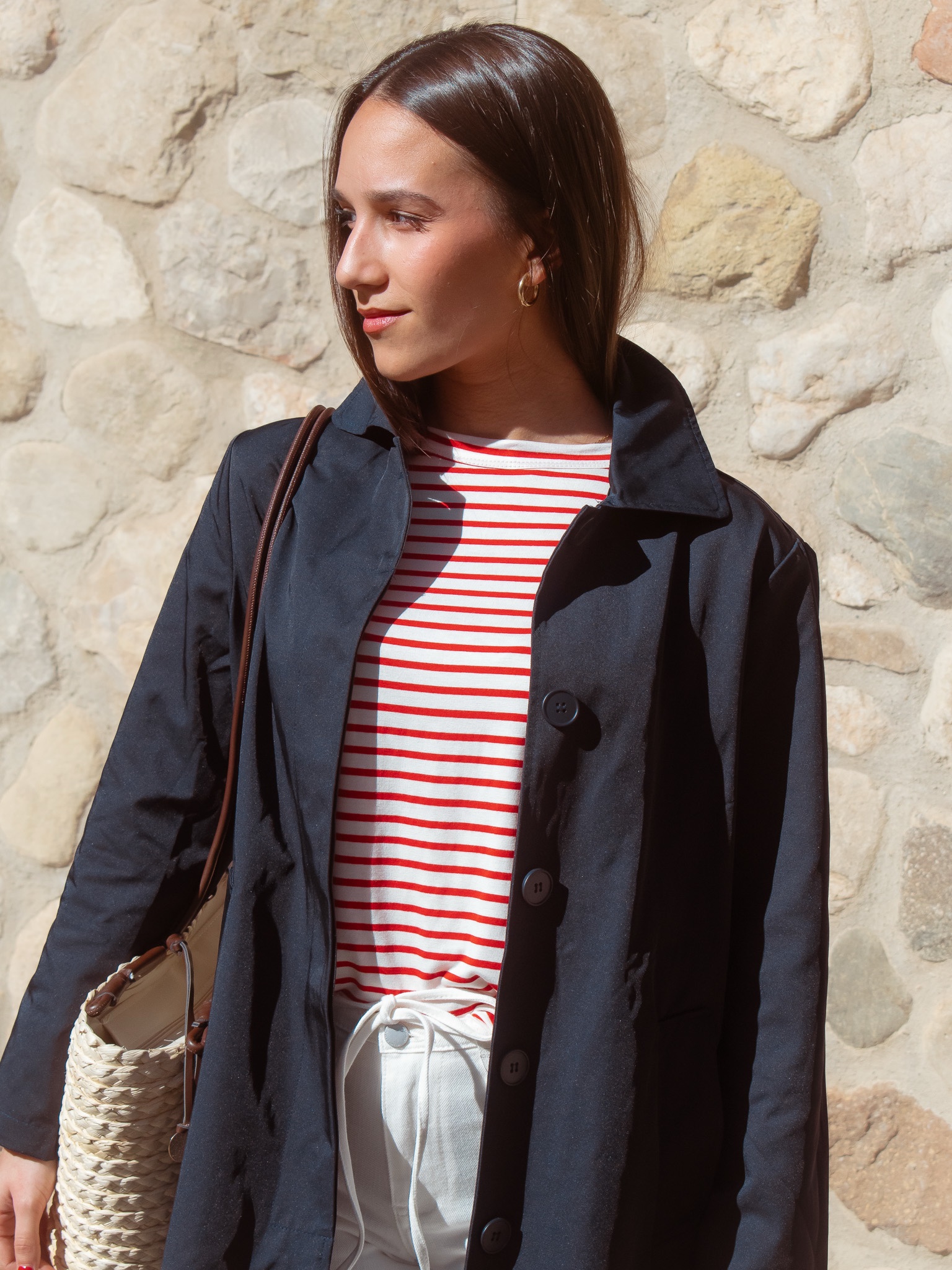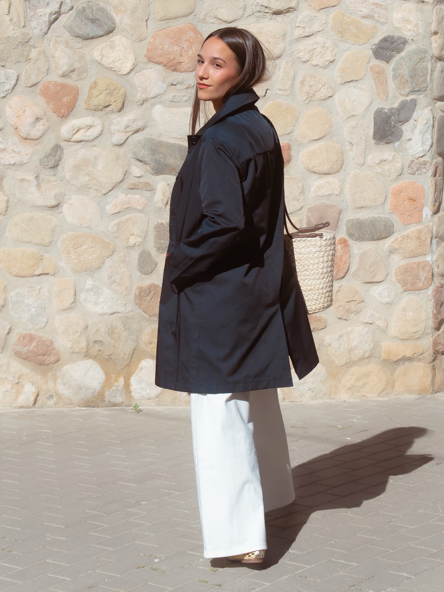 Gabardina 3/4 en azul marino. Cuello camisero. Bolsillos laterales. Cierre frontal con botones.