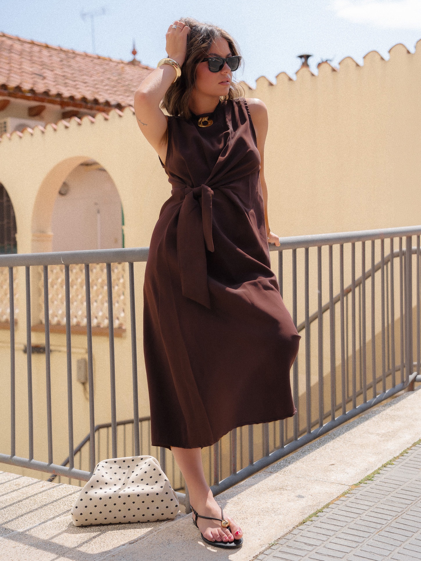 Vestido largo con rayas verticales. Manga sisa con detalle de volante. Pecho elástico.